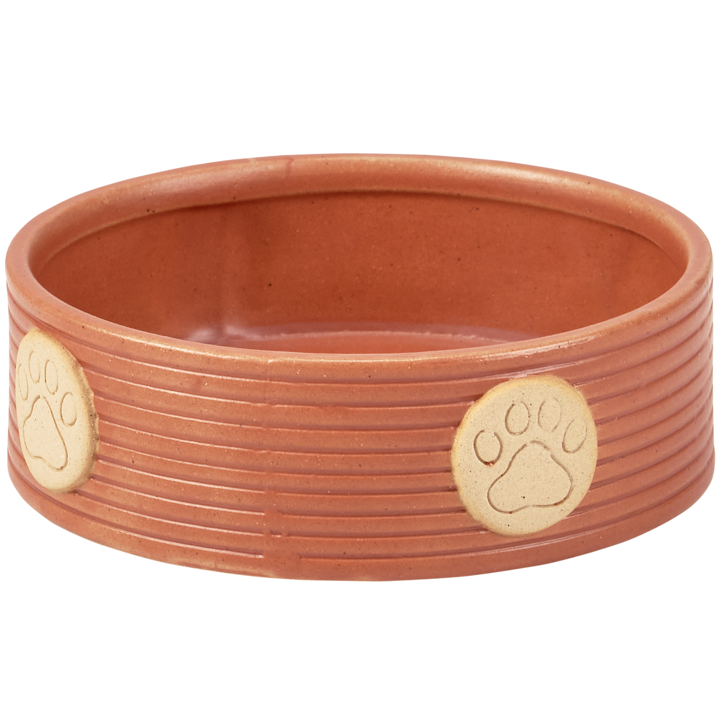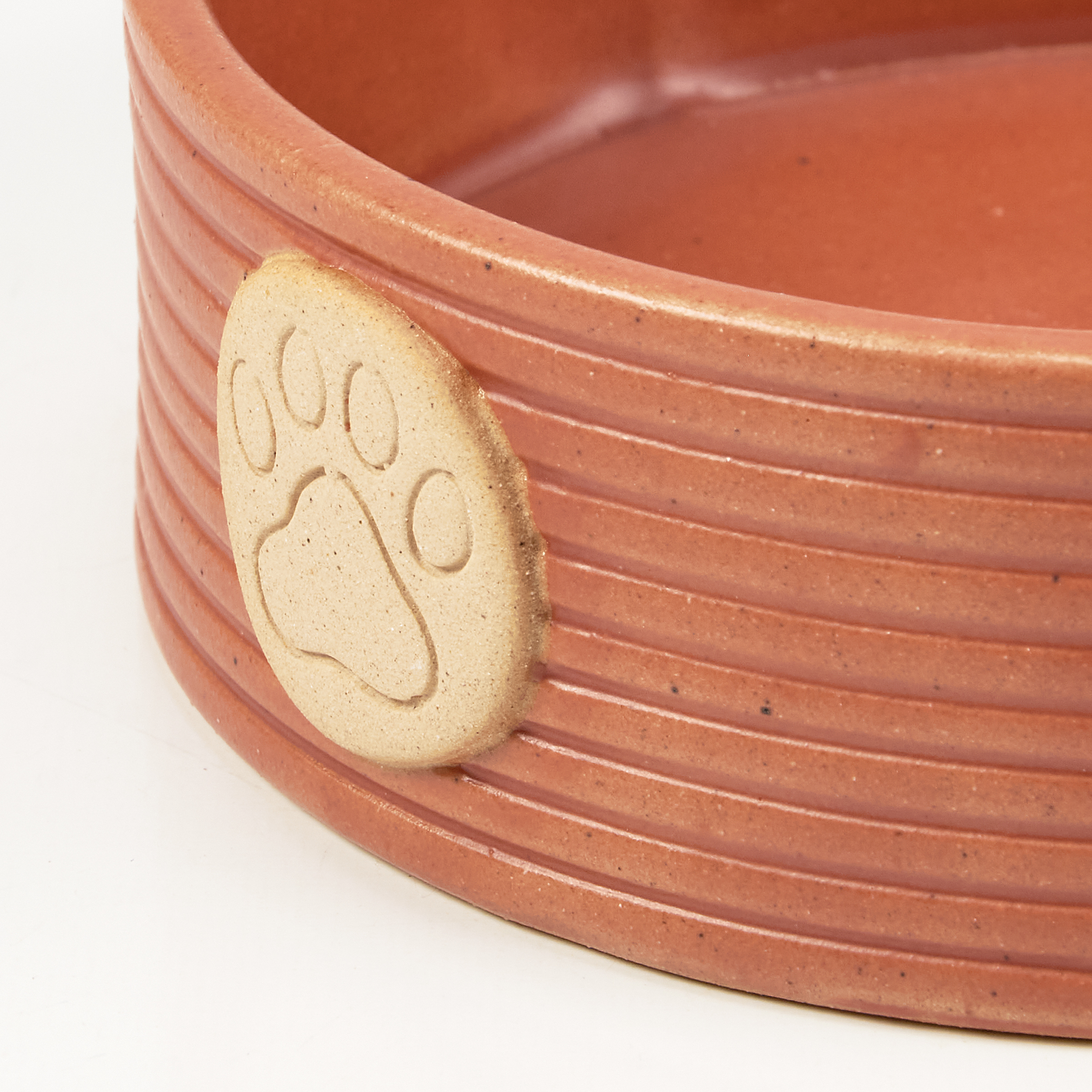 A small stoneware pet bowl from our Pet Collection displaying an orange glaze finish with embossed paw print designs around the side. Pet bowl features bare ceramic accents on the paw print designs for a handmade style. Our Paw Print pet bowl is conveniently dishwasher safe for easy cleaning. A stylish pet accessory perfect for everyday use.