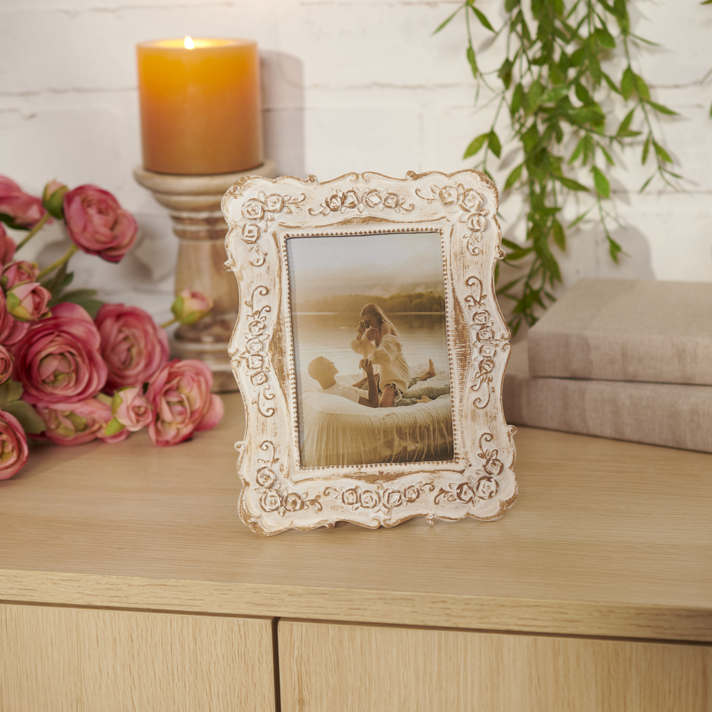 A decorative photo frame from our Vintage Collection displaying cream color natural wood with sculpted floral designs along the frame accented with an antique finish. Frame fits a 5 inch by 7 inch photo and can easily be replaced via clips on back. Our Antique photo frame is easy to display using easel back to free-stand. A vintage style frame perfect for displaying favorite memories as everyday home décor.