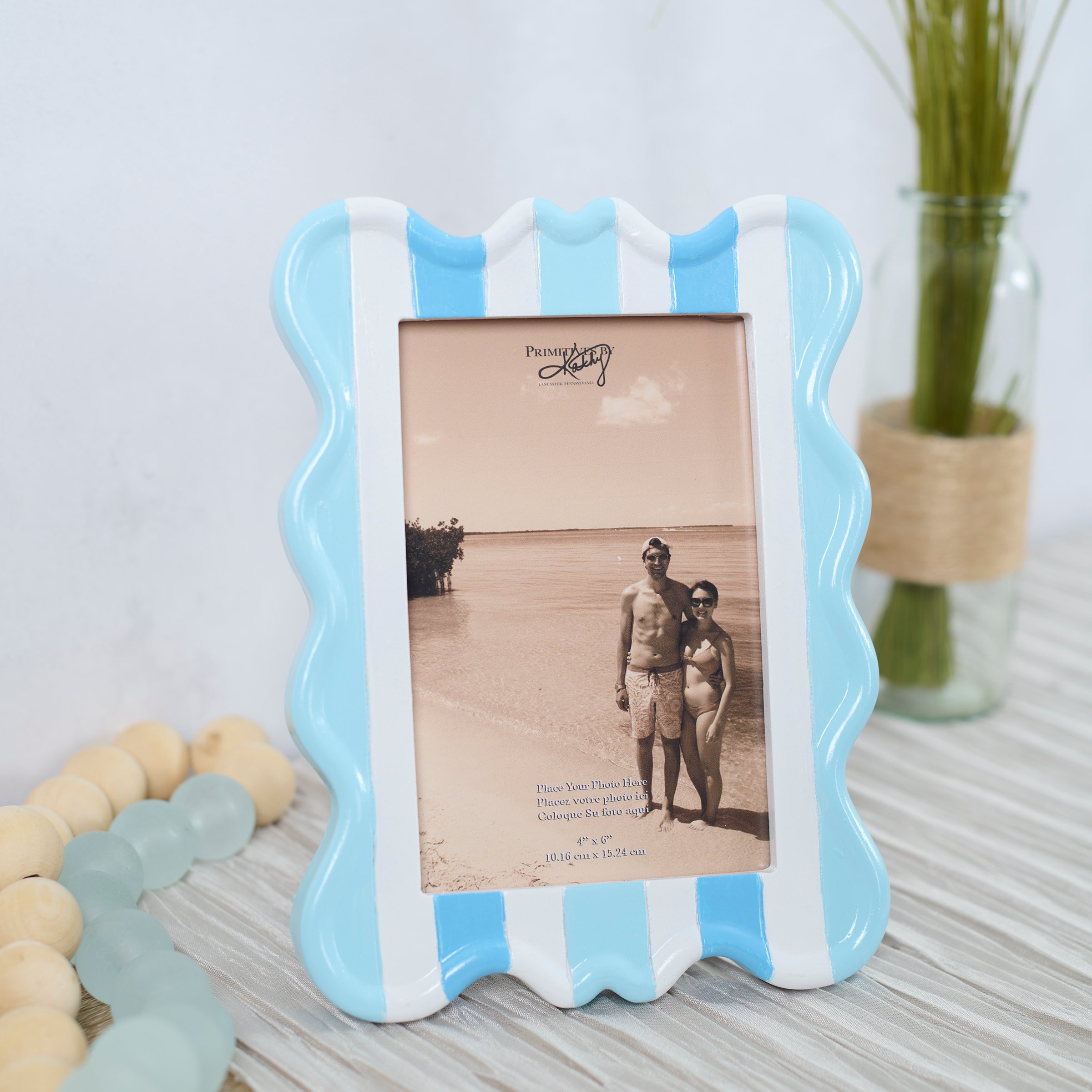 A photo frame from our Beach Collection displaying a blue ocean wave inspired stripe design with dimensional details. Beach photo frame fits a 4 inch by 6 inch photo that can easily be replaced via clips on back. Our Blue Wave photo frame is easy to display using easel back to free-stand. A stylish photo frame perfect for displaying favorite memories as beach themed home décor.