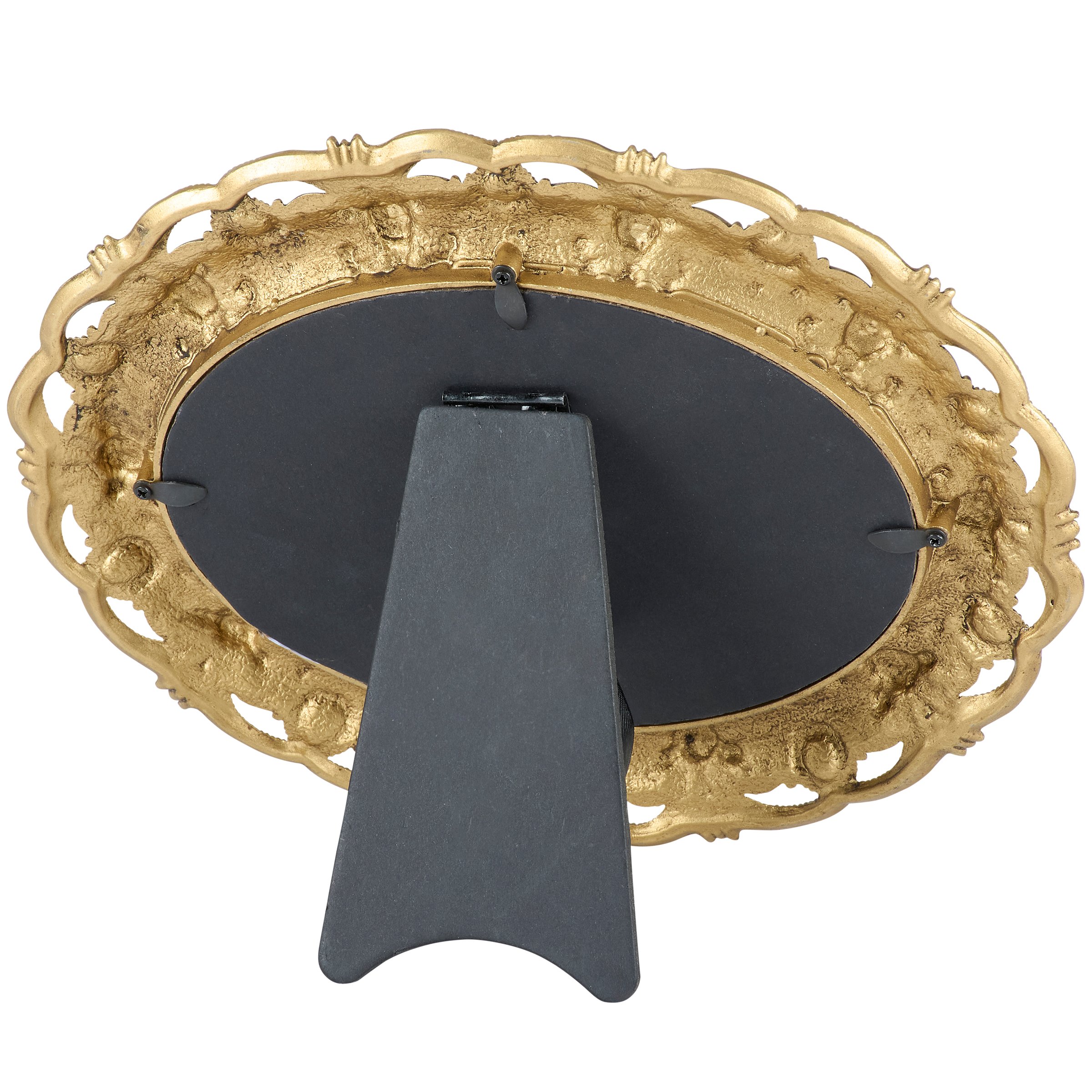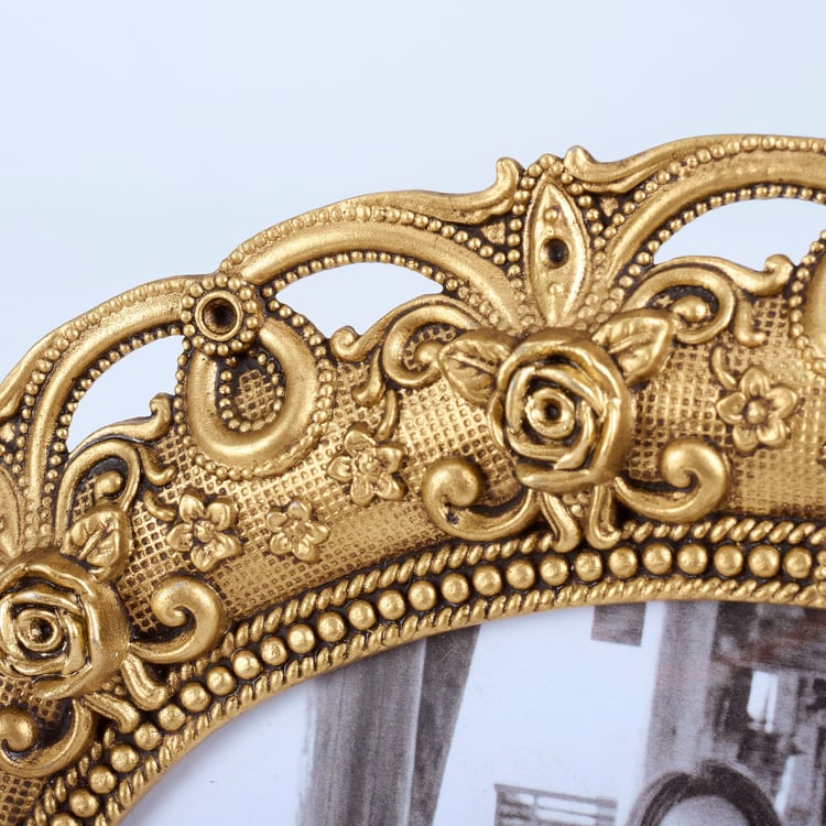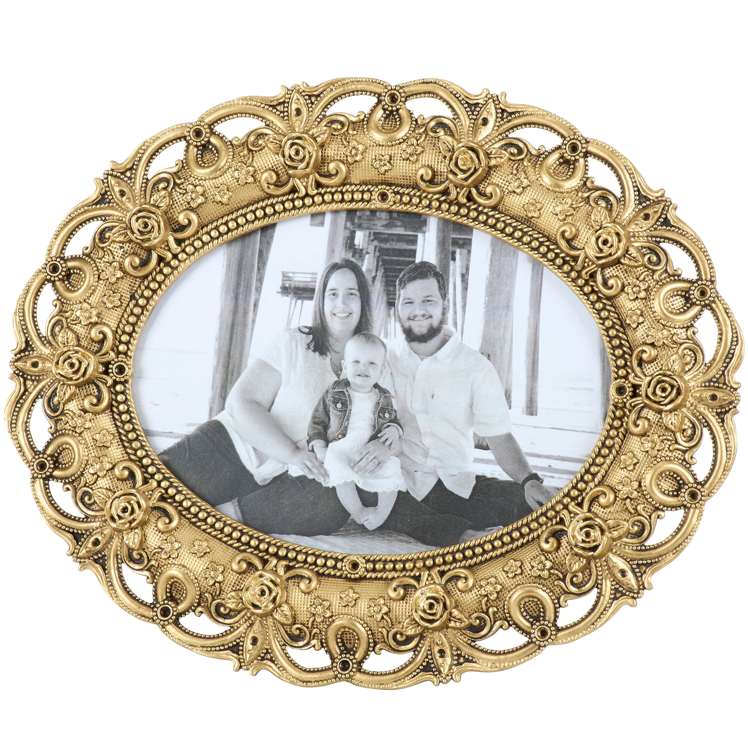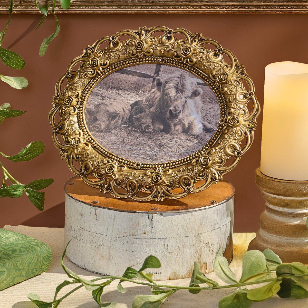 A stylish photo frame from our Cottage Charm Collection displaying an ornate gold color frame featuring a sculpted cottage rose inspired design. Vintage inspired frame fits a 7 inch by 5 inch photo and can easily be replaced via clips on back. Our Cottage Rose photo frame is easy to display using easel back to free-stand. A stylish photo frame perfect for displaying favorite memories as vintage home décor.