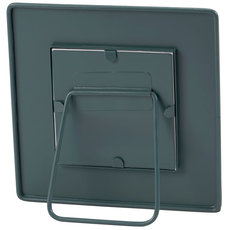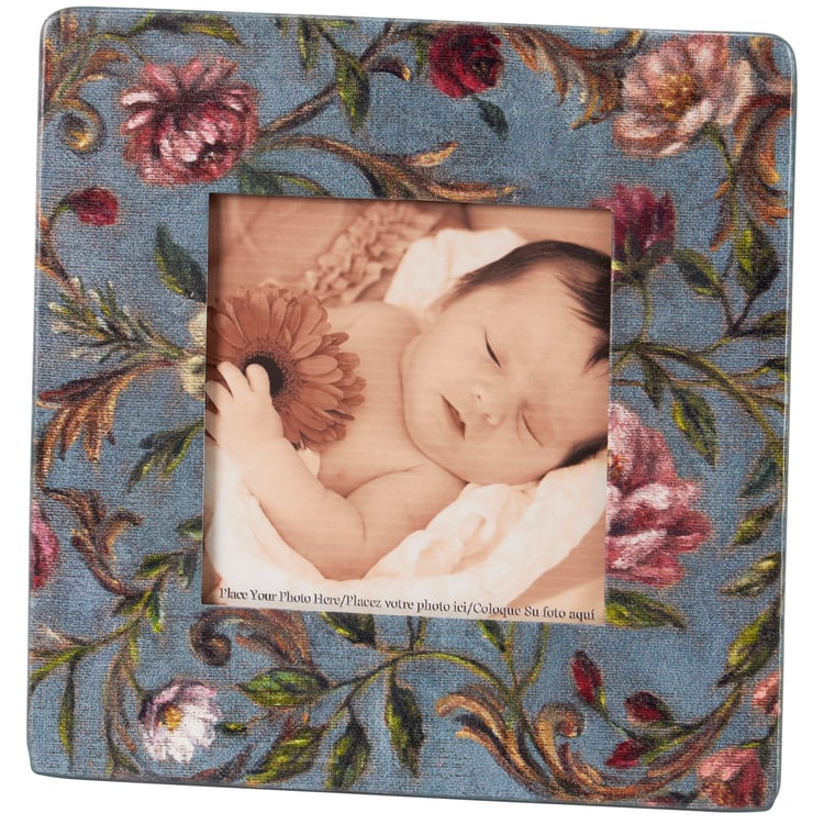 A metal photo frame from our Art Nouveau Collection displaying a hand painted design of florals inspired by art nouveau. Floral design is replicated from original artwork painted onto burlap canvas, giving the art a unique depth and texture. Photo frame features coordinating color on the back. Frame fits a 3.5 inch by 3.5 inch photo and can easily be replaced via clips on back. Our Floral Nouveau photo frame is easy to display using metal easel on back to free-stand. A floral-themed photo frame perfect for displaying favorite memories as vintage home décor.