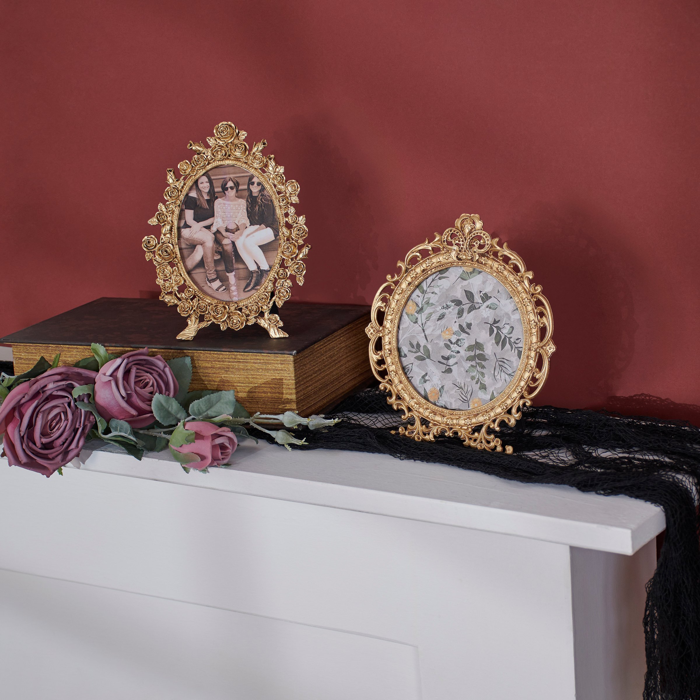 A decorative photo frame from our Moody Collection displaying an ornate filigree inspired gold color frame with distressed details and antique accents. Frame fits a photo with a 5.25 inch diameter and can easily be replaced via clips on back. Our ornate Gold Filigree photo frame is easy to display using easel back to free-stand. A vintage home accent perfect for displaying favorite memories as everyday home décor.