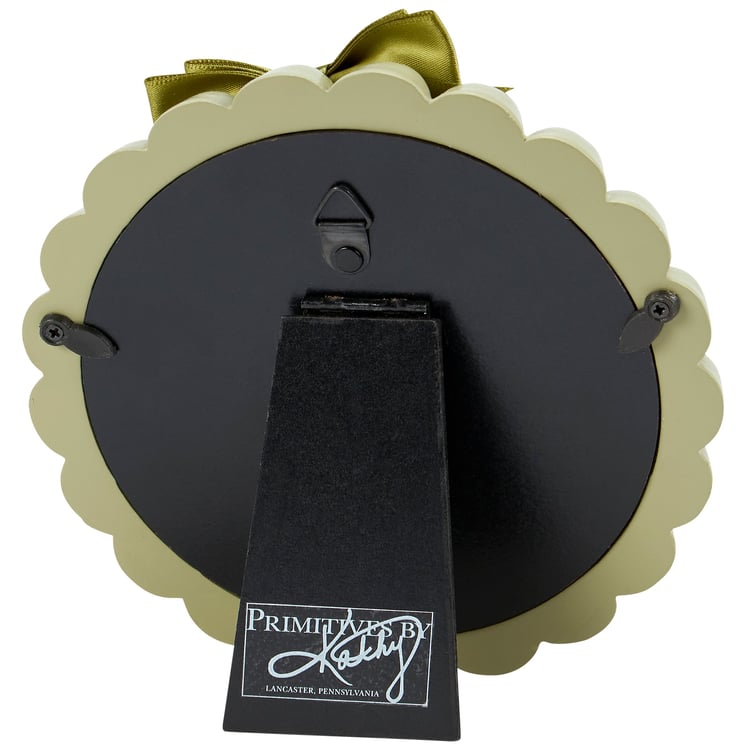 A decorative photo frame from our Baby & Kids Collection displaying round green wooden bead design with inset bow design and green ribbon accent at the top of the frame for added dimension. Frame fits a 4 inch by 4 inch photo and can easily be replaced via clips on back. Our Green Beaded Round photo frame is easy to hang for display via attached hanger or use the attached easel to free-stand. A charming photo frame perfect for displaying favorite memories as everyday children's room décor.
