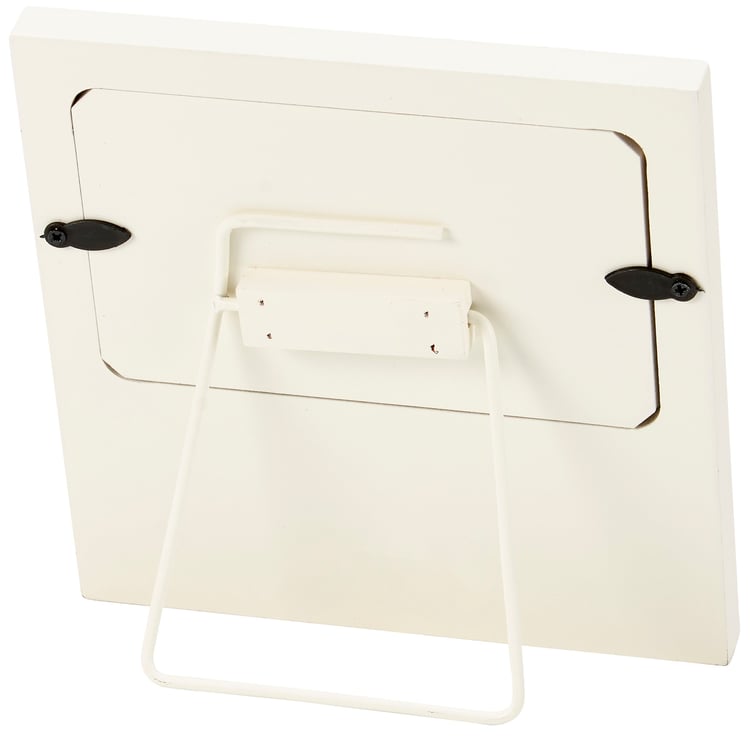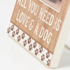 A wooden photo frame from our Pet Collection displaying debossed paw print patterns on the top and bottom with distressed details and a heartwarming pet-themed sentiment that reads "All You Need Is Love & A Dog." Photo frame features coordinating cream color on the sides and back. Frame fits a 5 inch by 3 inch photo and can easily be replaced via clips on back. Our Love And A Dog photo frame is easy to display using the attached metal easel on back to free-stand. A pet-themed gift perfect for displaying favorite memories as everyday home décor.