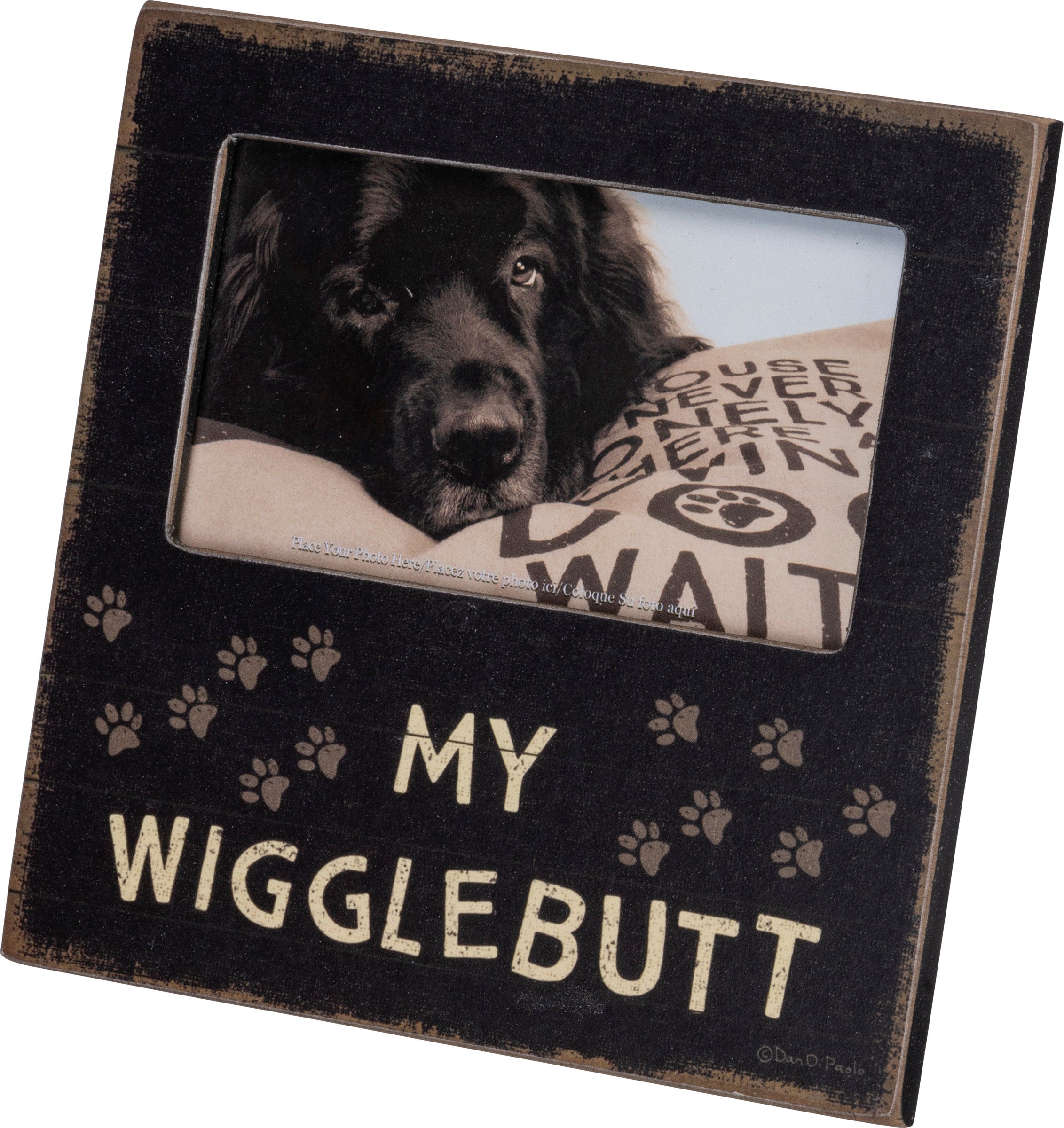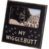 A rustic-inspired wooden plaque frame featuring a "My Wigglebutt" sentiment with paw print designs. Fits a 5" x 3" photo and contains a metal easel back to free-stand alone.