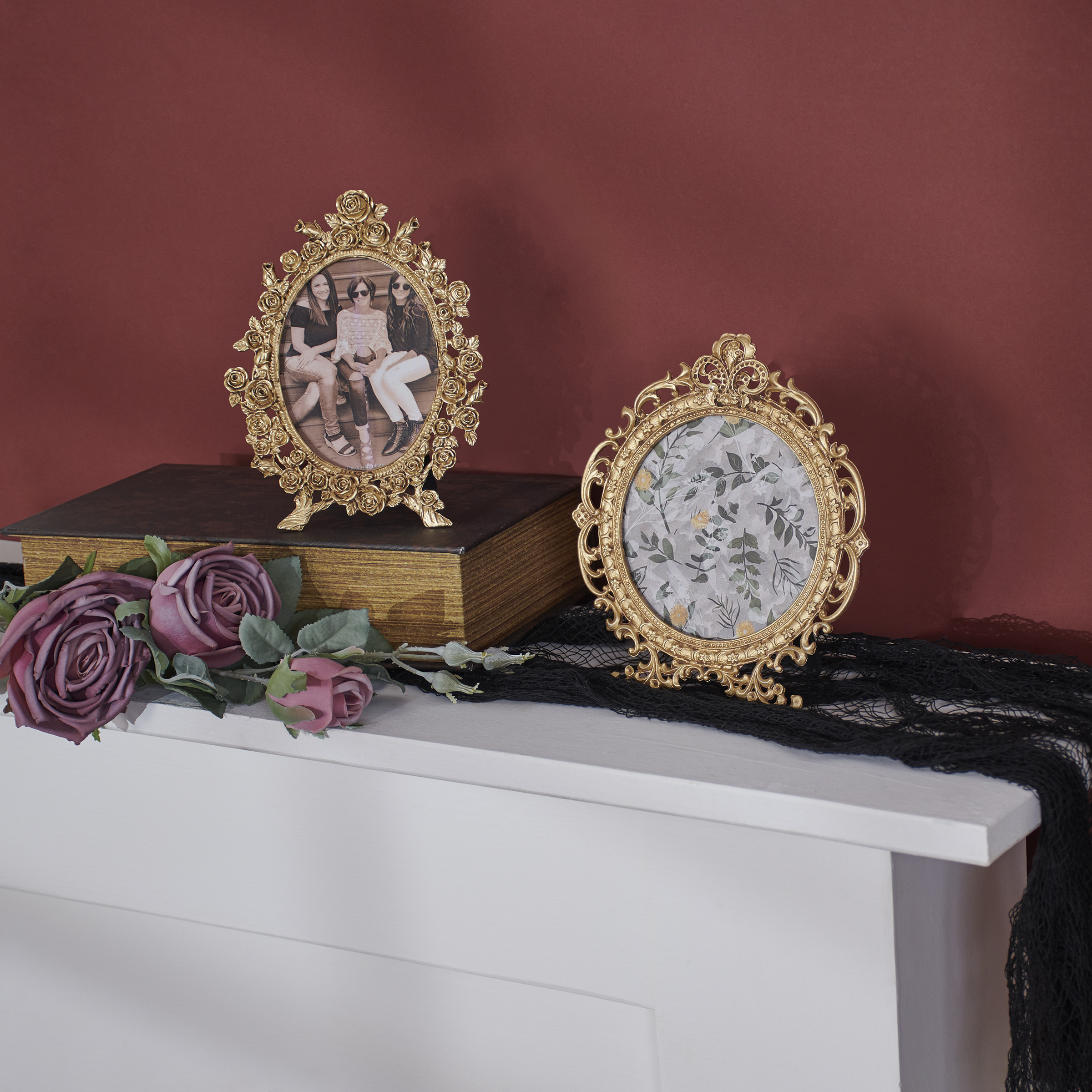 A decorative photo frame from our Moody Collection displaying an ornate filigree inspired gold color frame in an oval shape with distressed details and antique accents. Frame fits a 3 inch by 4.25 inch photo and can easily be replaced via clips on back. Our Oval Filigree photo frame is easy to display using easel back to free-stand. A vintage home accent perfect for displaying favorite memories as everyday home décor.