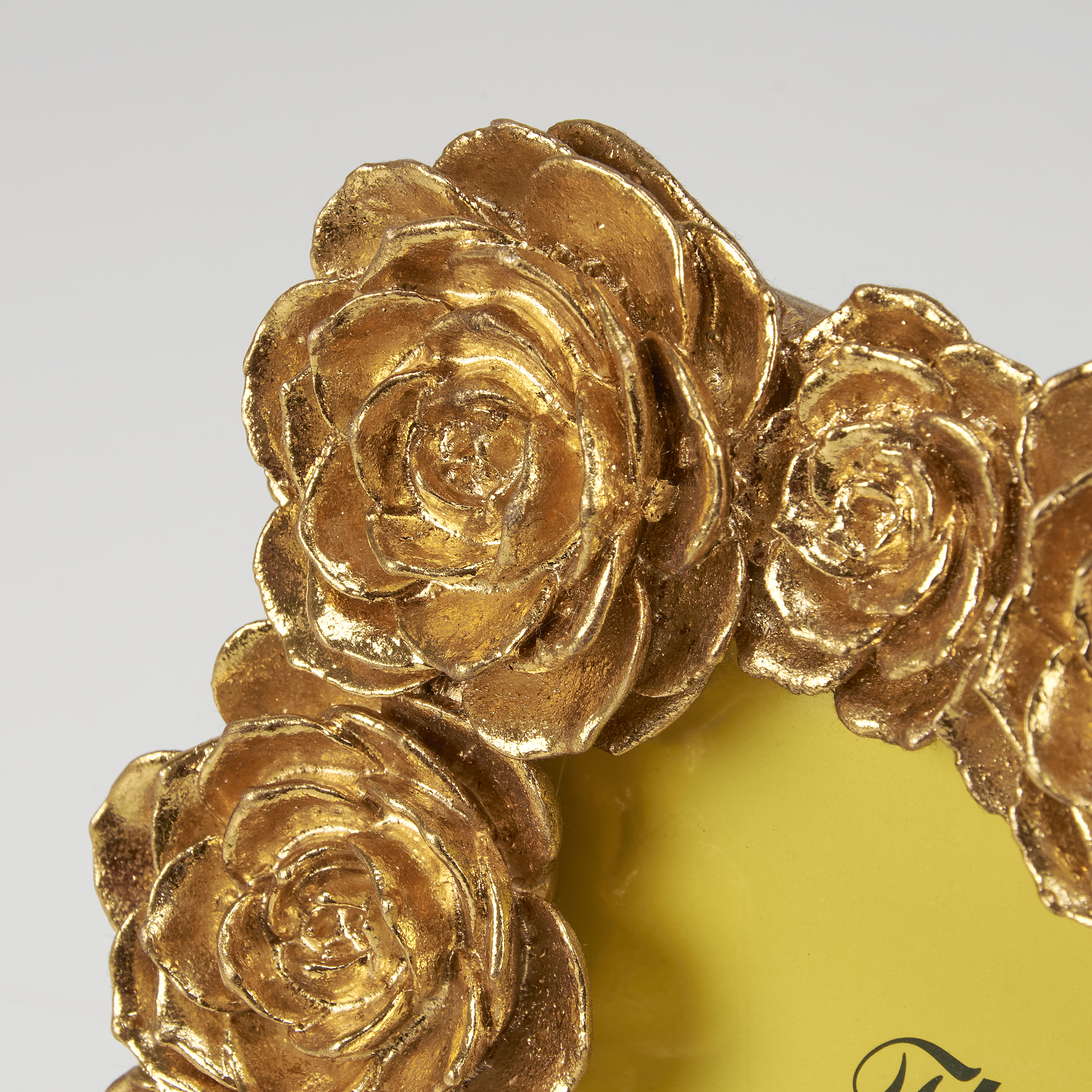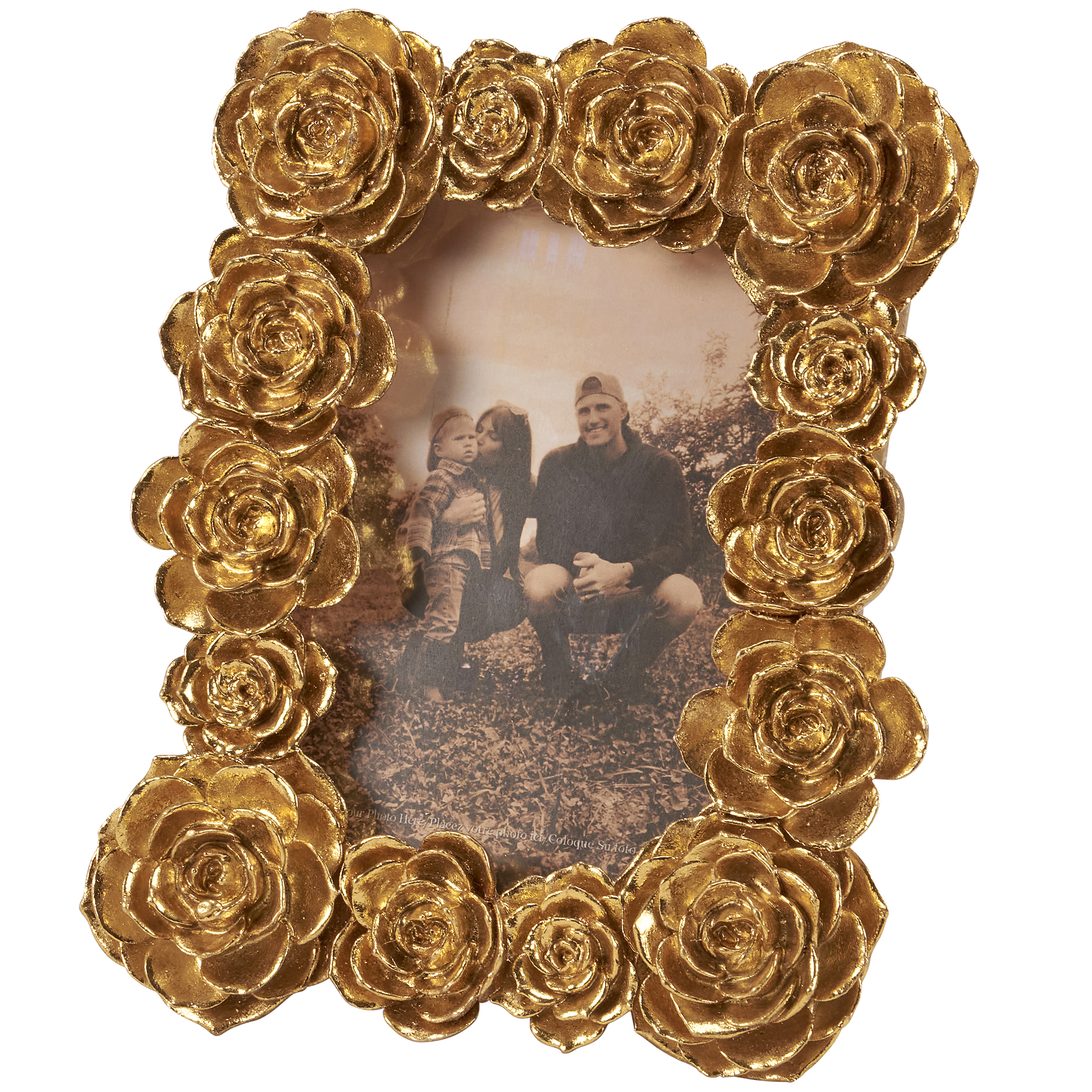 A decorative photo frame from our Moody Collection displaying metallic gold color frame made with various sculpted roses. Frame fits a 4 inch by 6 inch photo and can easily be replaced via clips on back. Our Roses photo frame is easy to display using easel back to free-stand. A vintage home accent perfect for displaying favorite memories as everyday home décor.