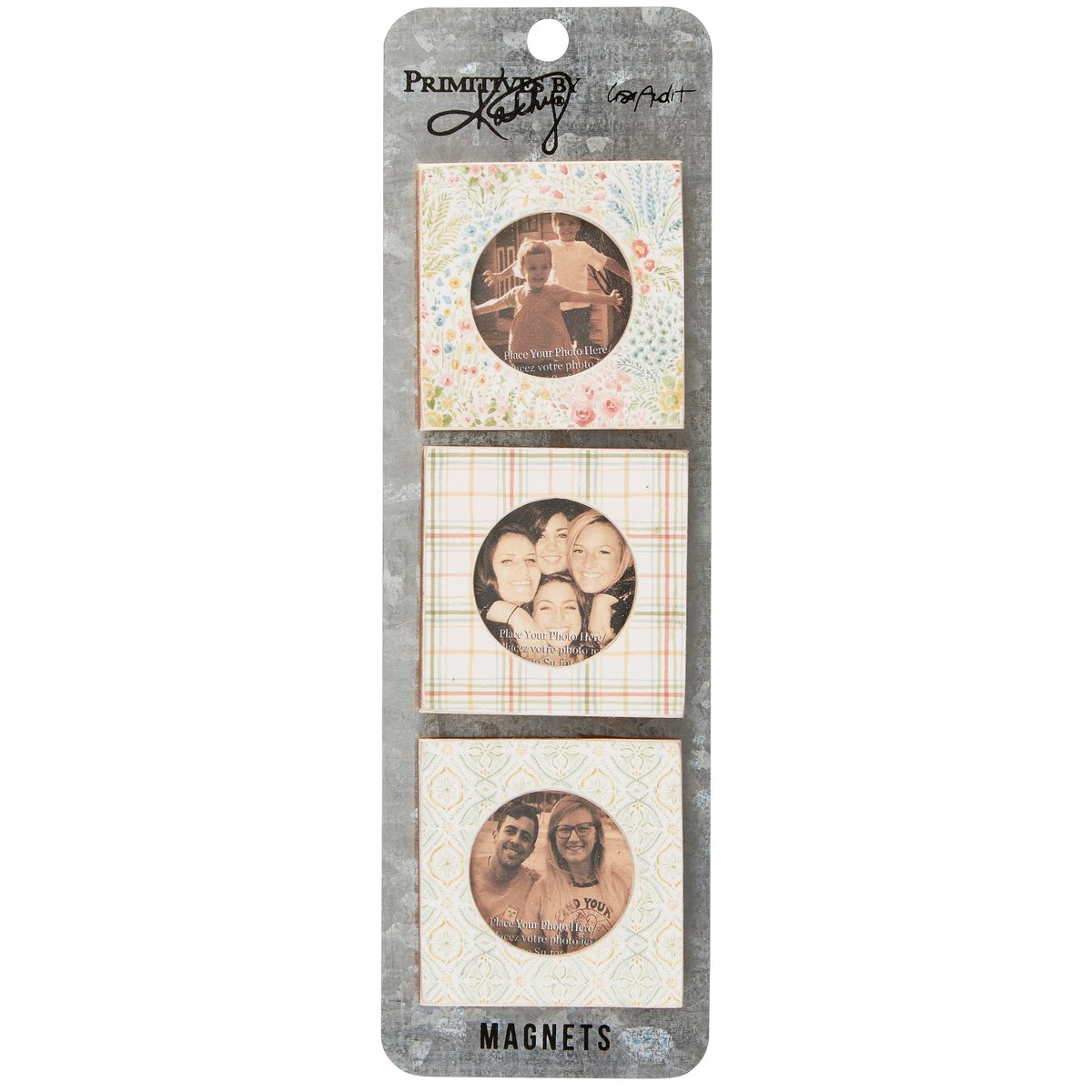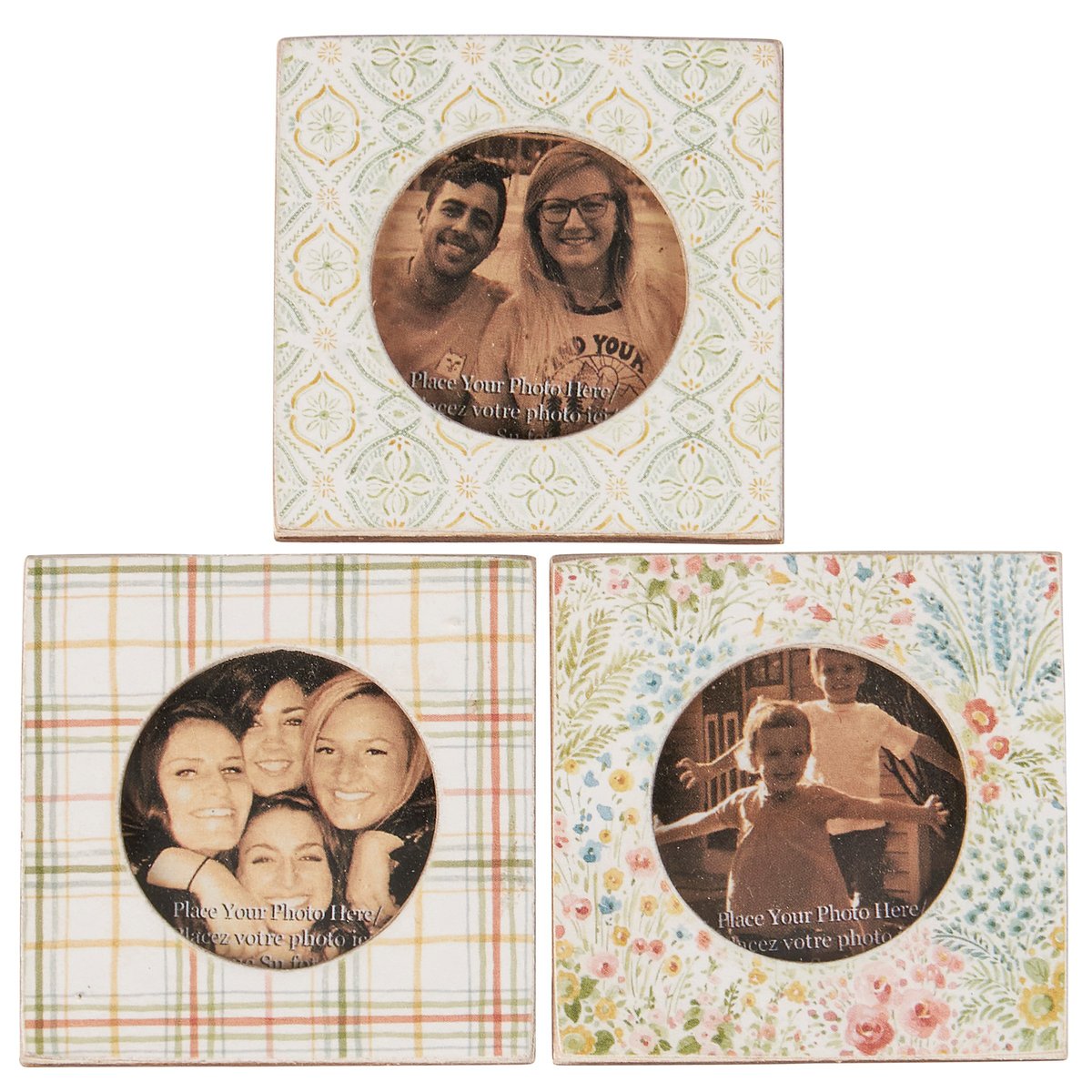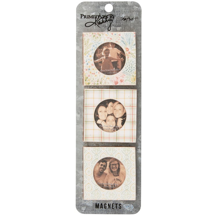 A set of three wooden magnets from our Botanical Collection displaying comforting hand painted designs inspired by mixed florals with space to display photos on each. Frames fit round 1.5 inch photos and can easily be replaced via clips on back. Our Mixed Florals photo magnet set is packaged on a galvanized metal card and in poly bag for easy store display and gifting. A garden-themed gift set perfect for displaying favorite memories as everyday home décor.