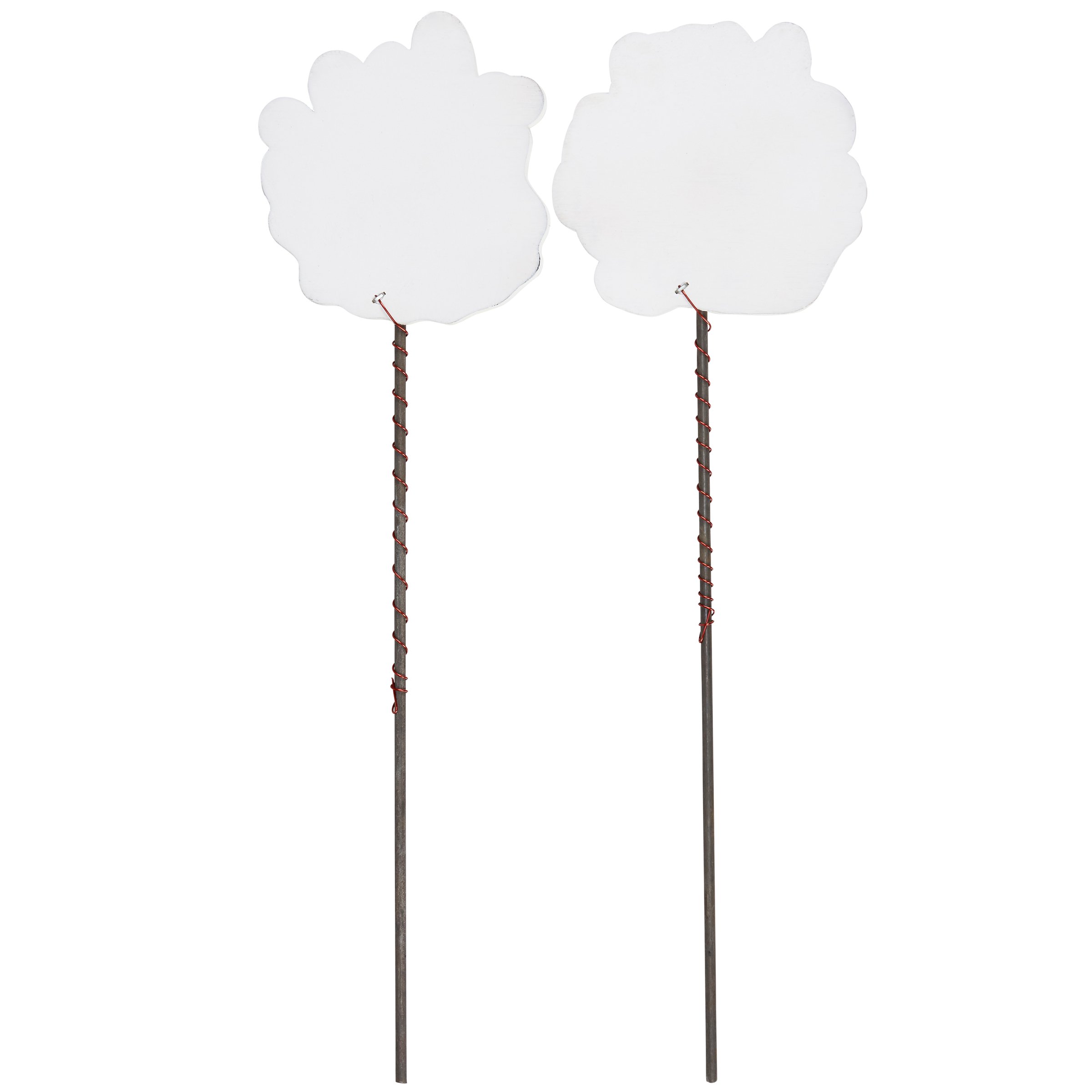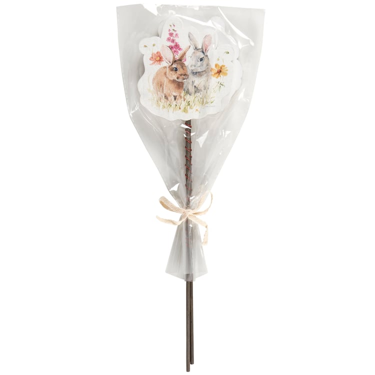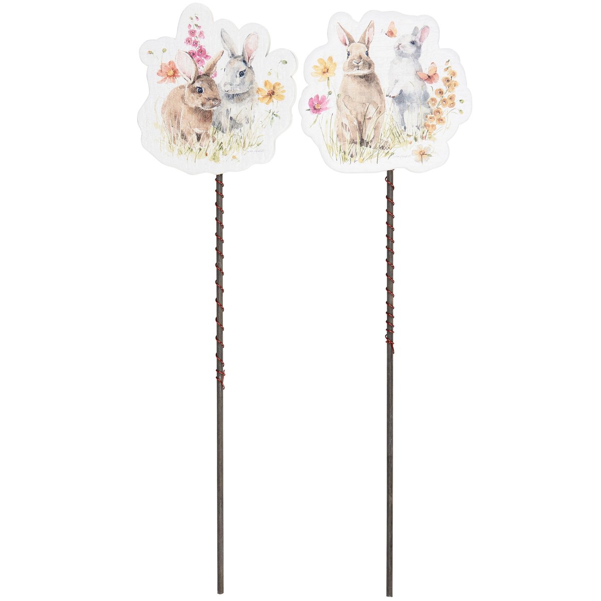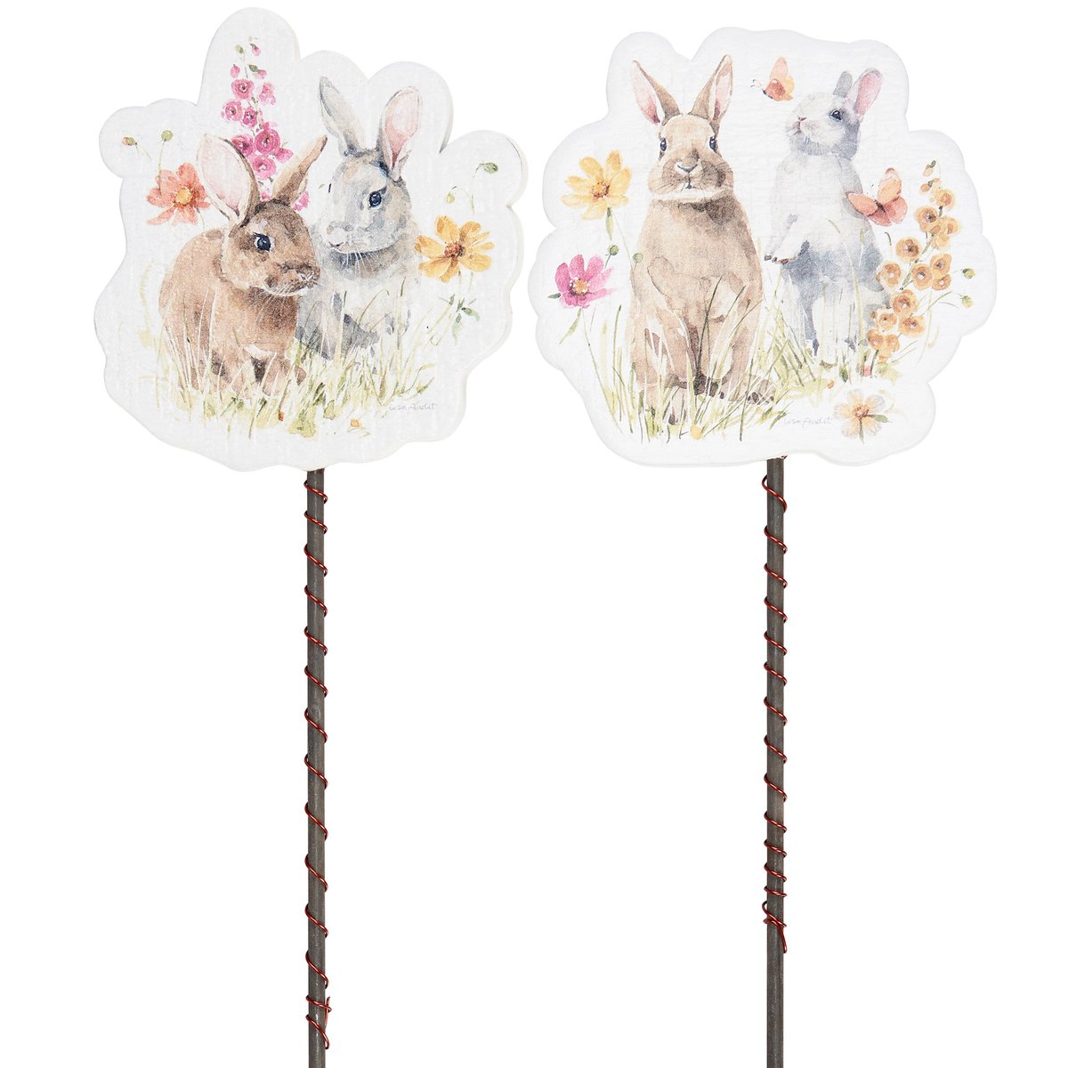 A set of decorative picks from our Easter & Spring Collection displaying designs of bunnies in vibrant spring flowers hand painted in a delicate watercolor style. Designs are attached to a coordinating metal stakes. Our Flower Bunnies pick set includes a 10 inch stakes to easily stand out in a garden or decorative vessel. A set of charming outdoor accents perfect for seasonal display.