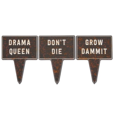 A set of 3 metal garden picks from our Garden Collection featuring fun plant care themed sentiments embossed on each to add character to a garden or individual potted plants. Sentiments read "Drama Queen," "Don't Die," and "Grow Dammit." Metal garden picks also feature rust finish for an aged appearance. Our Grow garden pick set is packaged in a protective poly bag and header card with hole for easy rack display and gifting. A fun everyday garden accent with a variety of display options.
