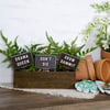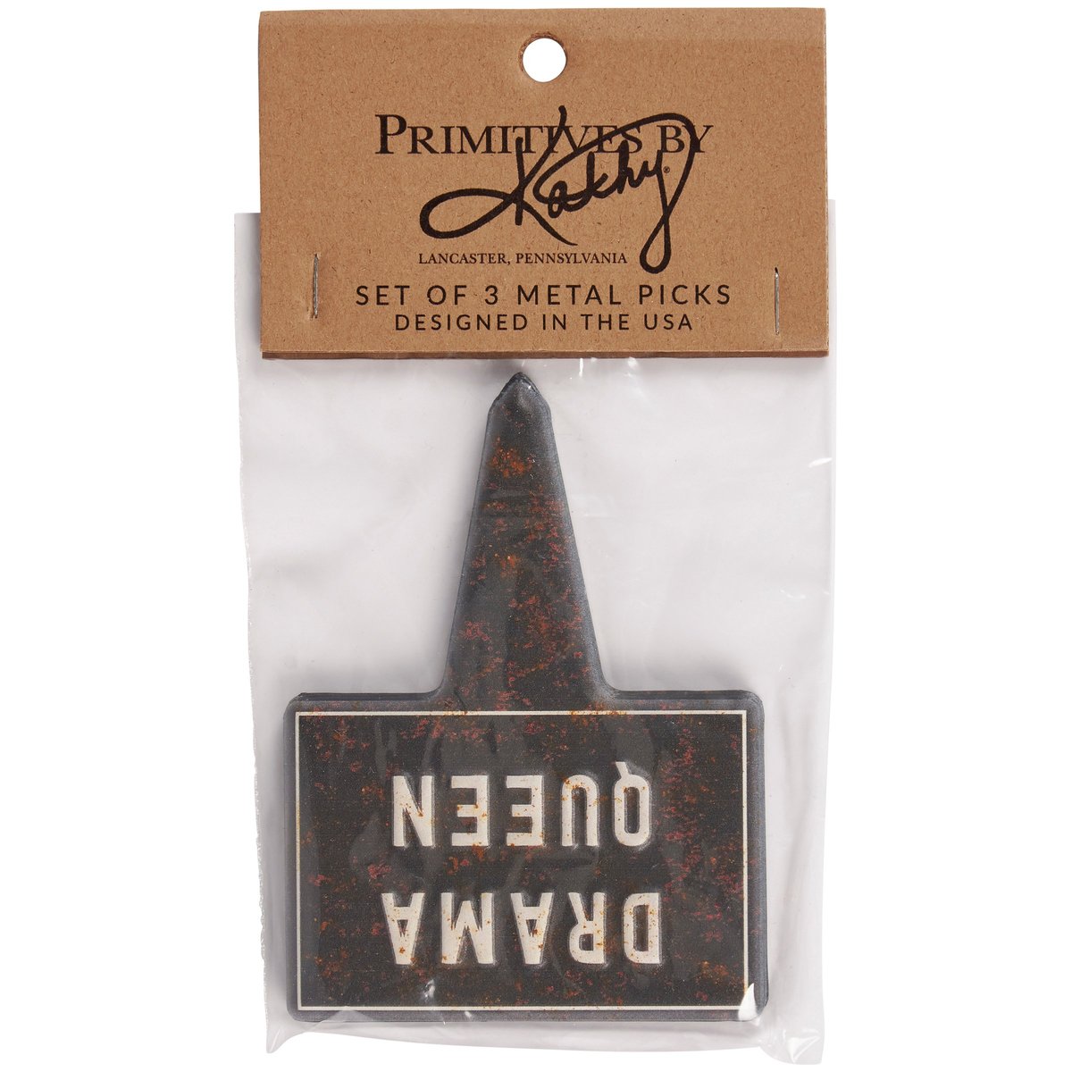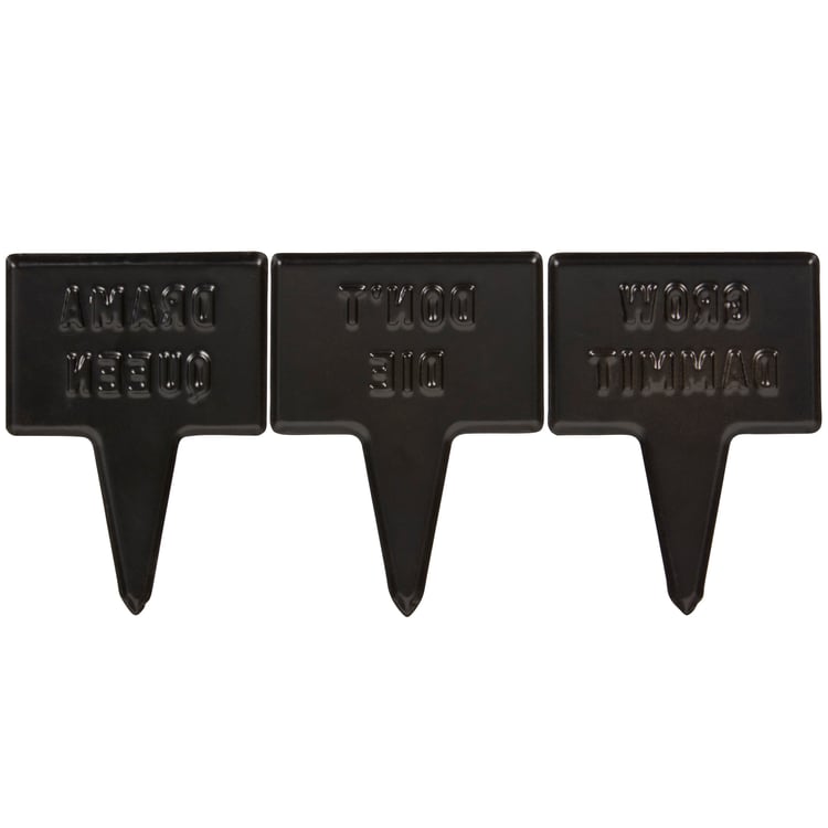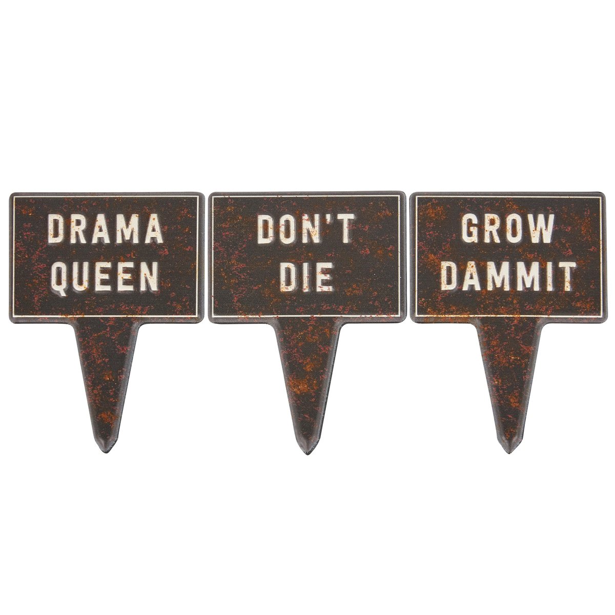 A set of 3 metal garden picks from our Garden Collection featuring fun plant care themed sentiments embossed on each to add character to a garden or individual potted plants. Sentiments read "Drama Queen," "Don't Die," and "Grow Dammit." Metal garden picks also feature rust finish for an aged appearance. Our Grow garden pick set is packaged in a protective poly bag and header card with hole for easy rack display and gifting. A fun everyday garden accent with a variety of display options.