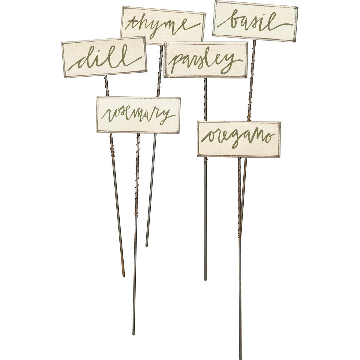 A set of six garden marker picks lending hand lettered "Dill," "Rosemary," "Thyme," "Basil," "Parsley," and "Oregano" sentiments to organize and decorate a spice and herb garden.