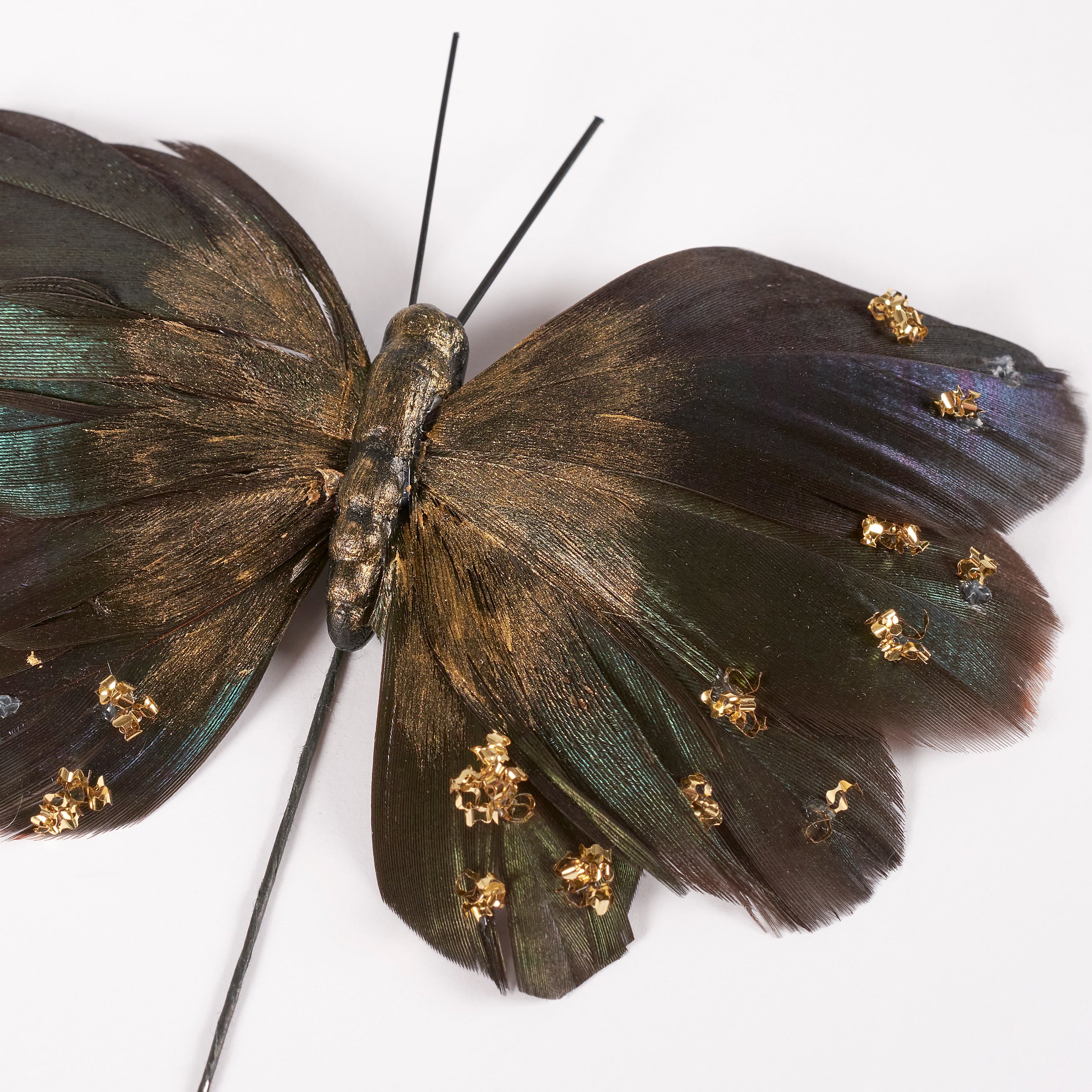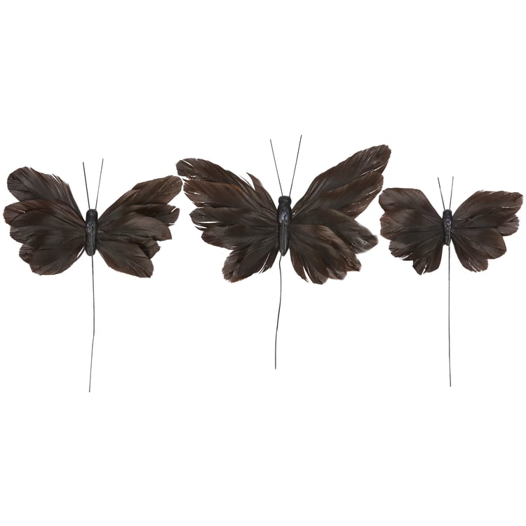 A decorative ornament set displaying stylish butterfly designs that coordinate well with décor from our Moody Collection. Set includes 3 butterflies featuring glitter and feather details attached to a wire. Our Moody Butterfly pick set is packaged together in a polybag with header card for easy rack display. A stylish set of home accents perfect for everyday decorating.