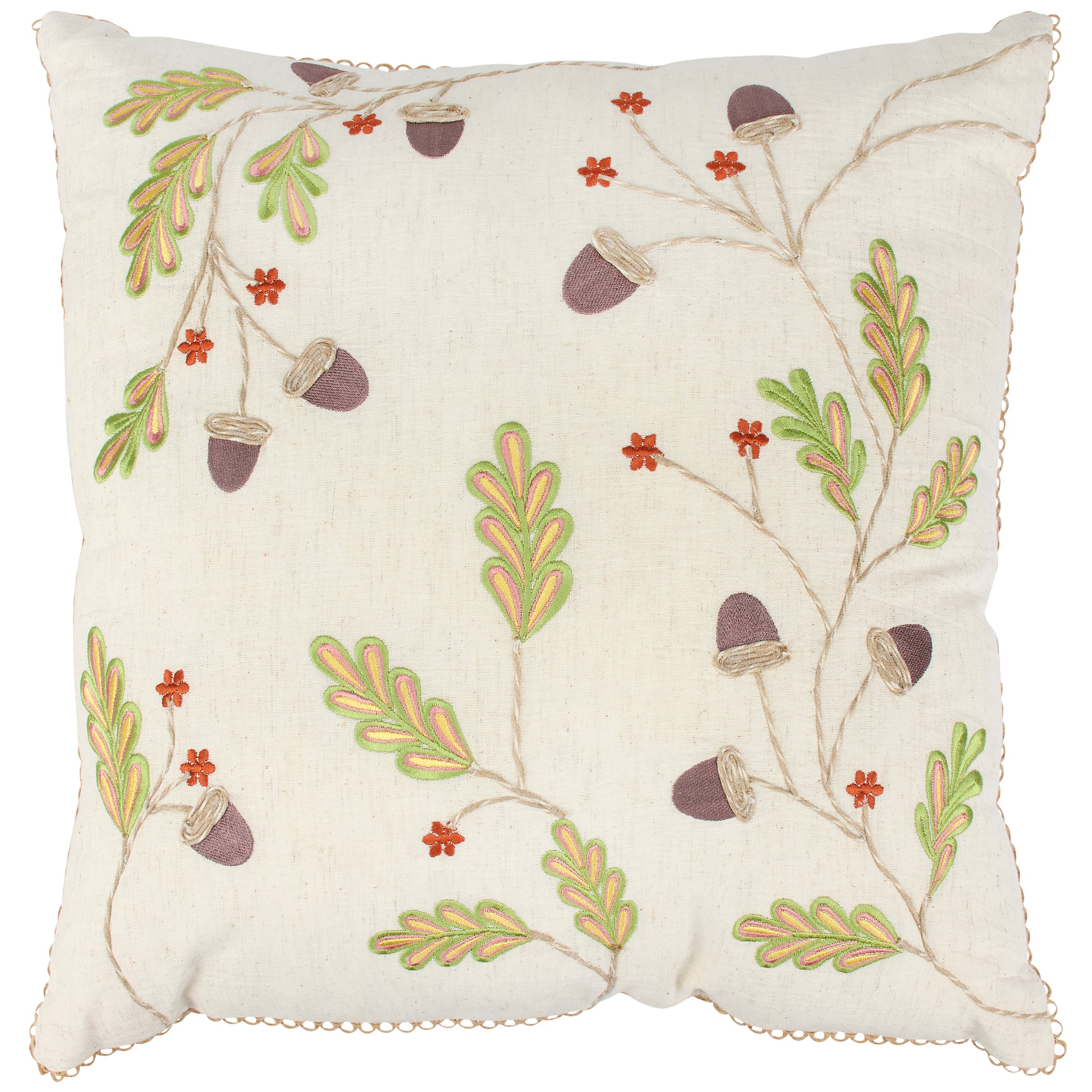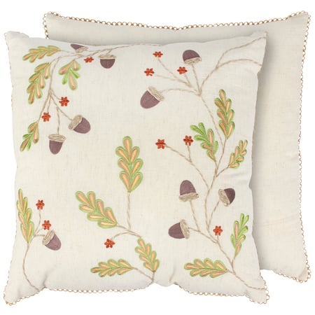 A decorative pillow from our Fall & Harvest Collection featuring acorn and branch designs with embroidered details for added texture and brown stitch trim. Our Acorns And Branches pillow features a zipper to easily remove and clean machine-washable pillow cover. Fall pillow contains polyester filling and is shipped vacuum-sealed for protection and storage. A fall home accent perfect for adding seasonal style to any room.