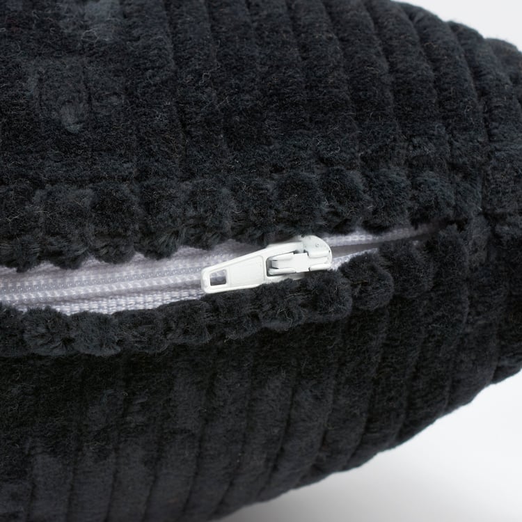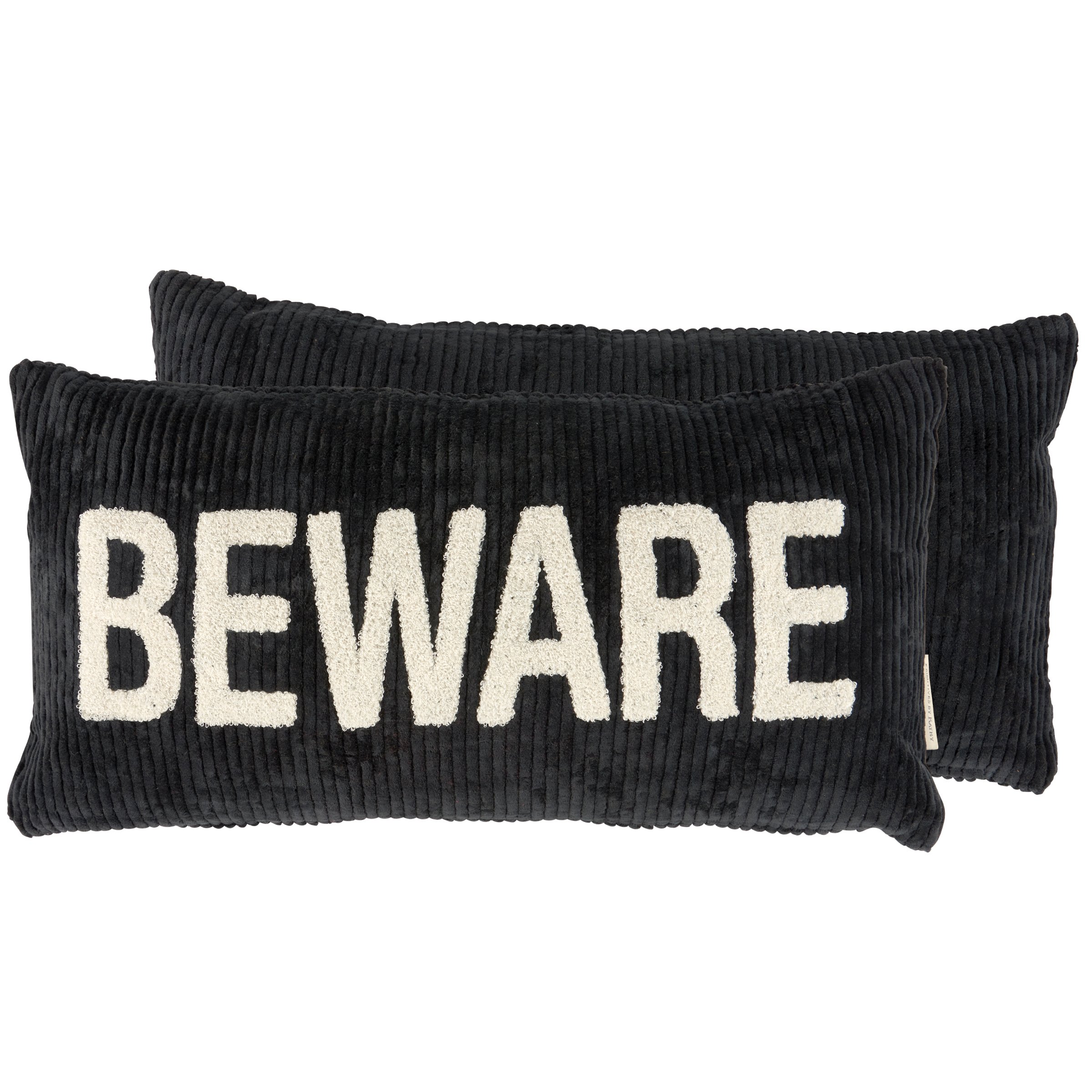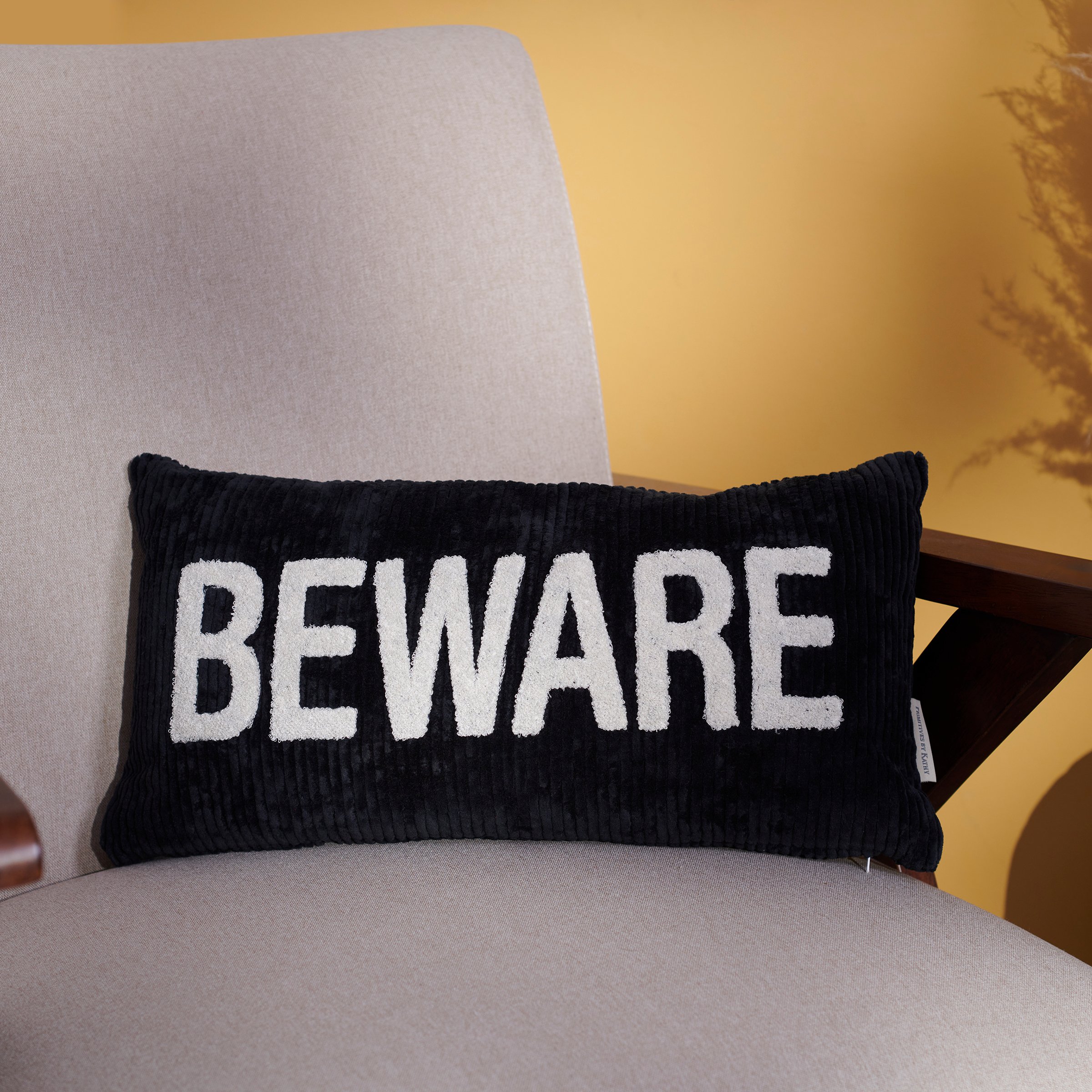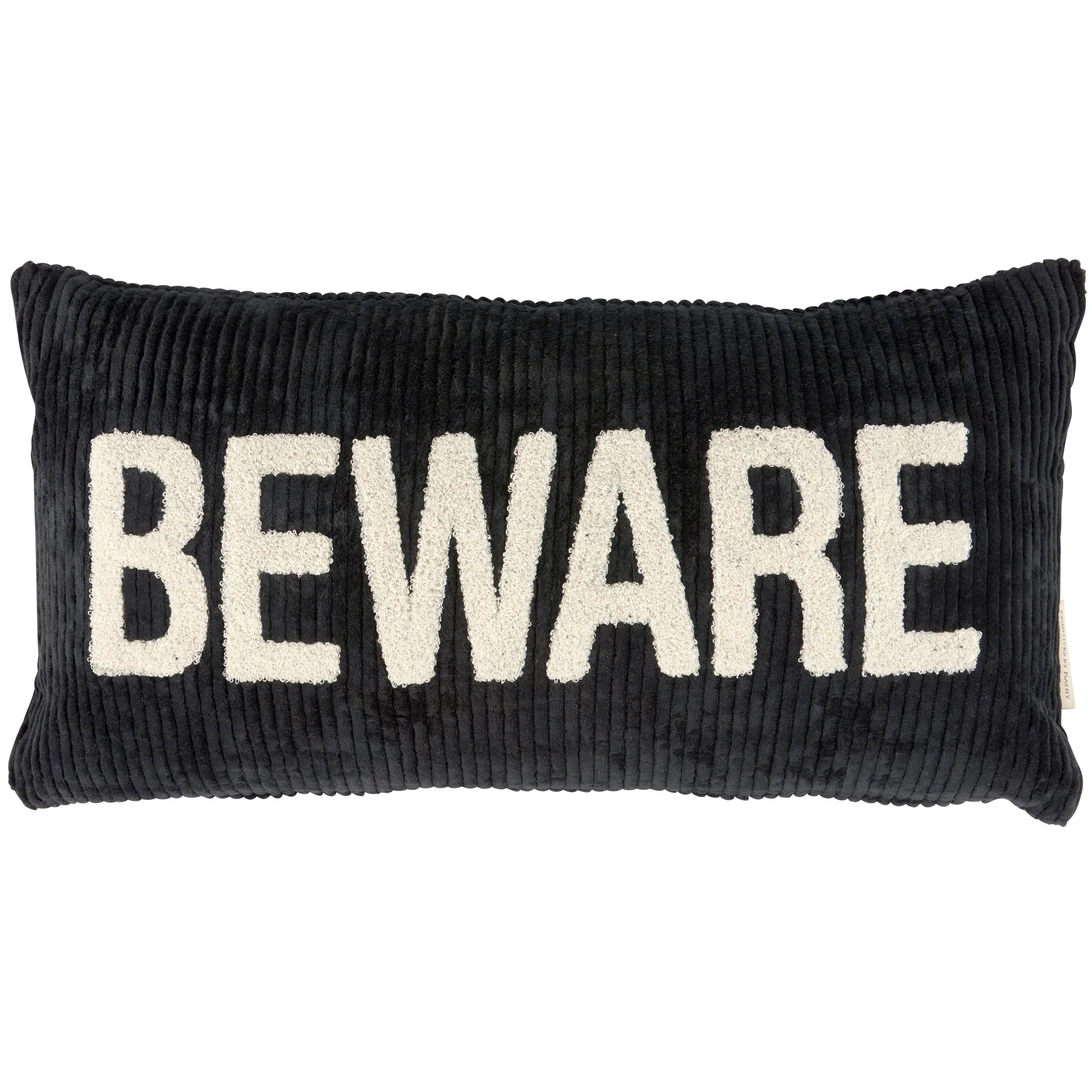 A black corduroy pillow from our Halloween Collection displaying a fun seasonal sentiment that reads "Beware" featuring a raised cream cotton texture. Our Beware pillow features a zipper to easily remove and clean machine-washable pillow cover. Halloween pillow contains polyester filling and is shipped vacuum-sealed for protection and storage. A Halloween home accent perfect for adding seasonal style to any room.