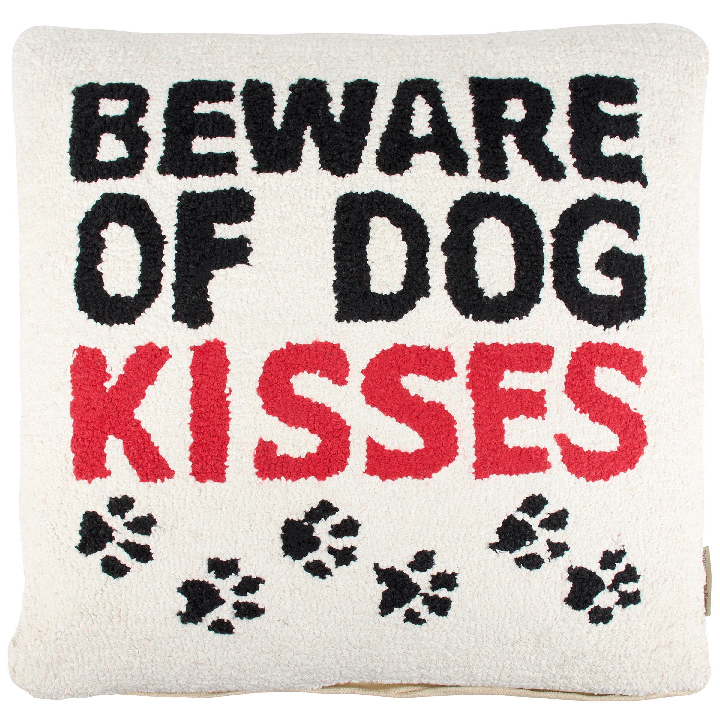 A decorative pillow from our Pet Collection featuring a fun dog inspired design made with raised embroidered cotton throughout the front for added texture. Dog design displays paw prints under a fun dog themed sentiment that reads "Beware Of Dog Kisses." Our Beware Of Dog Kisses pillow features a zipper to easily remove and clean machine-washable pillow cover. Pet pillow contains polyester filling and is shipped vacuum-sealed for protection and storage. A fun dog themed home accent perfect for adding personality to any room while showing off a love for pets.