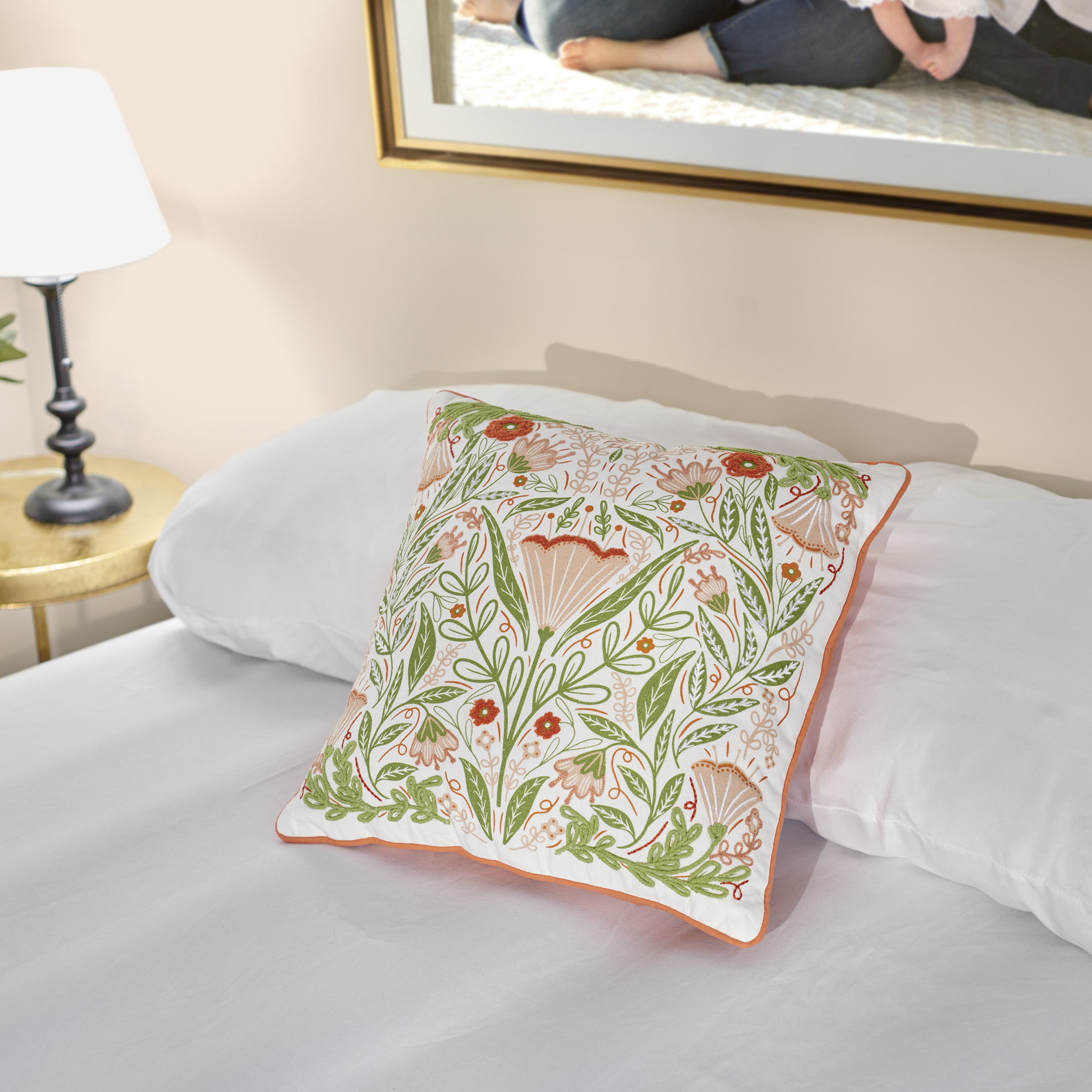 A cotton pillow from our Folk Art Collection displaying a folk art inspired pink blossom pattern with embroidered details and cotton string accents for added dimension. Floral pillow features coordinating pink color on the back and pink piping along the edge. Folk art pillow includes a zipper to easily remove and clean machine-washable pillow cover. Our Blossom Folk Art pillow contains polyester filling and is shipped vacuum-sealed for protection and storage. A floral-themed everyday home accent perfect for adding style to any room.