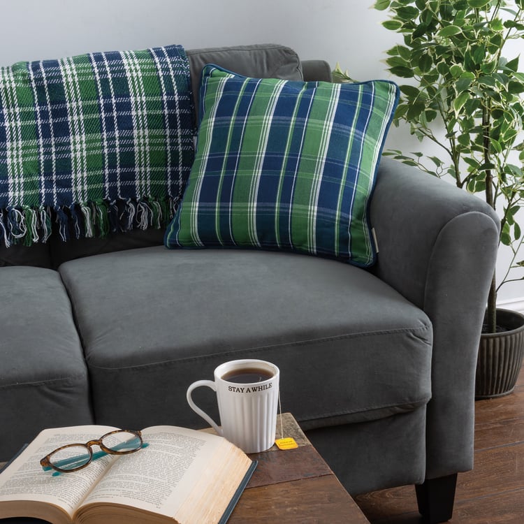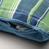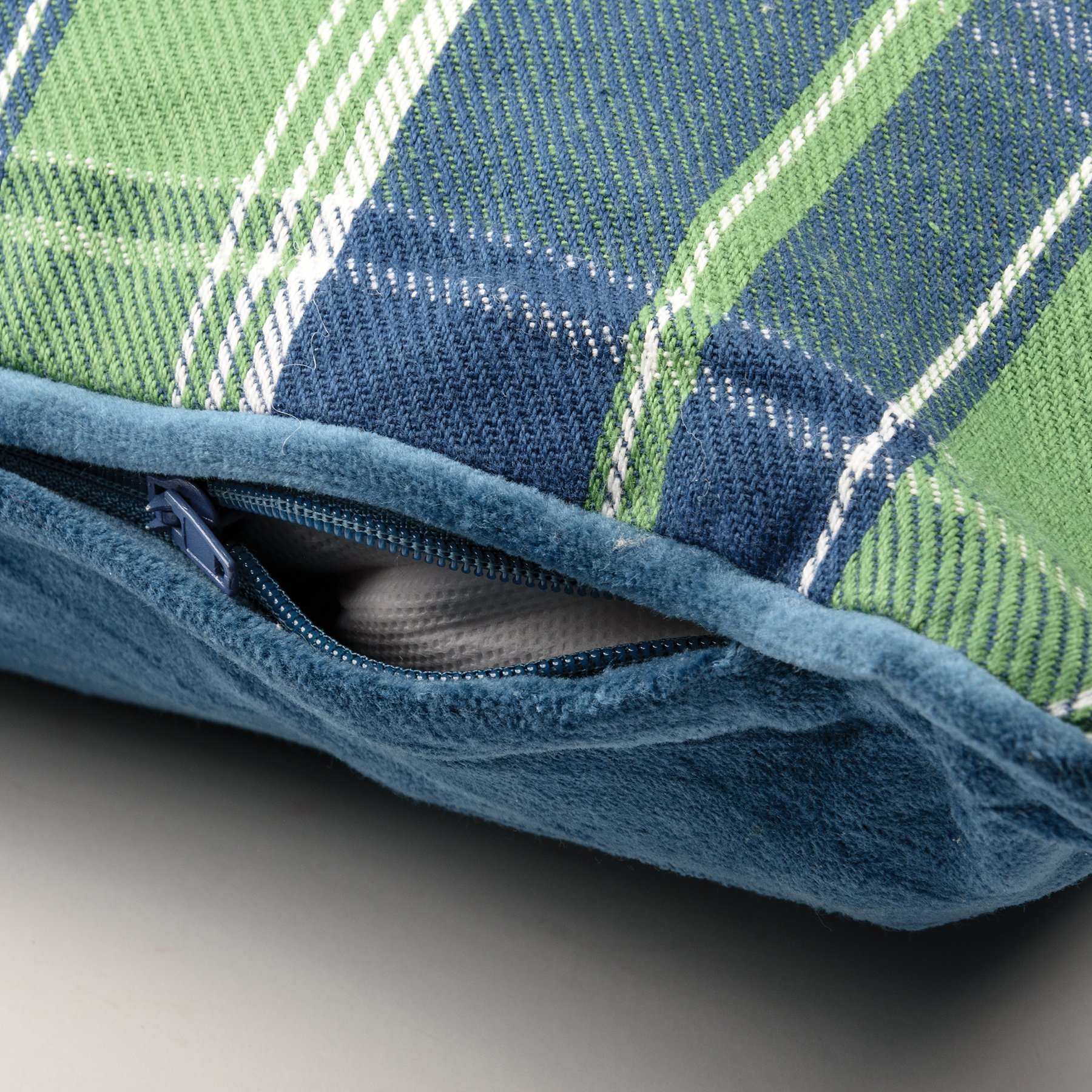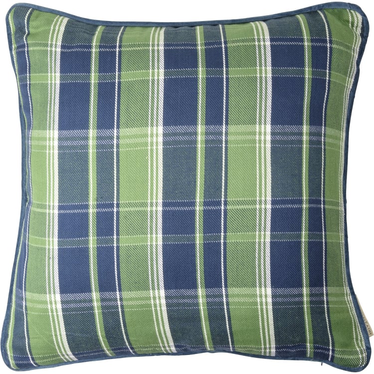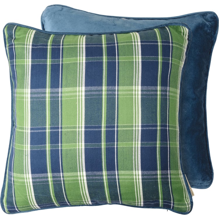 A double-sided cotton pillow featuring a holiday plaid design. Features velvet in a complementing color on reverse side. Polyester filling. Includes a zipper to easily remove and clean cover. Shipped vacuum-sealed for protection and storage.