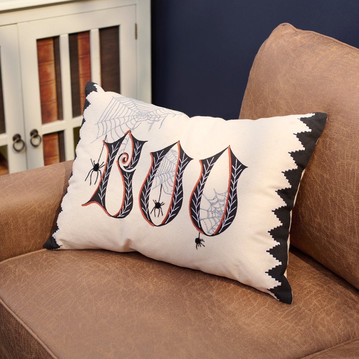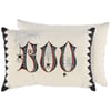 A decorative pillow from our Halloween Collection displaying a moody spider inspired design and seasonal sentiment that reads "Boo" featuring embroidered and metallic thread details and raised cotton accents on the spider bodies for added texture. Our Boo Spider pillow features a zipper to easily remove and clean the machine-washable pillow cover. Halloween pillow contains polyester filling and is shipped vacuum-sealed for protection and storage. A Halloween home accent perfect for adding seasonal style to any room.