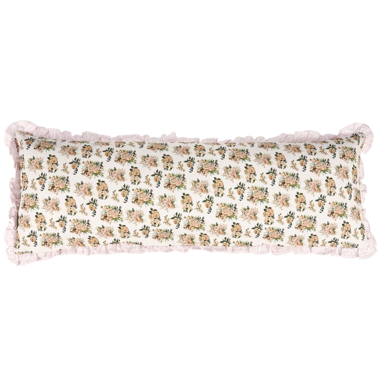 A double-sided cotton pillow from ourĀ Watercolor Collection displaying a pattern of cabbage rose bouquets with a coordinating light pink stripe cotton-linen trim. Cabbage rose designs are replicated from original art hand painted in a unique watercolor style. Pillow features a zipper to easily remove and clean machine-washable pillow cover. Our Cabbage Rose Bouquet pillow contains polyester filling and is shipped vacuum-sealed for protection and storage. A stylish home accent perfect for any room.