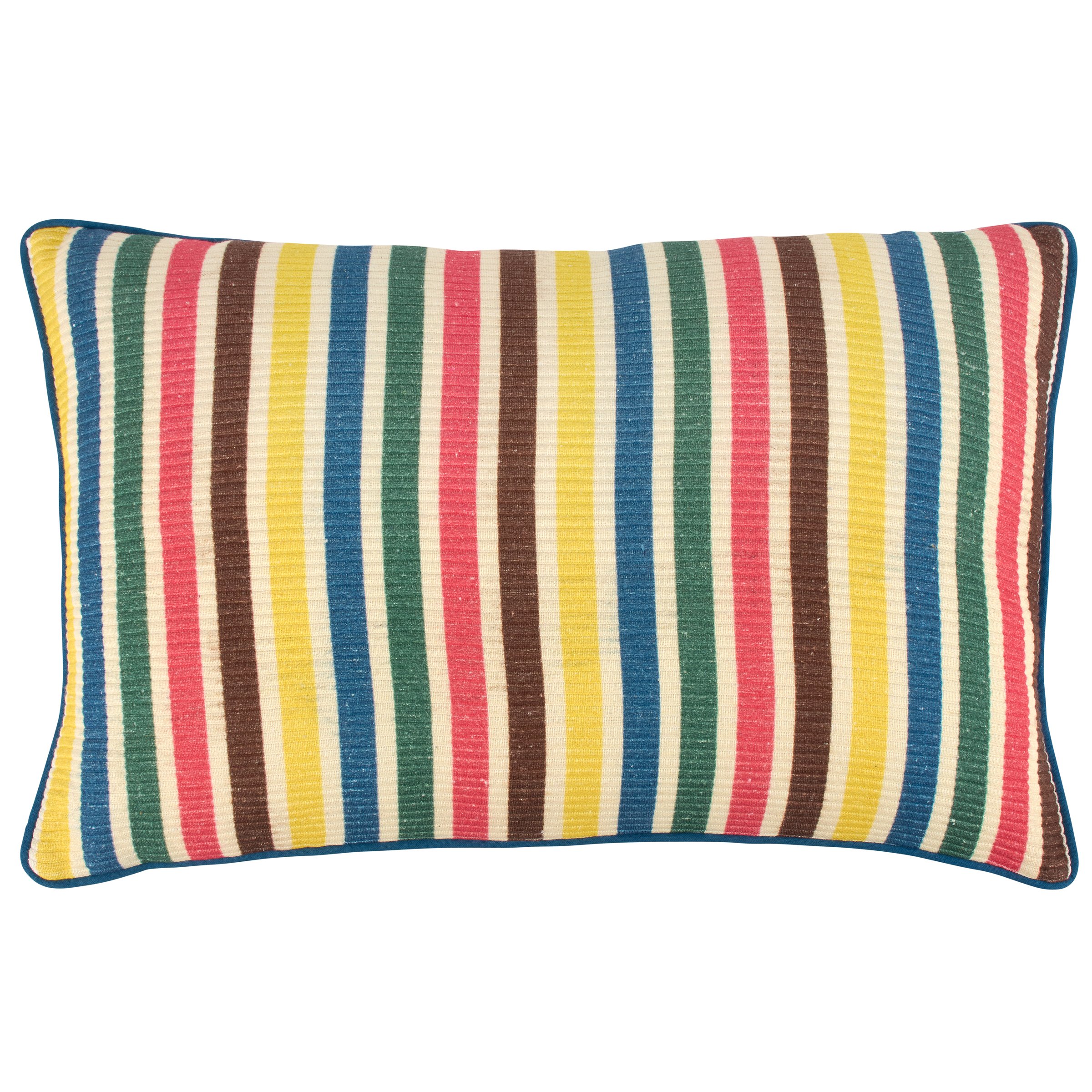 A decorative pillow from our Lake & Cabin Collection displaying stripe pattern inspired by vintage summer camp style with a coordinating blue piping trim. Our Camp Stripe pillow features a zipper to easily remove and clean machine-washable pillow cover. Camp pillow contains polyester filling and is shipped vacuum-sealed for protection and storage. A fun camping themed home accent perfect for adding vintage style to any room.