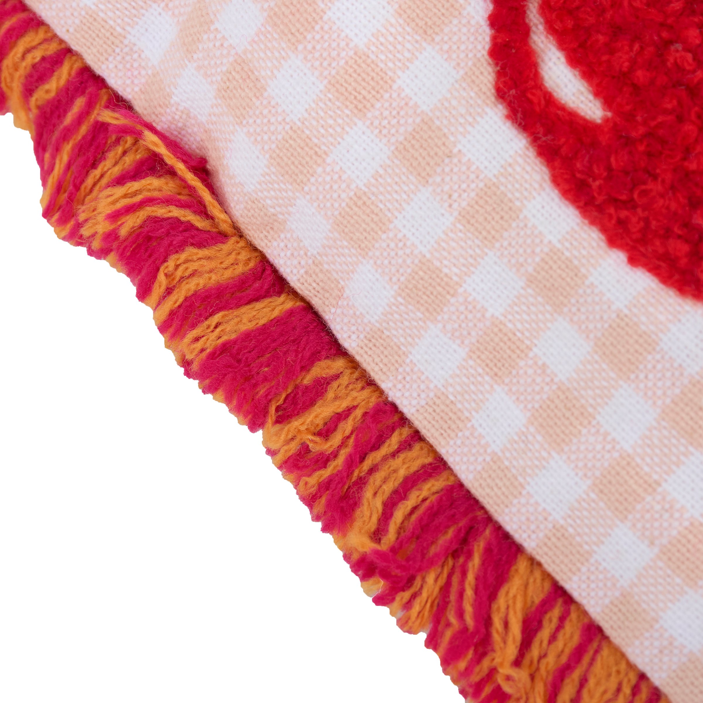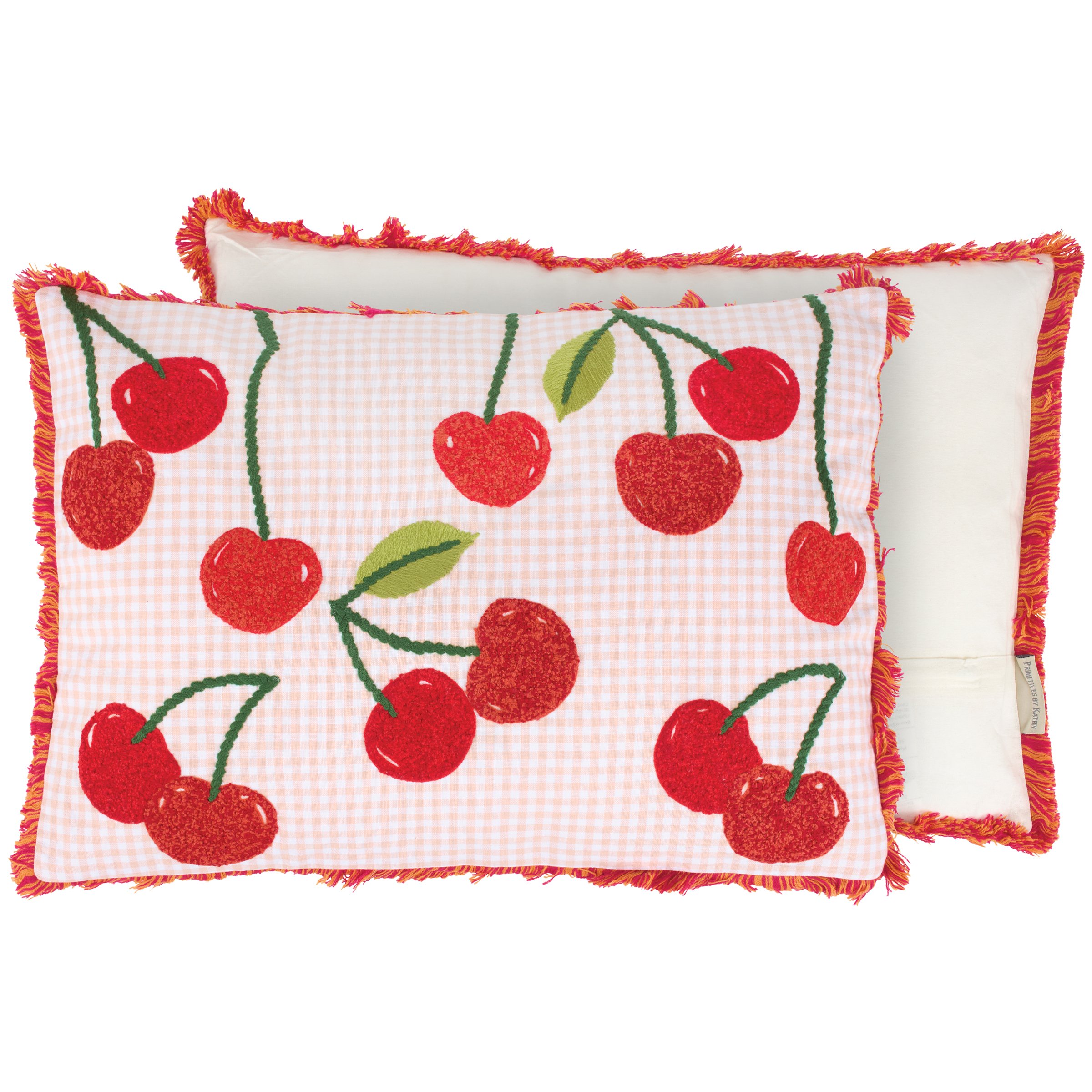 A decorative pillow from our Patriotic Collection displaying a cherries inspired design that features a gingham pattern with cherries made using embroidered cotton in various textures and a coordinating fringe trim. Our Cherry Stem pillow features a zipper to easily remove and clean machine-washable pillow cover. Americana pillow contains polyester filling and is shipped vacuum-sealed for protection and storage. A cherry themed home accent perfect for adding vintage Americana style to any room.