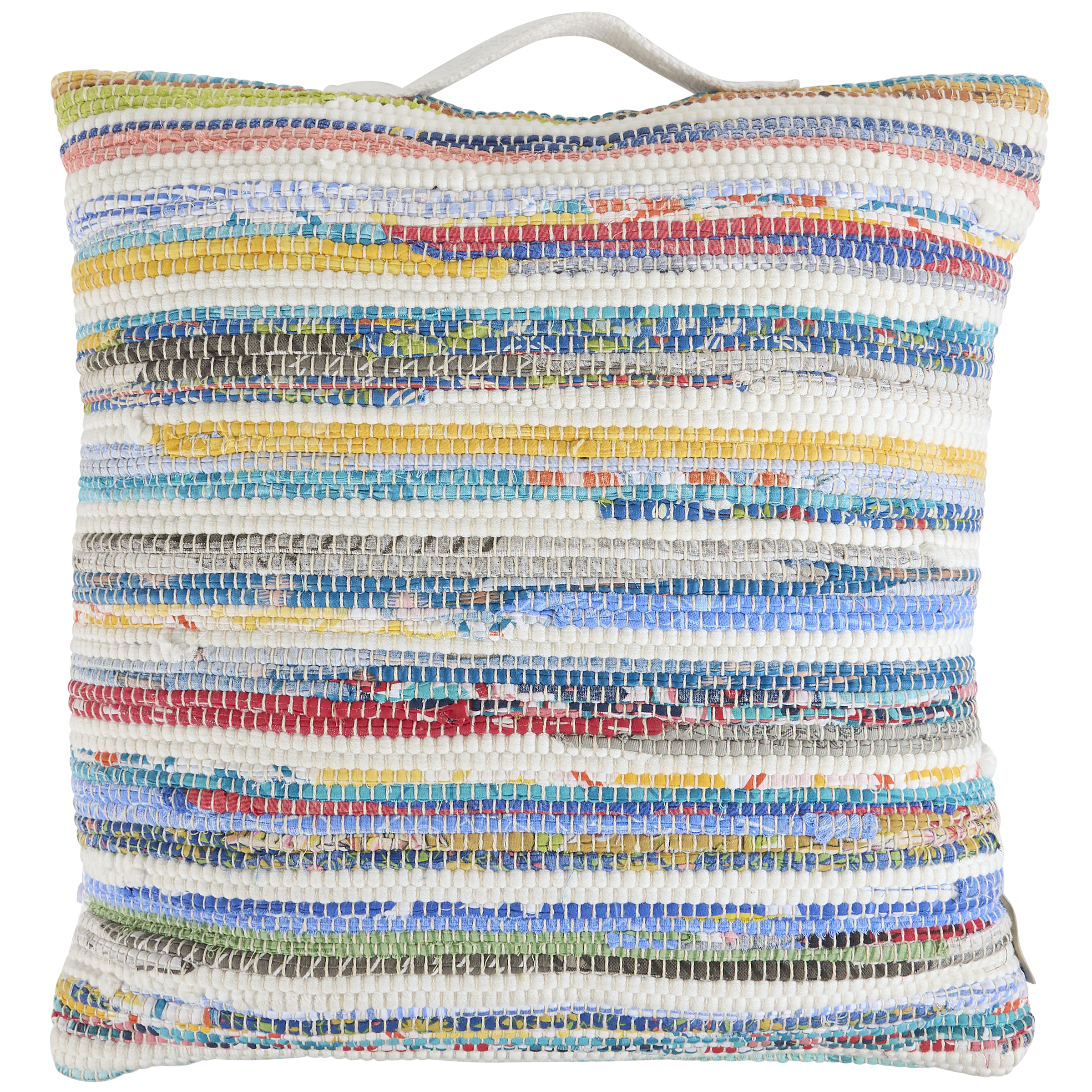 A decorative pillow from our Primitive Collection displaying a colorful chindi inspired design made by weaving various fabrics into the construction of the product to create a unique combination of colors and textures while repurposing leftover fabric. Spot clean only. Our Chindi pillow is a stylish everyday home accent perfect for adding a pop of color to any room.