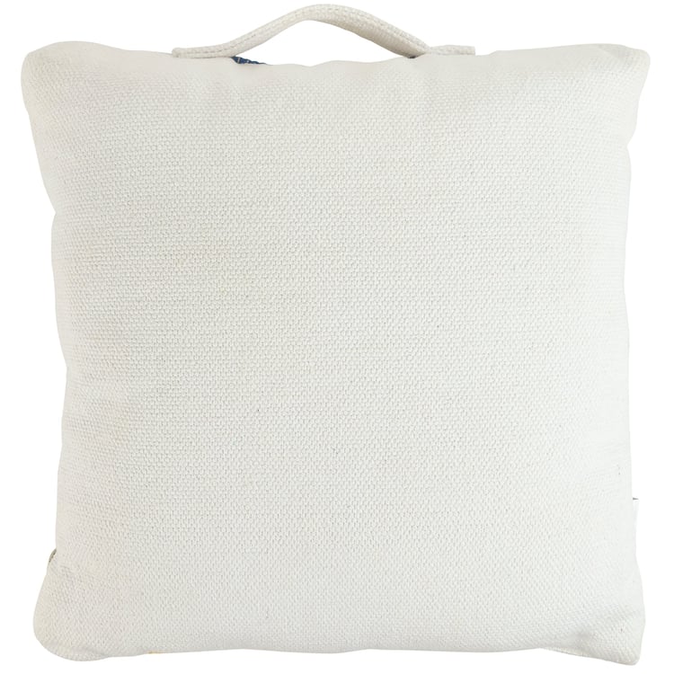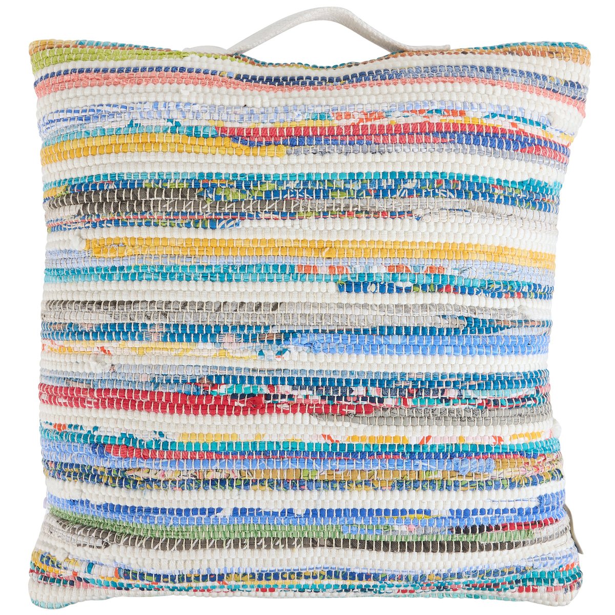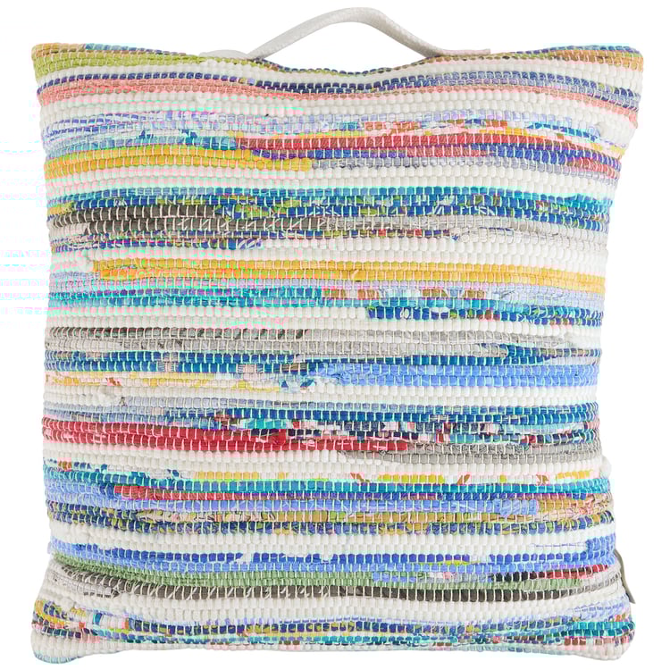 A decorative pillow from our Primitive Collection displaying a colorful chindi inspired design made by weaving various fabrics into the construction of the product to create a unique combination of colors and textures while repurposing leftover fabric. Spot clean only. Our Chindi pillow is a stylish everyday home accent perfect for adding a pop of color to any room.