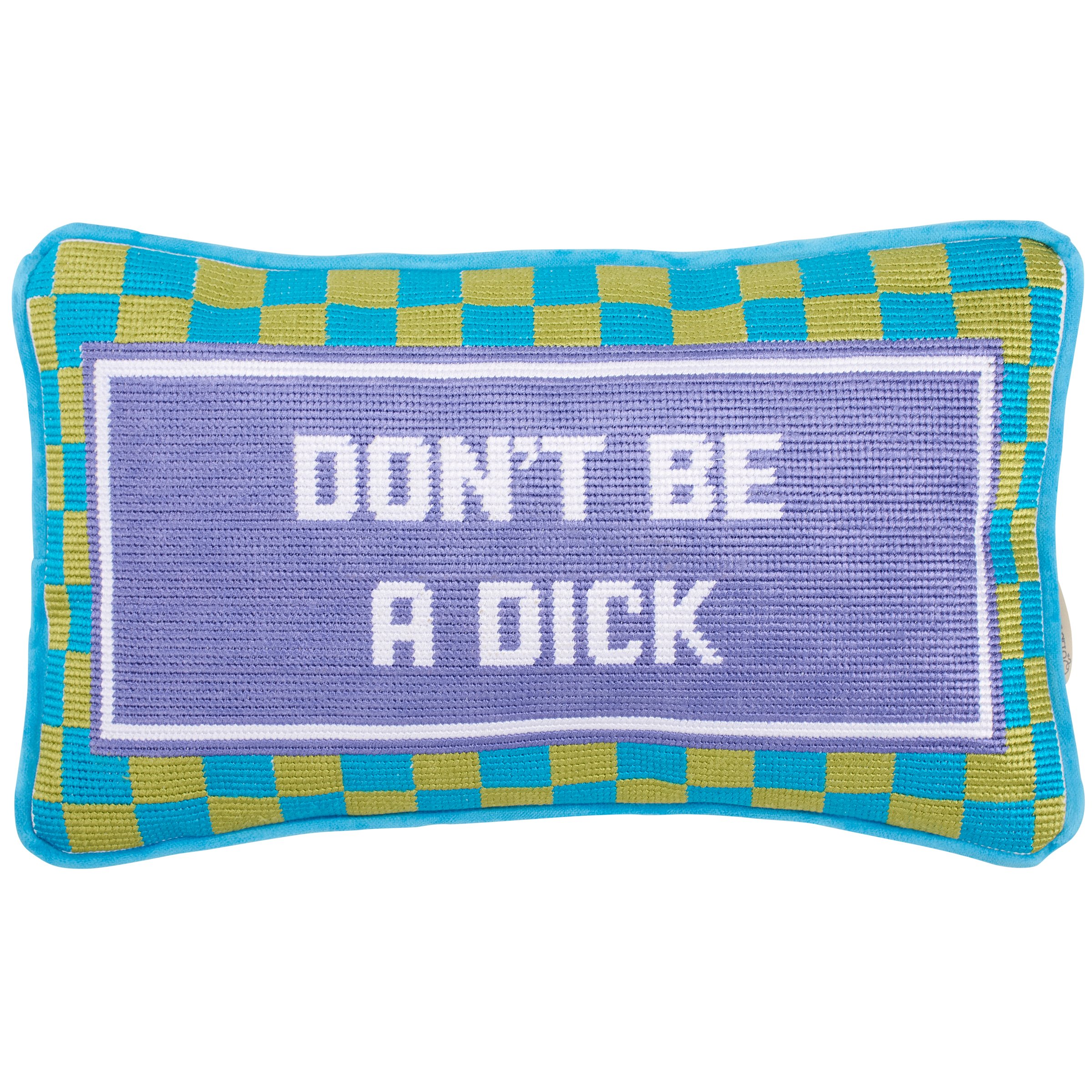 This decorative pillow combines nostalgia with a modern mentality featuring a classic needlepoint style, velvet back, and a colorful retro palette as well as a sassy sentiment that reads "Don't Be A Dick." Questionables pillows contain polyester filling and are shipped vacuum-sealed for protection and storage. Our Don't Be A Dick pillow is a stylish home accent that demands attention and is perfect for everyday expression or gifting to like-minded friends.