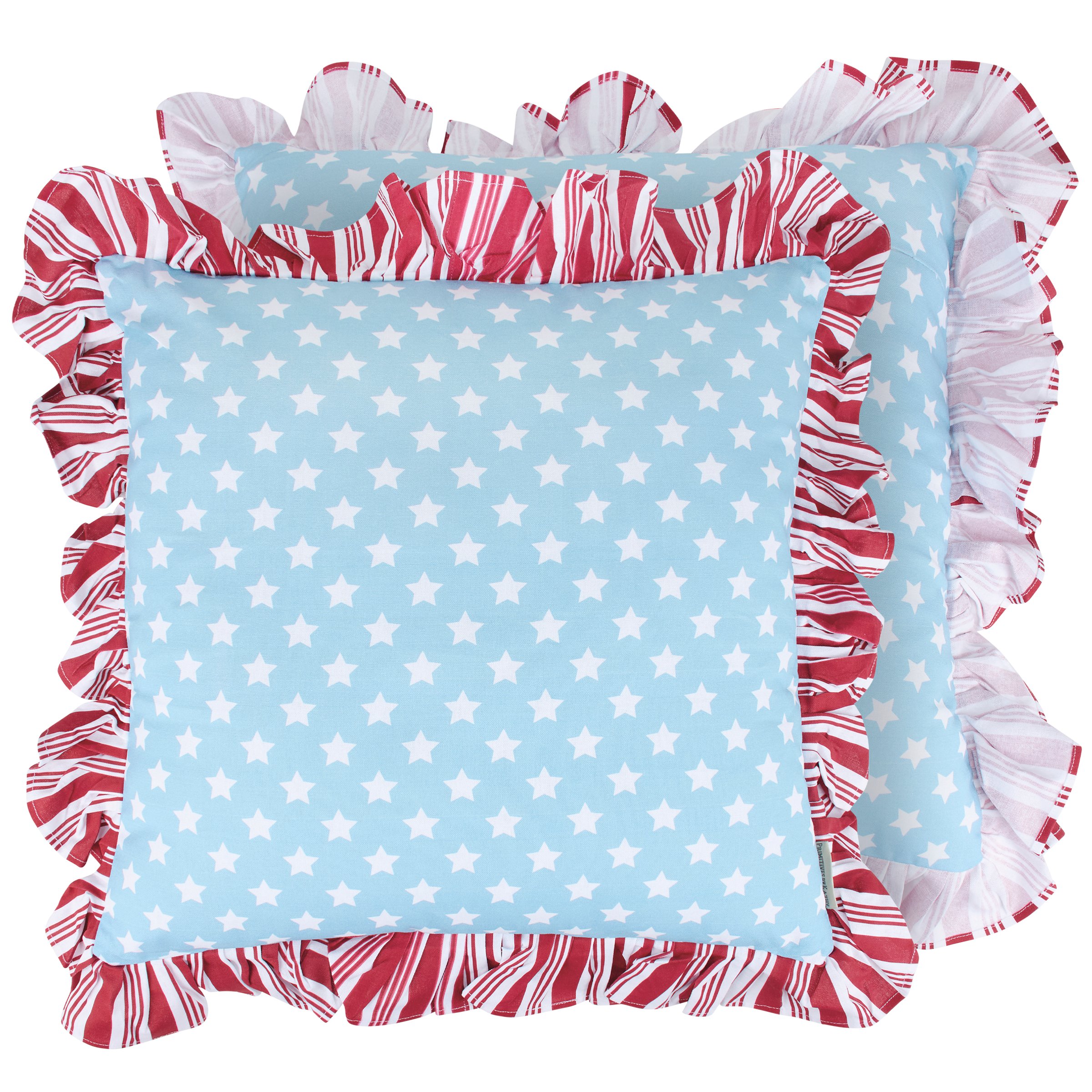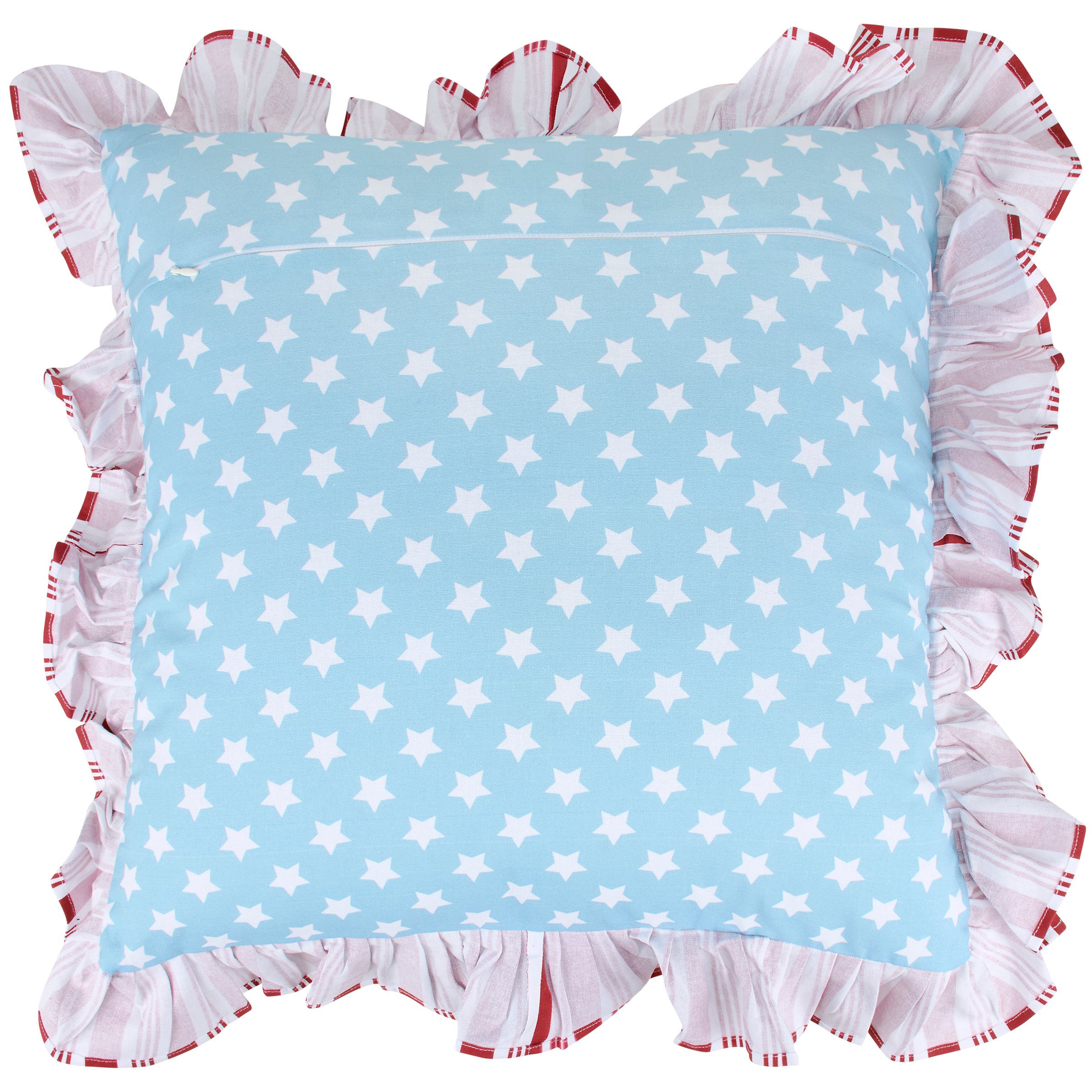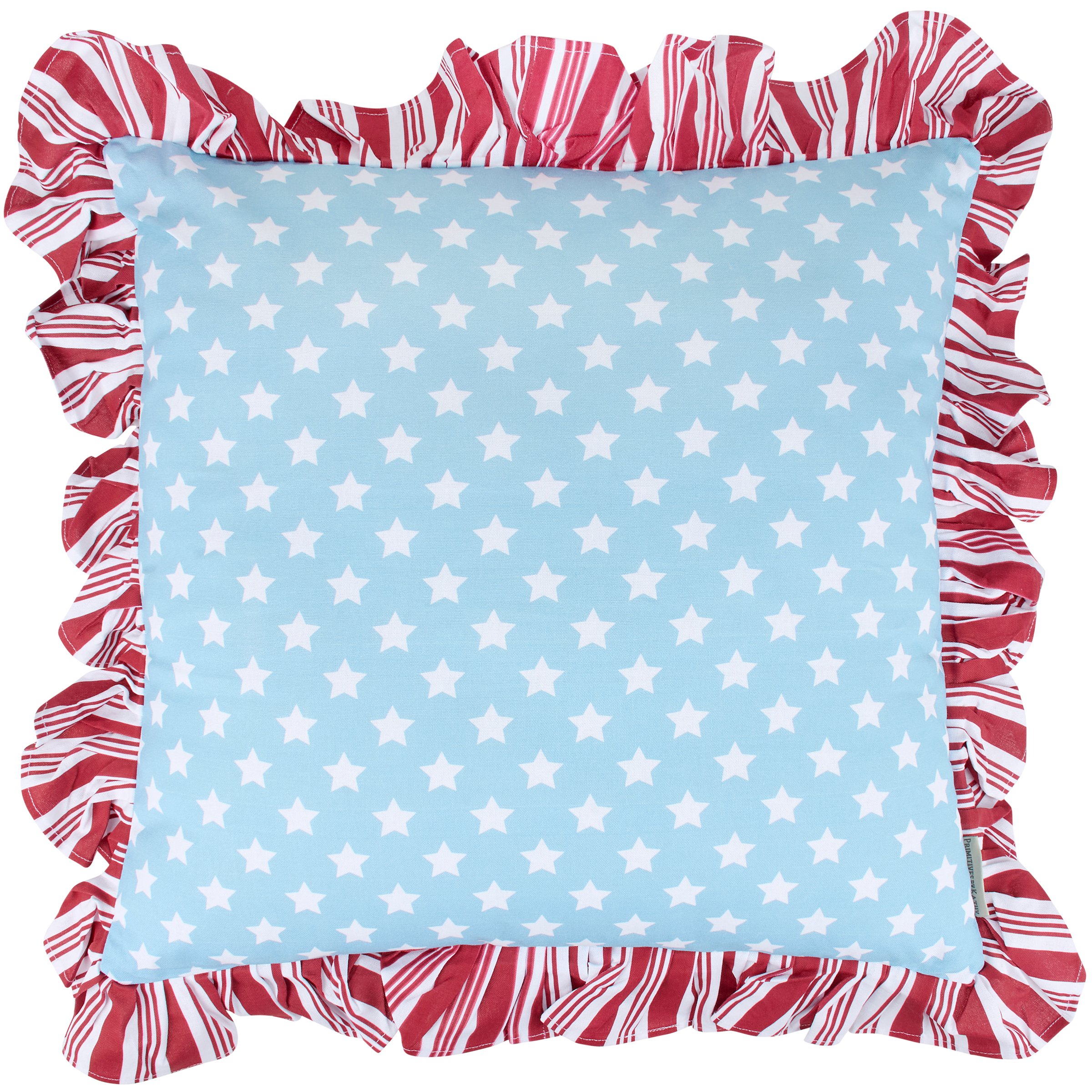A decorative pillow from our Patriotic Collection displaying an American flag inspired design featuring a pattern of white stars on a faded blue background and a ruffle trim made with red and white stripe fabric. Our Faded Glory pillow features a zipper to easily remove and clean the machine-washable pillow cover. Patriotic pillow contains polyester filling and is shipped vacuum-sealed for protection and storage. A rustic home accent perfect for 4th of July and Memorial Day decorating or celebrating stars and stripes all year round.