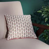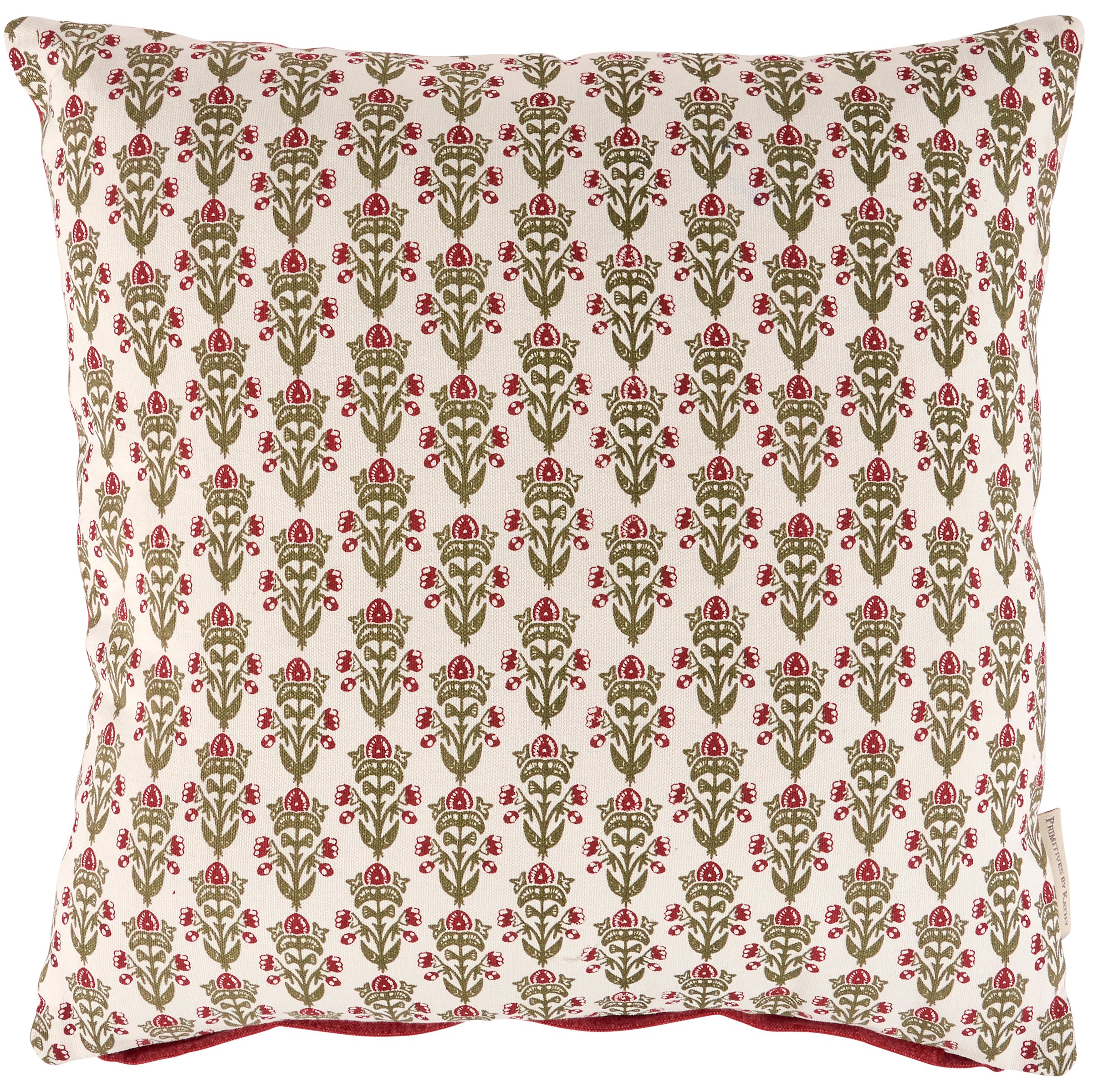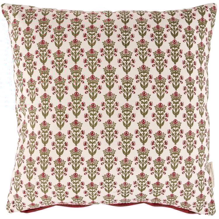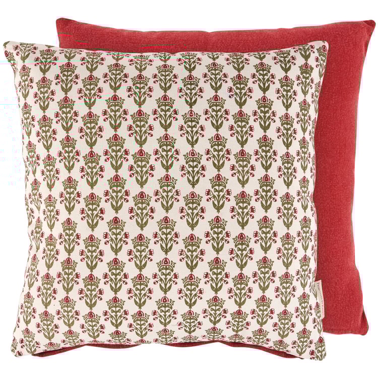 A cotton pillow from our Christmas Collection displaying a vintage floral block print design that coordinates well with cabin decor. Our Floral Block Print pillow features red cotton on the back as well as a zipper to easily remove and clean machine-washable pillow cover. Seasonal pillow contains polyester filling and is shipped vacuum-sealed for protection and storage. A cabin-themed Christmas home accent perfect for adding vintage seasonal style to any room.