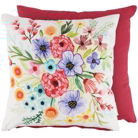 A cotton pillow from our Inspiration & Blooms Collection displaying abstract hand illustrated florals with embroidered details and knit flower accents for added dimension. Floral pillow features coordinating dark pink color cotton on the back. Pillow includes a zipper to easily remove and clean machine-washable pillow cover. Our Floral Bouquet pillow contains polyester filling and is shipped vacuum-sealed for protection and storage. A floral-themed home accent perfect for adding style to any room.