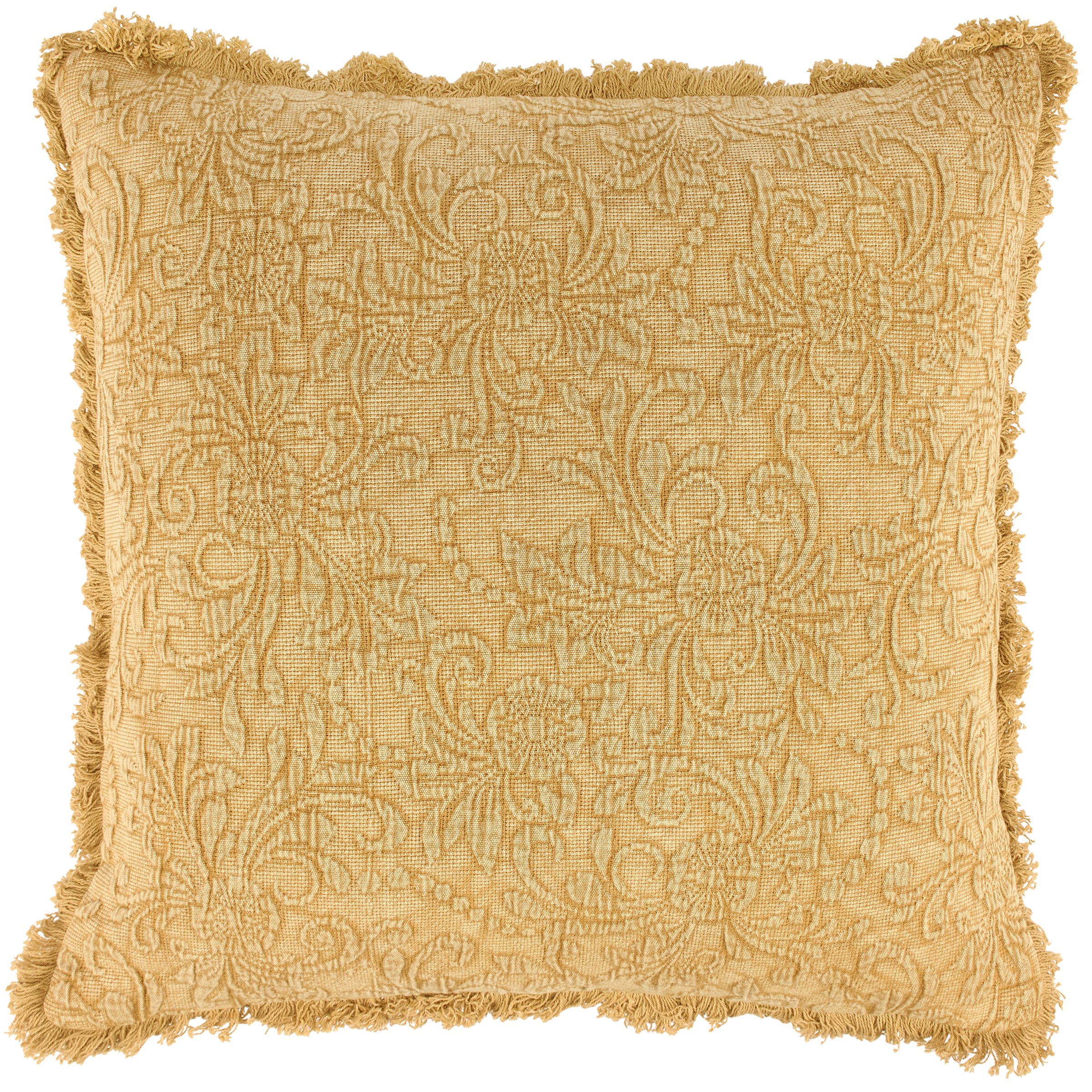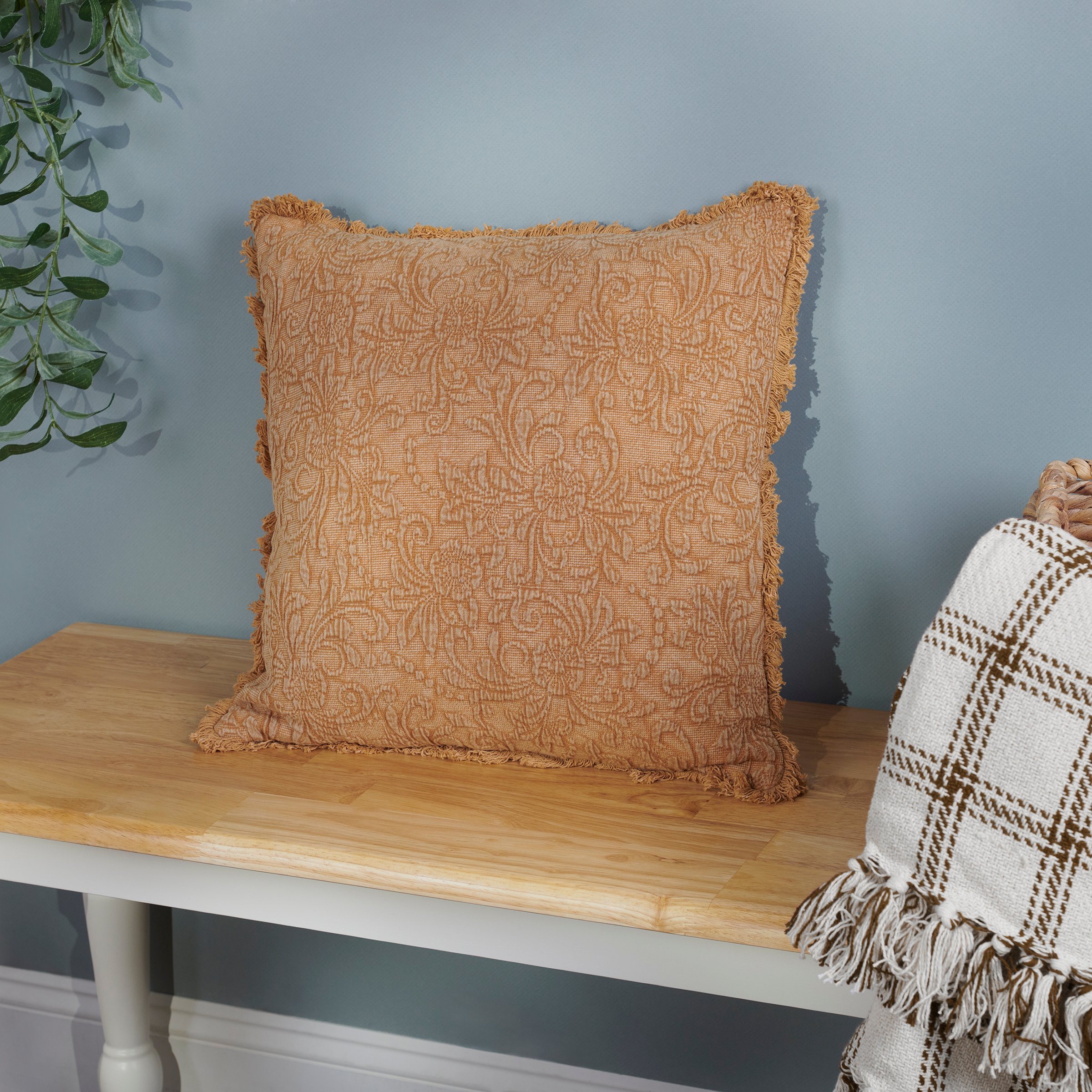 A decorative cotton throw pillow from our Home Collection displaying an embossed floral pattern on textured fabric in a vintage rust orange color palette with a coordinating fringe trim and stonewashed orange cotton on the back. Our Floral Rust pillow includes a zipper to easily remove and clean machine-washable pillow cover. Floral pillow contains polyester filling and is shipped vacuum-sealed for protection and storage. An everyday home accent that adds vintage style to any room.