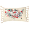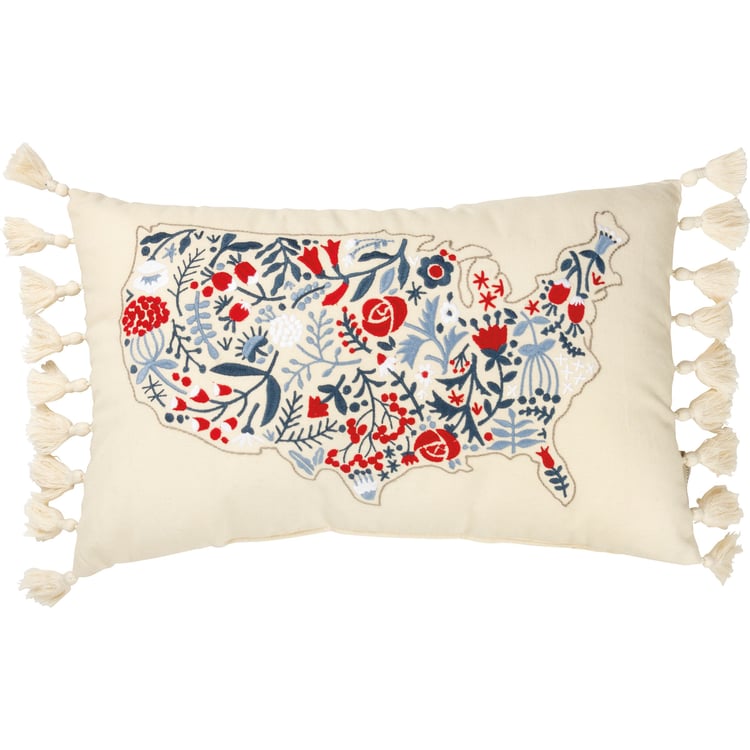 A cotton and linen pillow from our Patriotic Collection featuring a floral embroidered USA map design with tassel trim details. Polyester filling. The floral USA map pillow comes shipped vacuum-sealed for protection and storage.