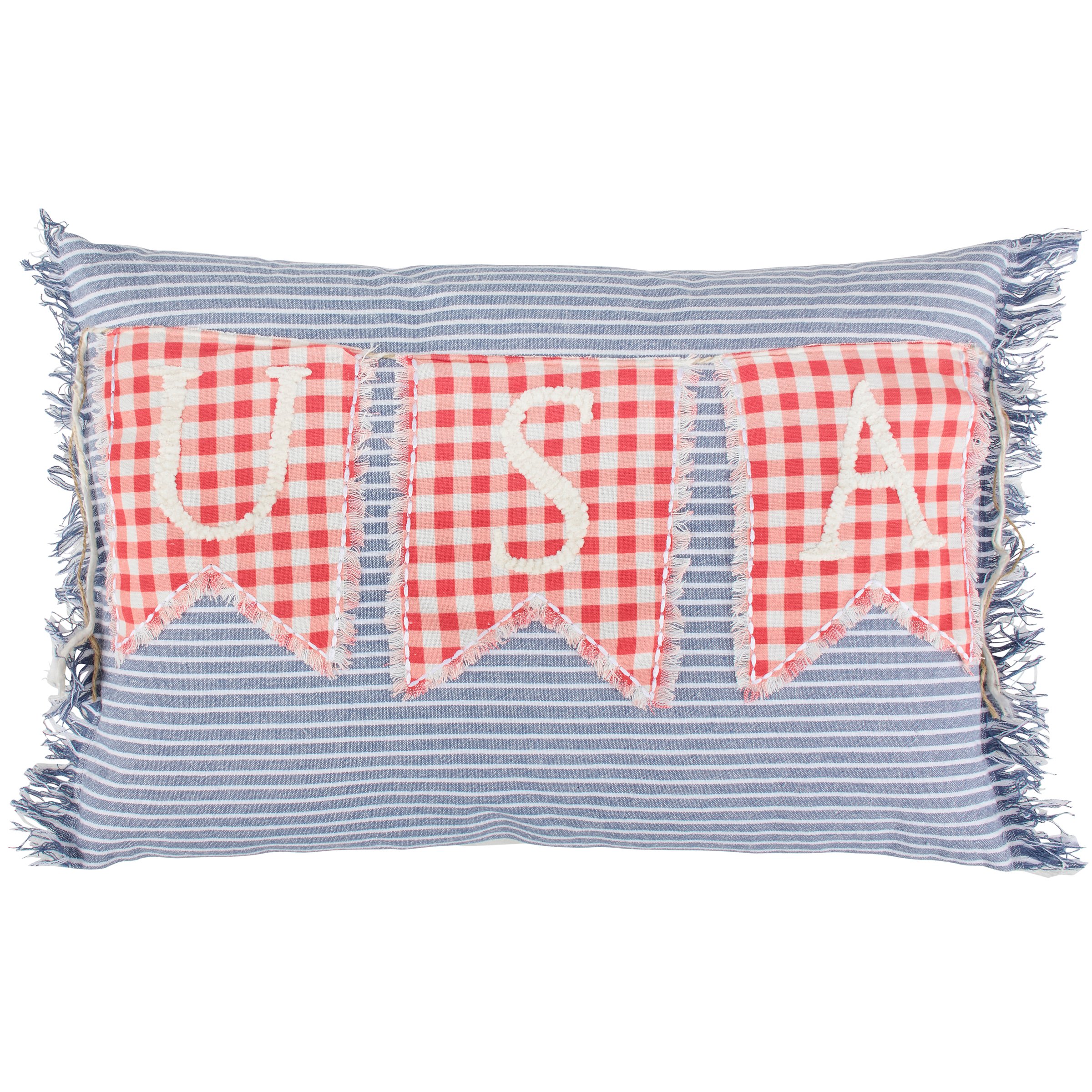 A decorative pillow from our Patriotic Collection displaying an American flag inspired design in a folk art style featuring red gingham pattern pennants stitched to a blue stripe pillow and a "USA" sentiment with each letter embroidered on a different pennant. Our Folk USA pillow features a zipper to easily remove and clean the machine-washable pillow cover. Patriotic pillow contains polyester filling and is shipped vacuum-sealed for protection and storage. A rustic home accent perfect for 4th of July and Memorial Day decorating or celebrating stars and stripes all year round.