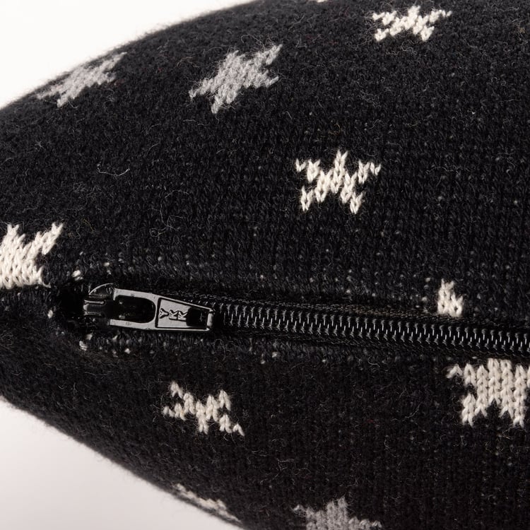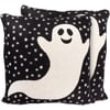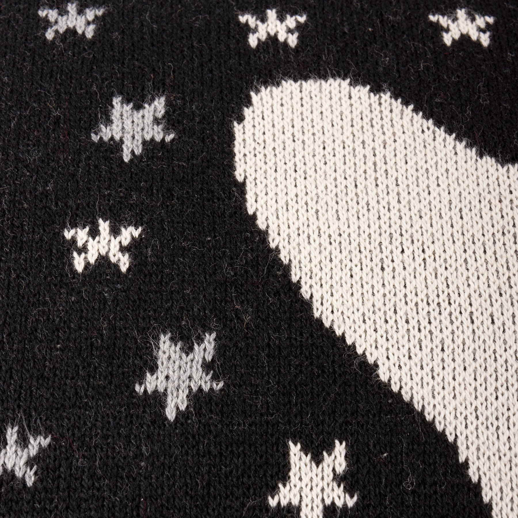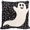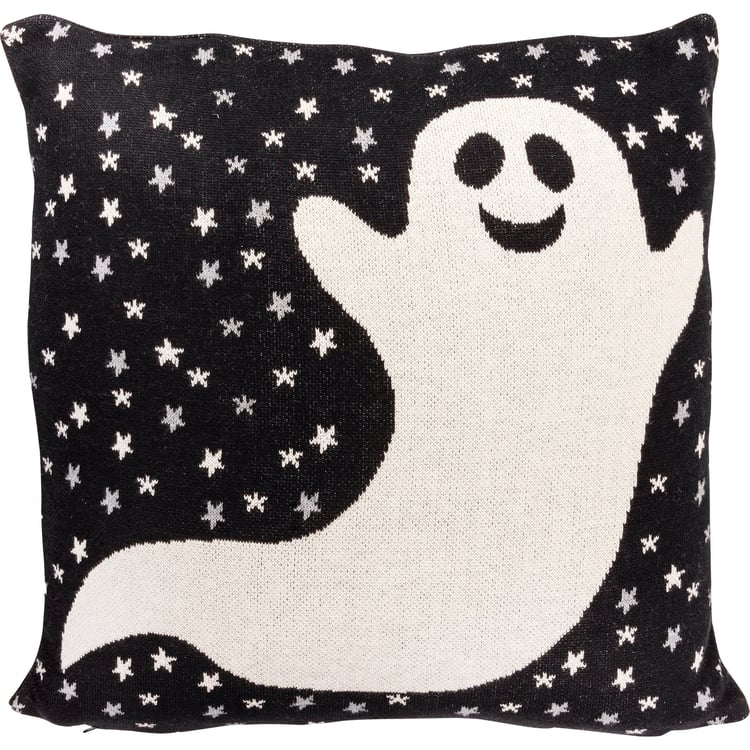 A black cotton pillow featuring a machine-knitted ghost and white stars design. Polyester filling. Includes a zipper to easily remove and clean cover. Our Ghost pillow is shipped vacuum-sealed for protection and storage.