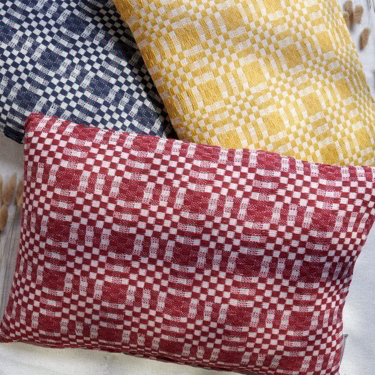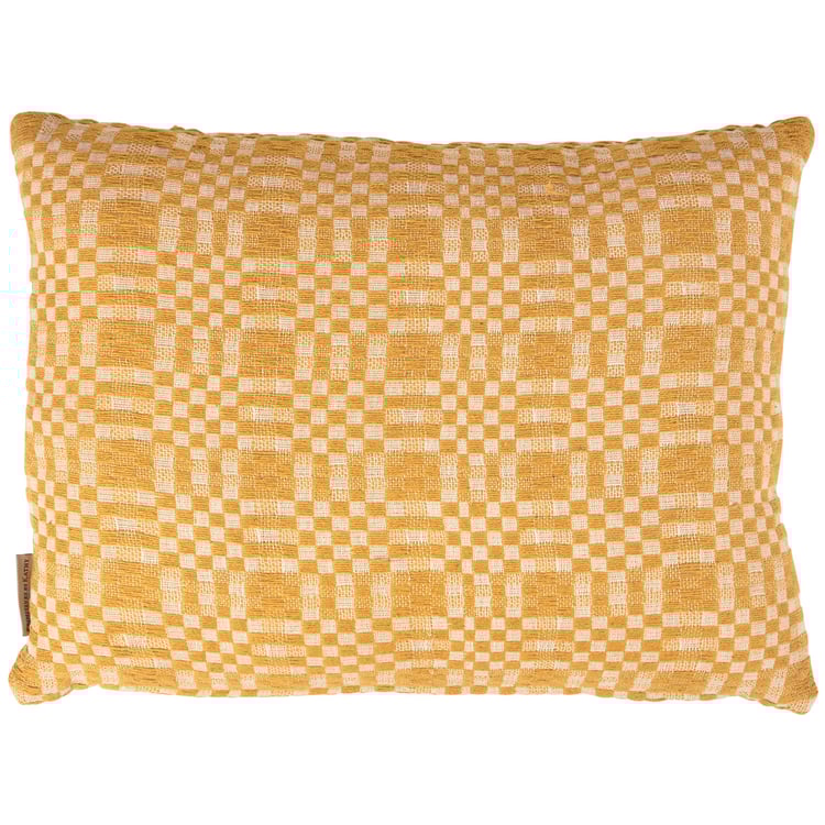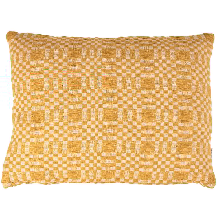 A decorative cotton throw pillow from our Primitive Collection displaying a double-sided design of checkered patterns in gold and cream. Our Gold Check pillow includes a zipper to easily remove and clean machine-washable pillow cover. Pillow contains polyester filling and is shipped vacuum-sealed for protection and storage. A rustic everyday home accent that adds style to any room.