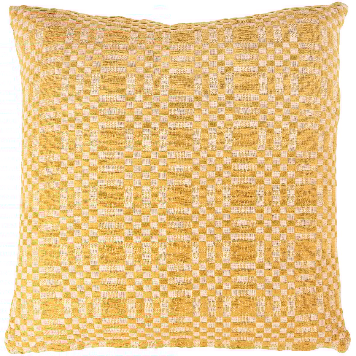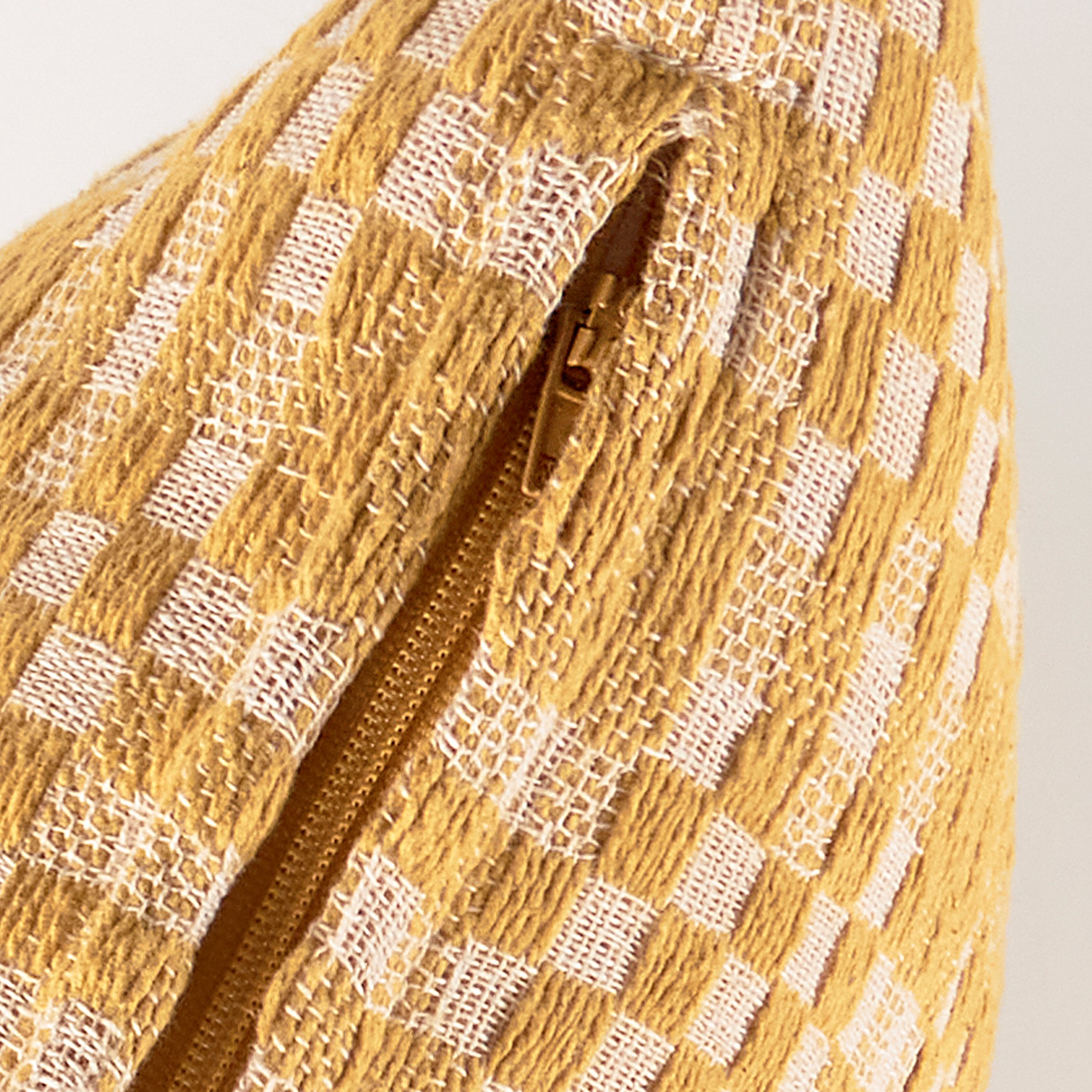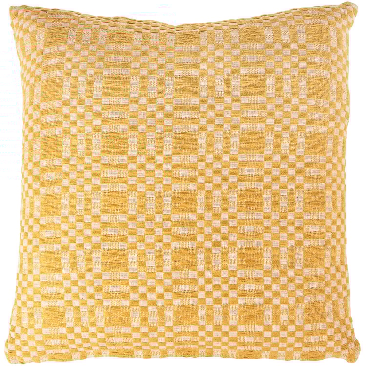 A decorative cotton throw pillow from our Primitive Collection displaying a double-sided design of checkered patterns in gold and cream. Our Gold Checkered pillow includes a zipper to easily remove and clean machine-washable pillow cover. Pillow contains polyester filling and is shipped vacuum-sealed for protection and storage. A rustic everyday home accent that adds style to any room.