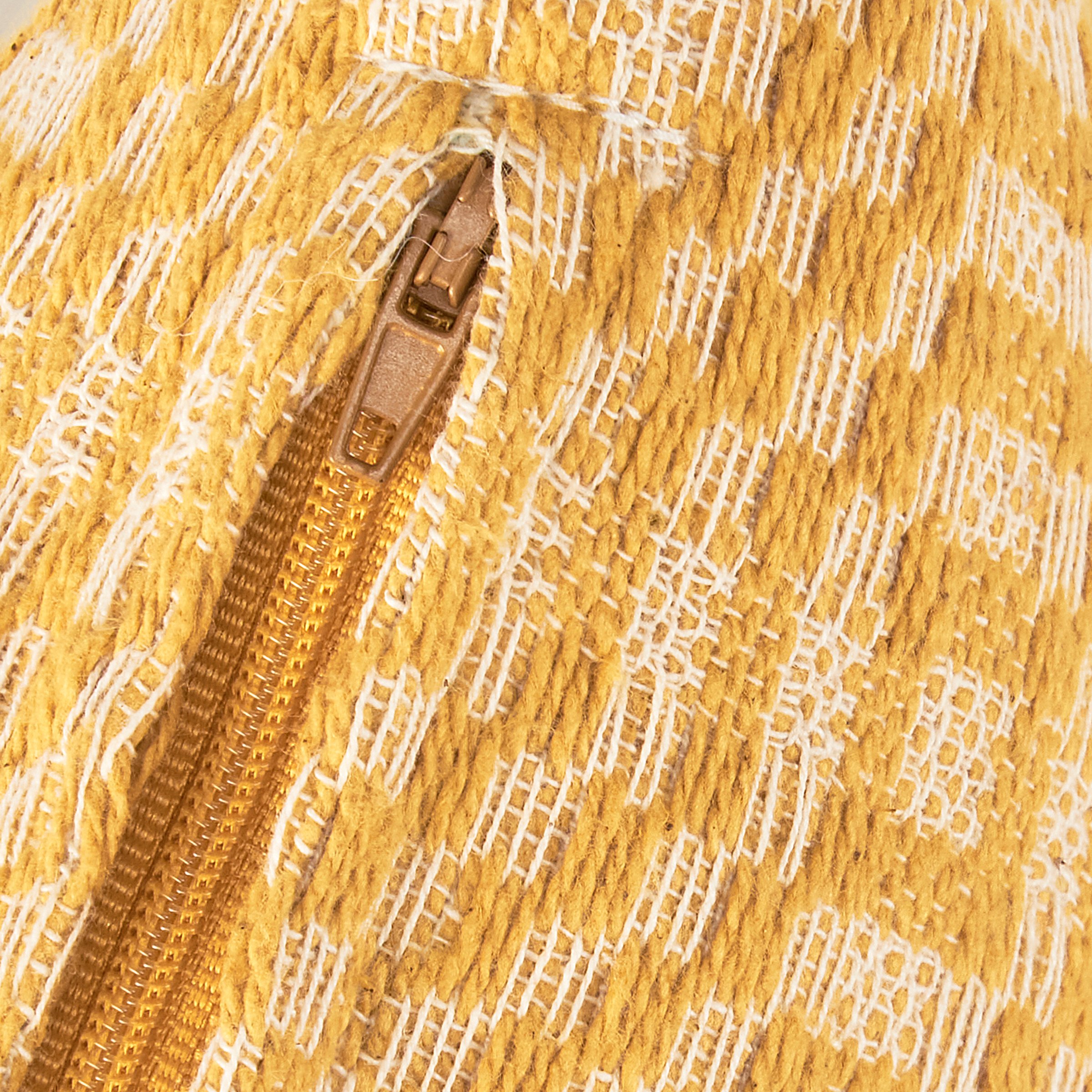 A decorative cotton throw pillow from our Primitive Collection displaying a double-sided design of diamond patterns in gold and cream. Our Gold Diamonds pillow includes a zipper to easily remove and clean machine-washable pillow cover. Pillow contains polyester filling and is shipped vacuum-sealed for protection and storage. A rustic everyday home accent that adds style to any room.
