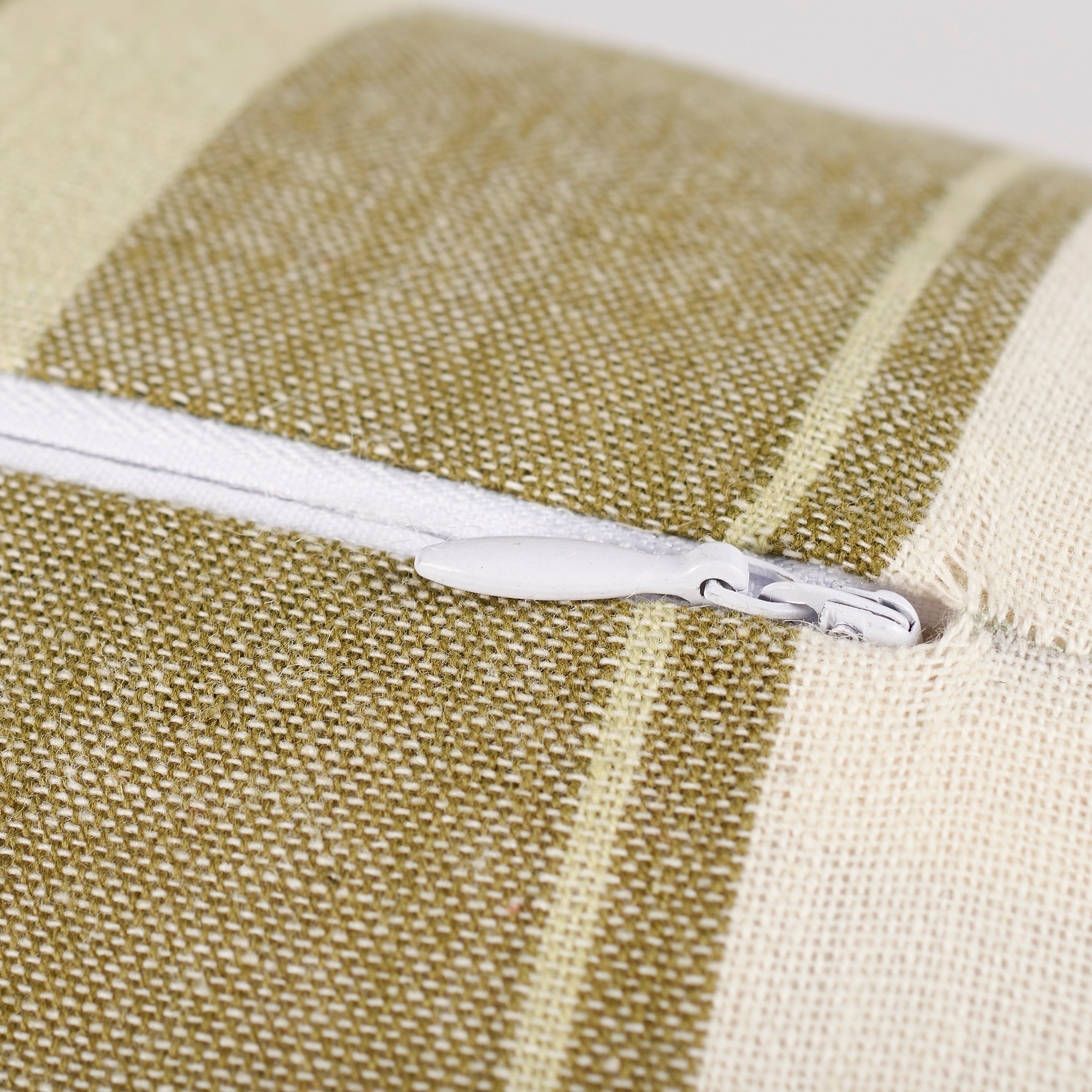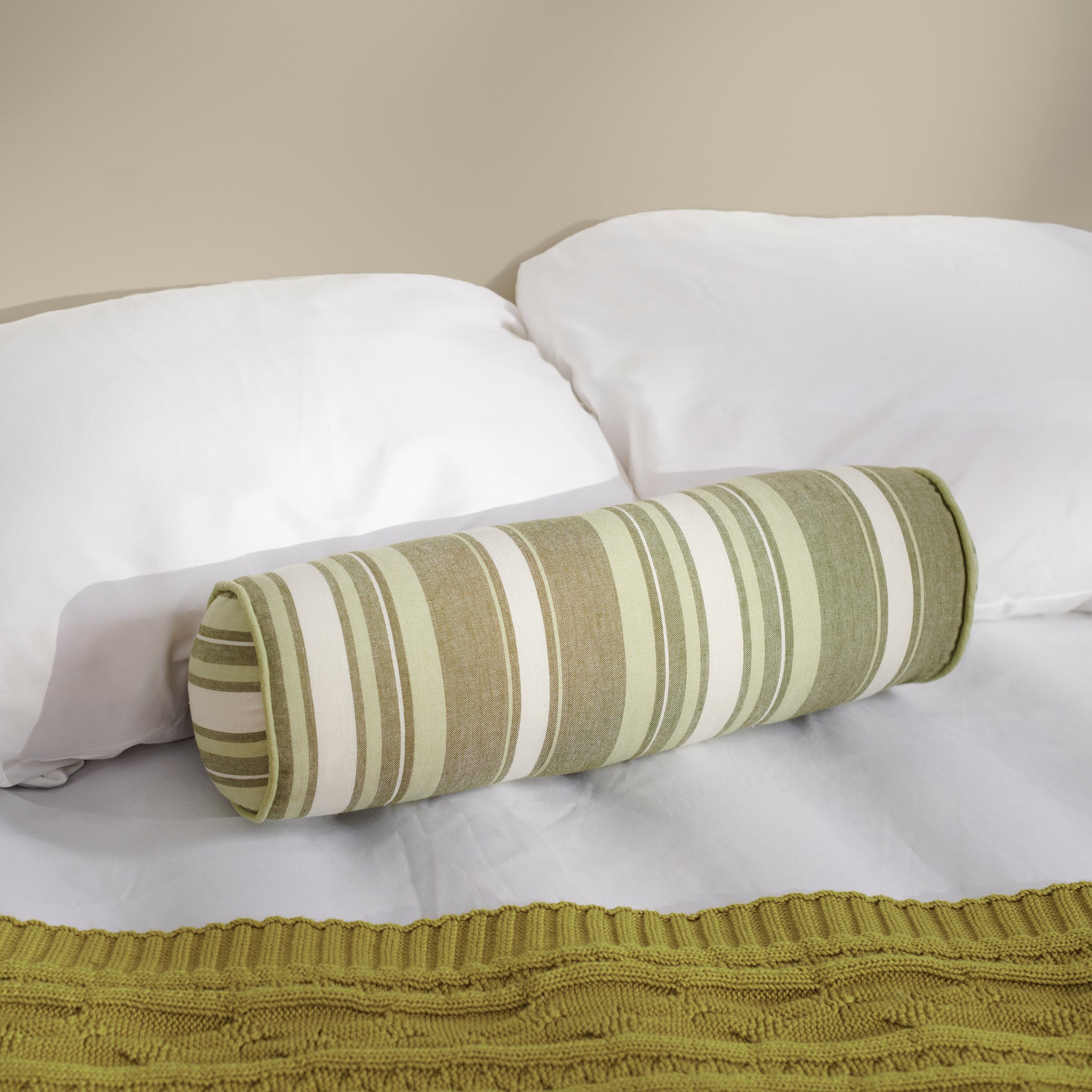 A cotton pillow from our Vintage Collection displaying a bolster shape with a vintage stripe pattern in a green color palette and coordinating green piping on the edges. Vintage pillow includes a zipper to easily remove and clean machine-washable pillow cover. Our Green Stripe pillow contains polyester filling for a sturdy design. An everyday home accent perfect for adding vintage style to any room.