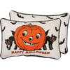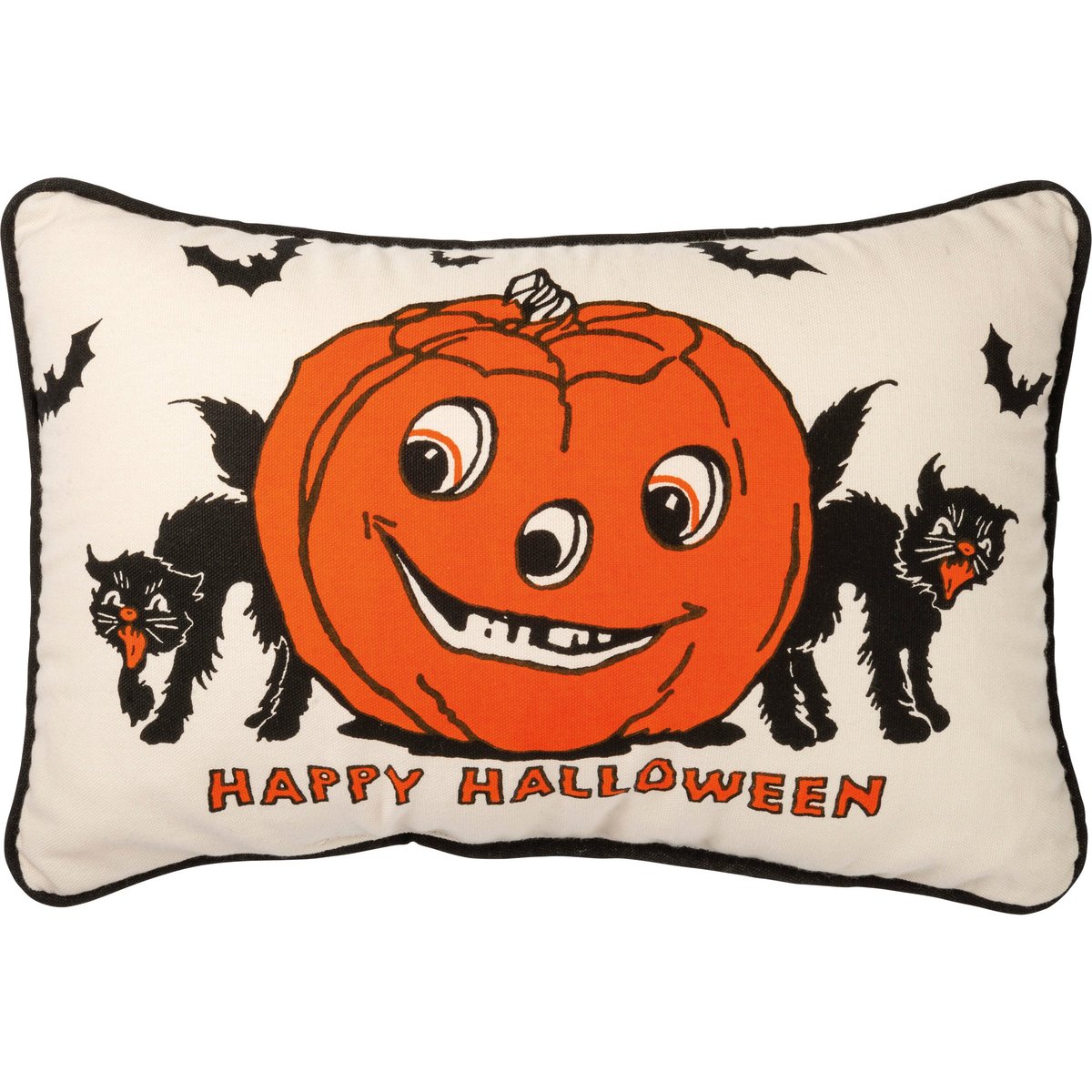 A vintage-inspired cotton pillow from our Halloween Collection featuring a "Happy Halloween" front sentiment with Jack-o'lantern and black cat designs, bat print throughout, and cotton piped trim. Shipped vacuum sealed for protection and storage. Our Vintage Happy Halloween pillow includes a zipper to easily remove and clean cover.