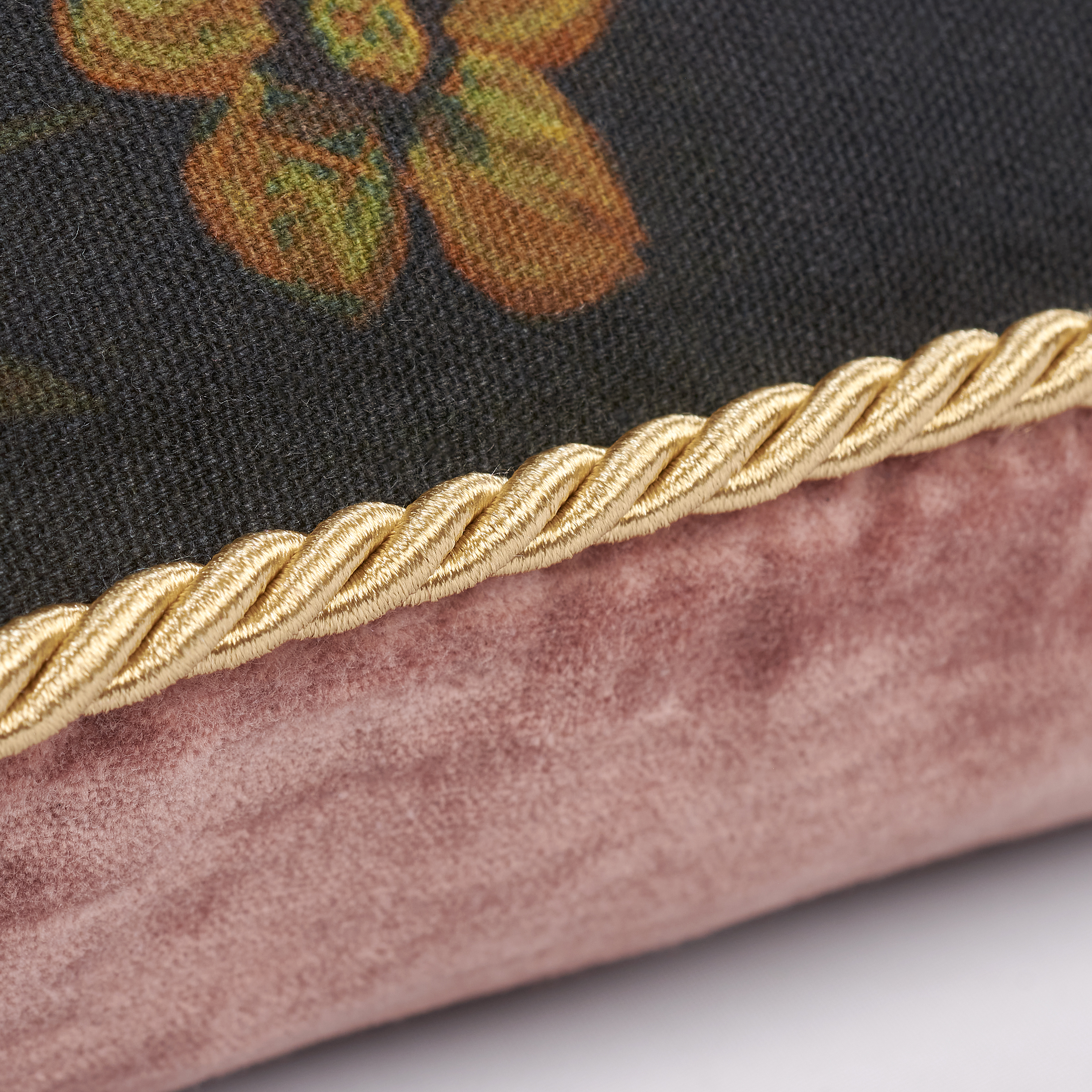 A cotton pillow from our Moody Collection displaying a hidden garden inspired design in a deep color palette replicated from original art hand painted in a unique watercolor style. Pillow features coordinating pink velvet on back with rope trim and an embroidered diamond on the front using gold metallic thread. Our Hidden Garden pillow includes a zipper to easily remove and clean machine-washable pillow cover. Garden pillow contains polyester filling and is shipped vacuum-sealed for protection and storage. A nature-themed home accent perfect for adding moody style to any room.