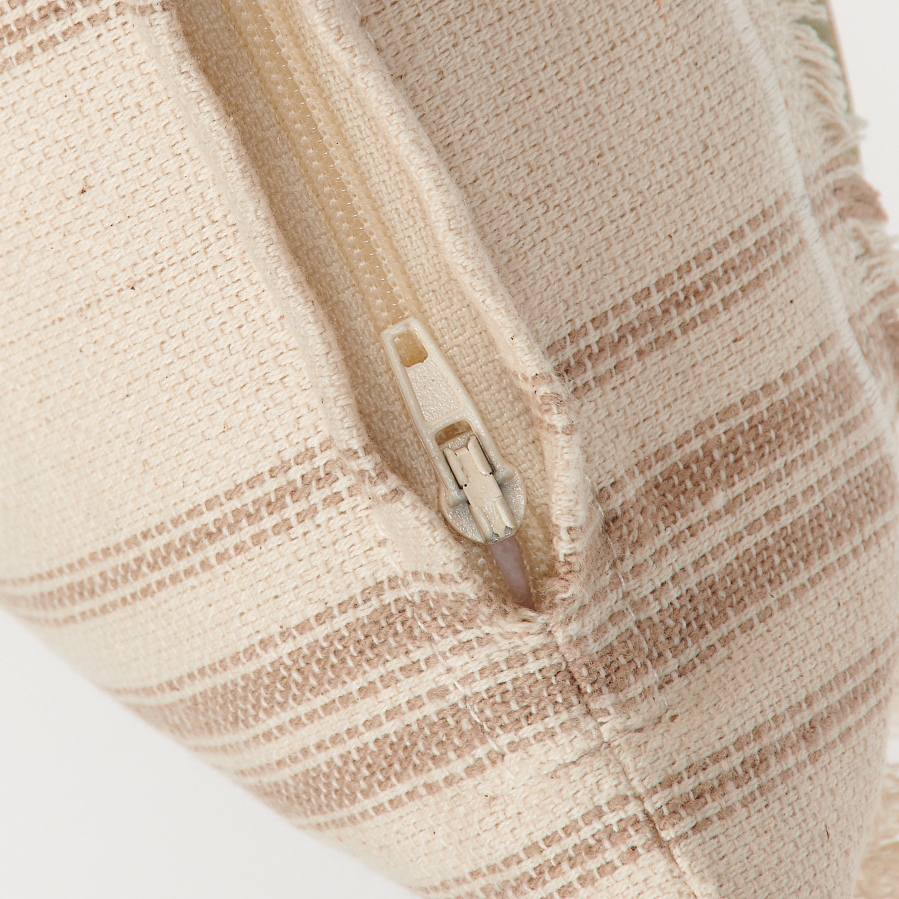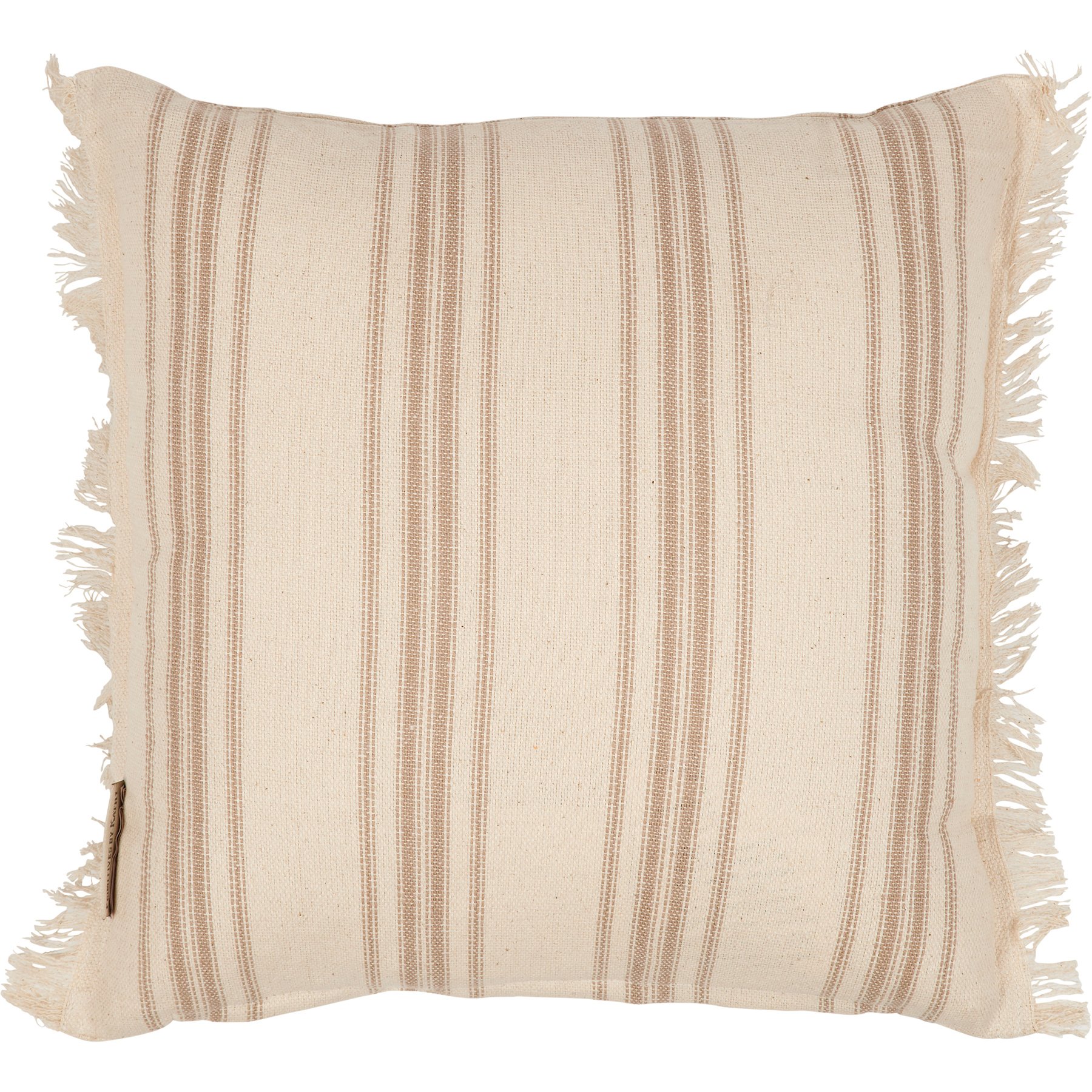 A cream cotton pillow from our Farmhouse Collection featuring a stitched art panel with frayed border and woven brown stripe designs throughout. Design displays a highland cow in a field replicated from original artwork painted onto burlap canvas, giving the art a unique depth and texture. Pillow also features frayed trim along sides and a zipper to easily remove and clean cover. Our Highland Cow pillow contains polyester filling and is shipped vacuum-sealed for protection and storage. A rustic everyday home accent perfect for any room.