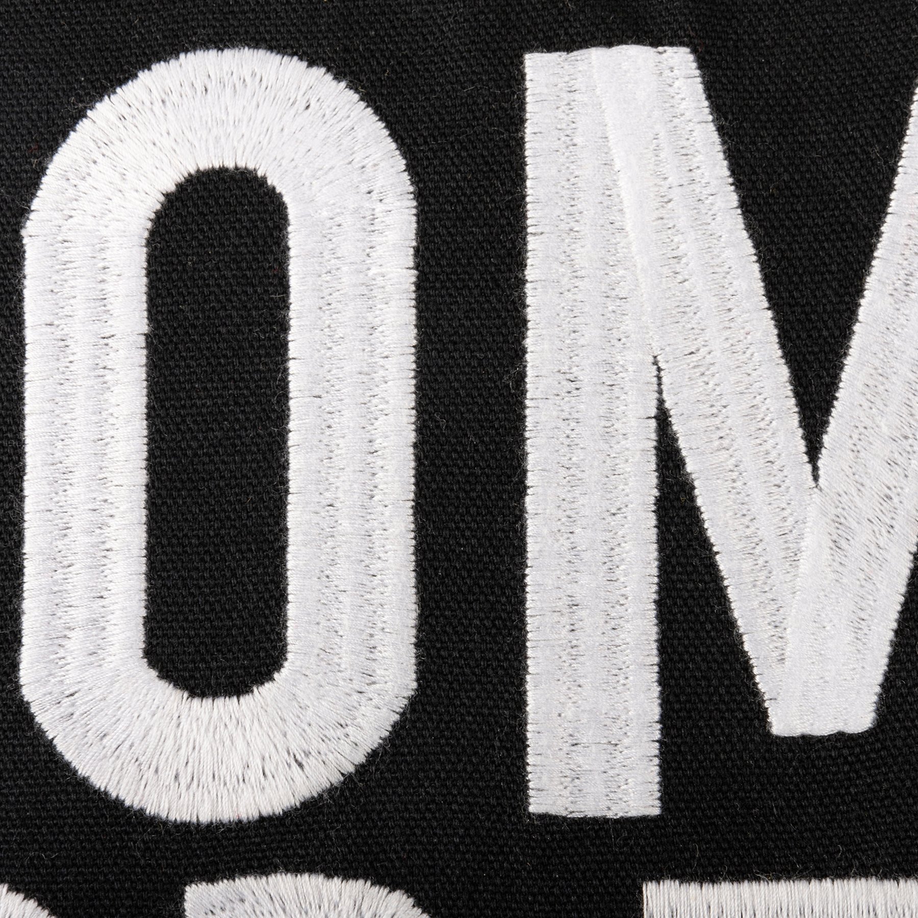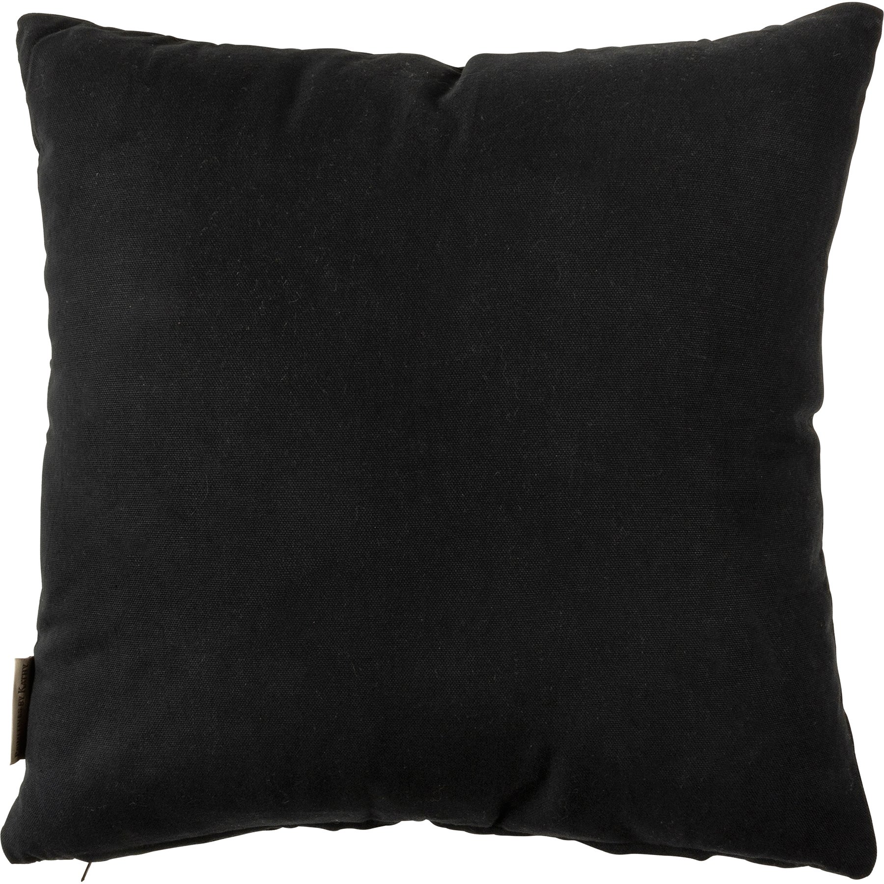 A black cotton pillow featuring an embroidered "Home For The Holidays" sentiment. Polyester filling. Shipped vacuum-sealed for protection and storage. Includes a zipper to easily remove and clean cover.