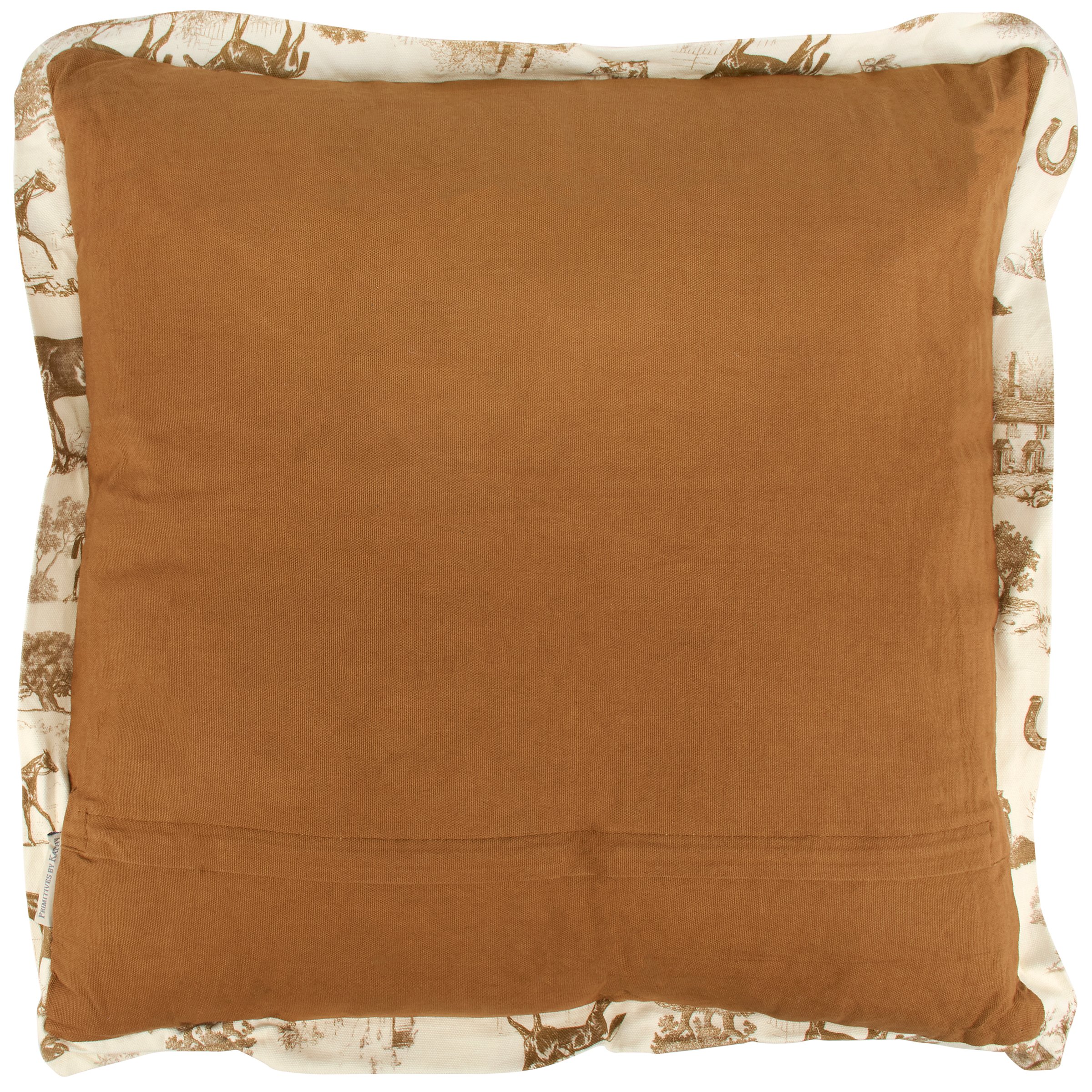 A decorative pillow from our Preppy Heritage Collection displaying a toile pattern of horse inspired designs inspired by vintage equestrian home décor with flange edging and coordinating brown color on the back. Our Horse Toile pillow includes a zipper to easily remove and clean machine-washable pillow cover. Equestrian pillow contains polyester filling and is shipped vacuum-sealed for protection and storage. A horse themed home accent perfect for adding vintage style to any room.