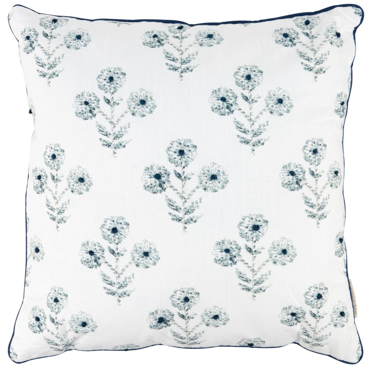A cotton pillow from our Indigo Collection Collection displaying a chinoiserie inspired pattern of blue florals with embroidered accents for added dimension. Floral pillow features coordinating white color on the back and blue piping along the edge. Indigo pillow includes a zipper to easily remove and clean machine-washable pillow cover. Our Indigo Floral pillow contains polyester filling and is shipped vacuum-sealed for protection and storage. A floral-themed everyday home accent perfect for adding style to any room.