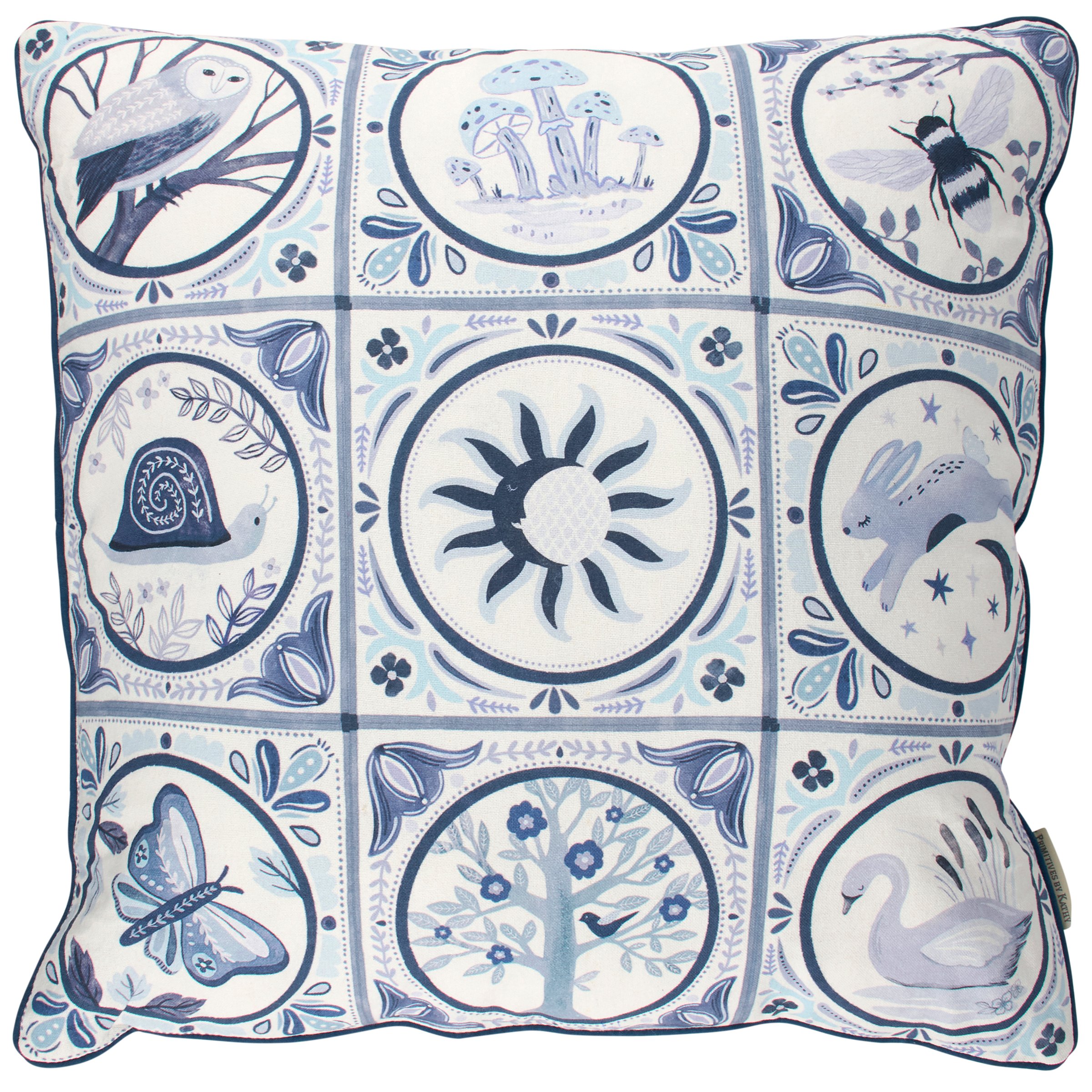 A decorative pillow from our Home Collection displaying tile inspired designs featuring various nature scenes in a calming indigo color palette with coordinating piping trim and blue color on the back. Each tile design is replicated from original hand illustrated art. Our Indigo Tile pillow includes a zipper to easily remove and clean machine-washable pillow cover. Indigo pillow contains polyester filling and is shipped vacuum-sealed for protection and storage. A nature themed home accent perfect for adding indigo style to any room.