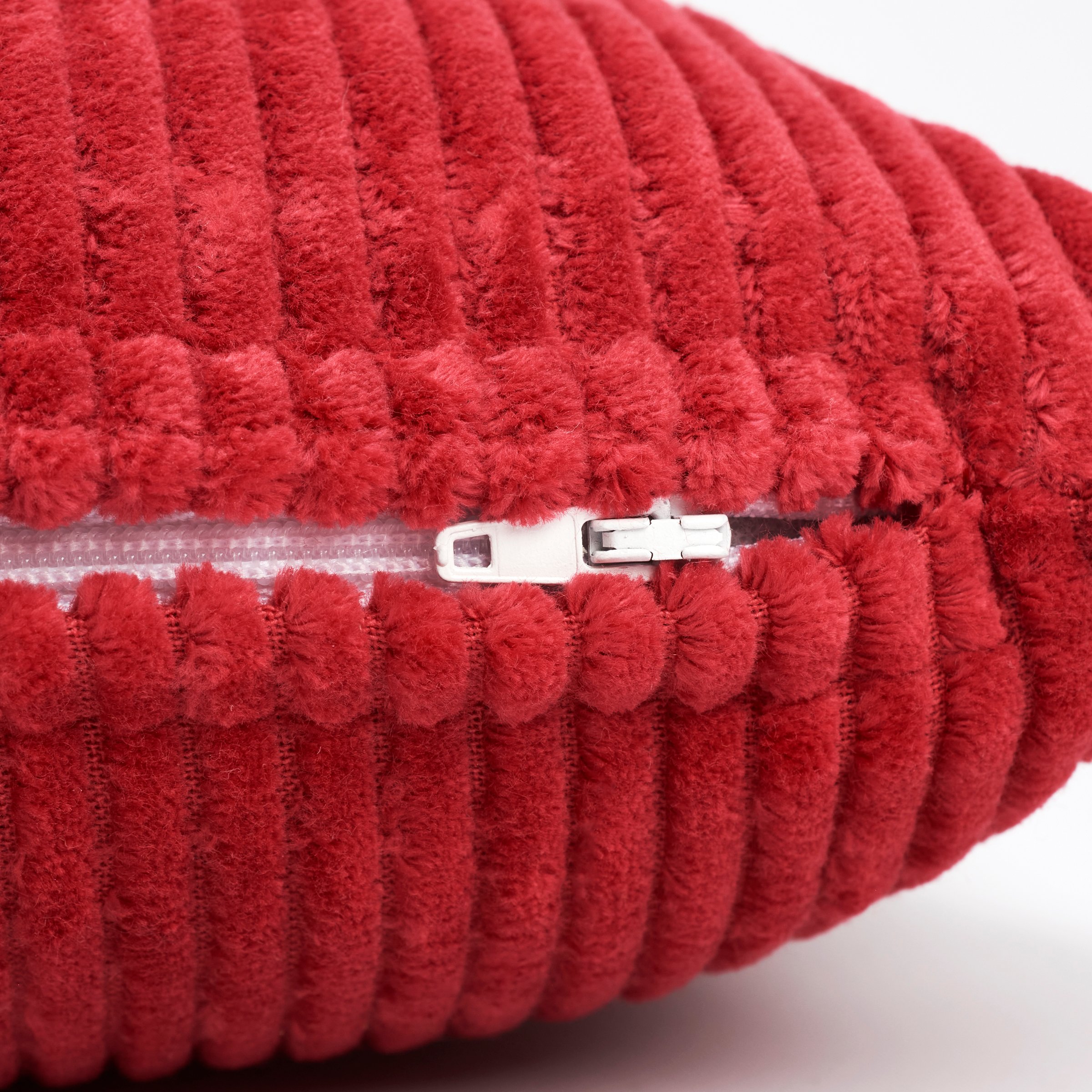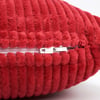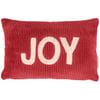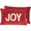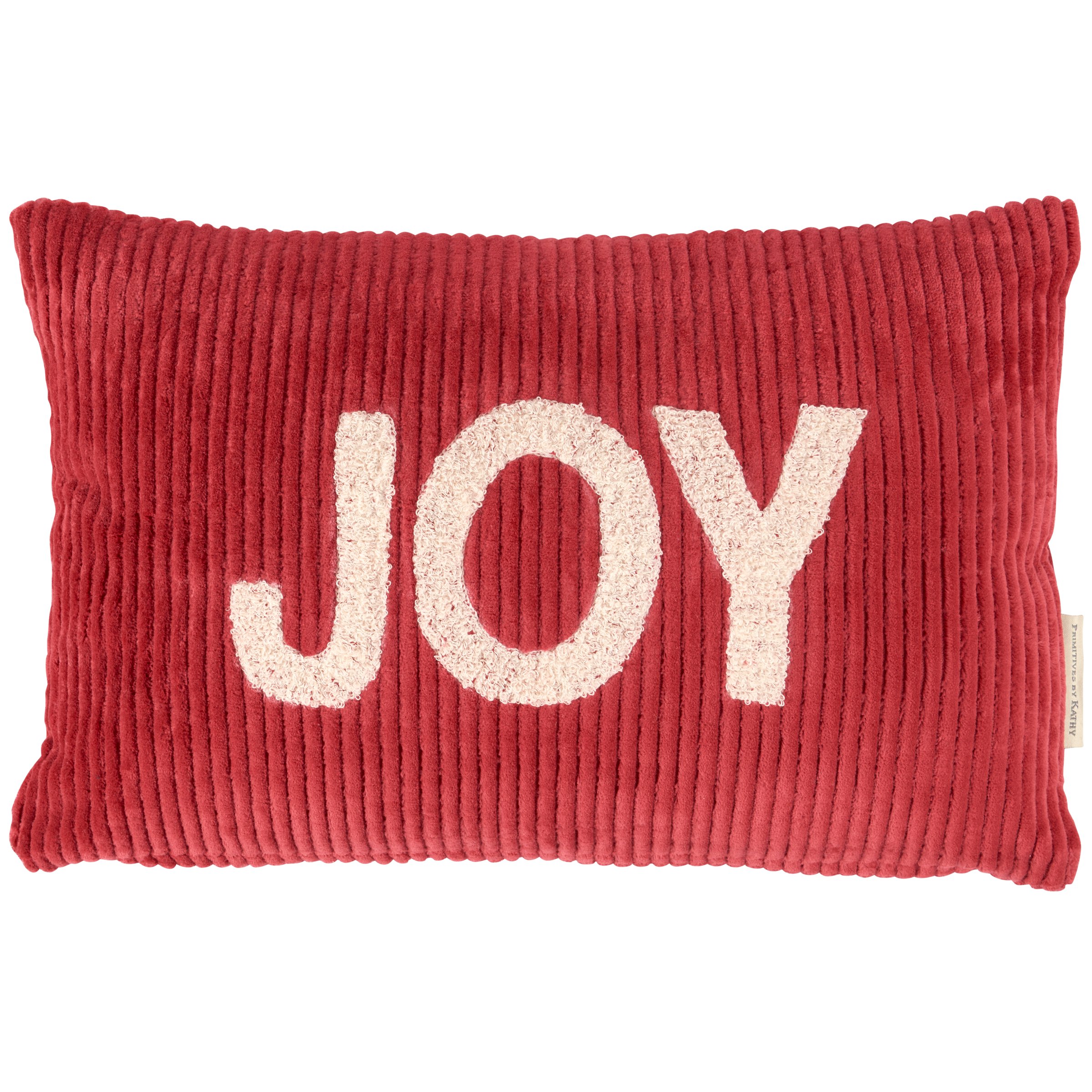 A red corduroy pillow from our Christmas Collection displaying a seasonal sentiment that reads "Joy" featuring a raised cream cotton texture. Our Joy pillow features a zipper to easily remove and clean machine-washable pillow cover. Seasonal pillow contains polyester filling and is shipped vacuum-sealed for protection and storage. A Christmas home accent perfect for adding seasonal style to any room.