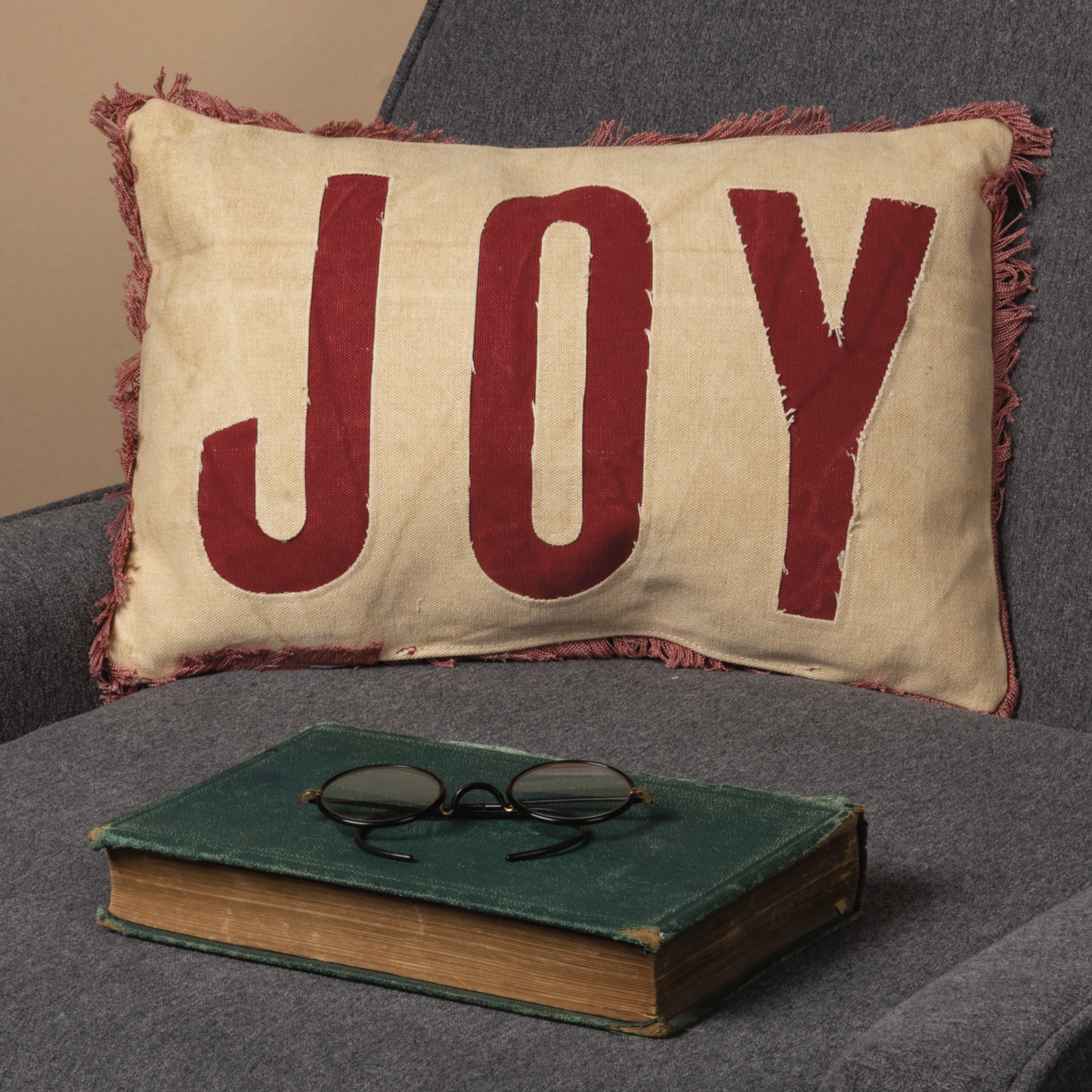 A canvas pillow from our Christmas Collection features an appliqued "Joy" sentiment, frayed accents, and fringe trim that complements well with existing decor. Polyester filling. Includes a zipper to easily remove and clean cover. The Red Joy pillow is shipped vacuum-sealed for protection and storage.