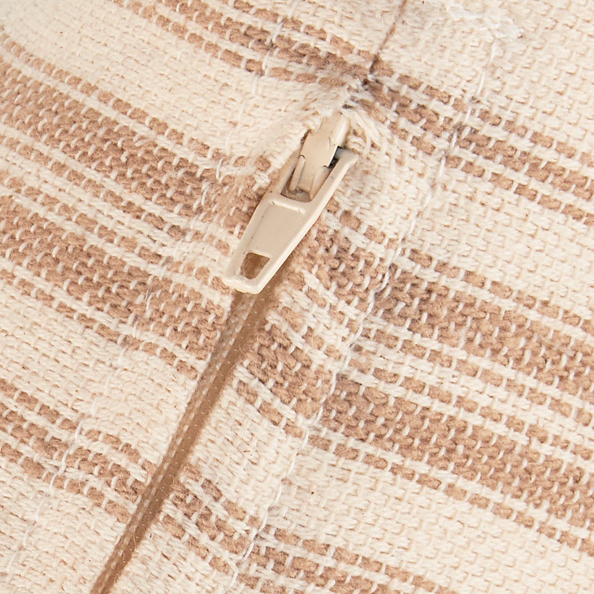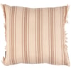 A cream cotton throw pillow from our Farmhouse Collection featuring a stitched art panel with frayed border and woven brown stripe designs throughout. Art panel displays a kune kune pig in a field replicated from original artwork painted onto burlap canvas, giving the art a unique depth and texture. Our Kune Kune Pig pillow also features frayed trim along sides with a zipper to easily remove and clean machine-washable pillow cover. Contains polyester filling and is shipped vacuum-sealed for protection and storage. A rustic everyday home accent perfect for adding style to any room.